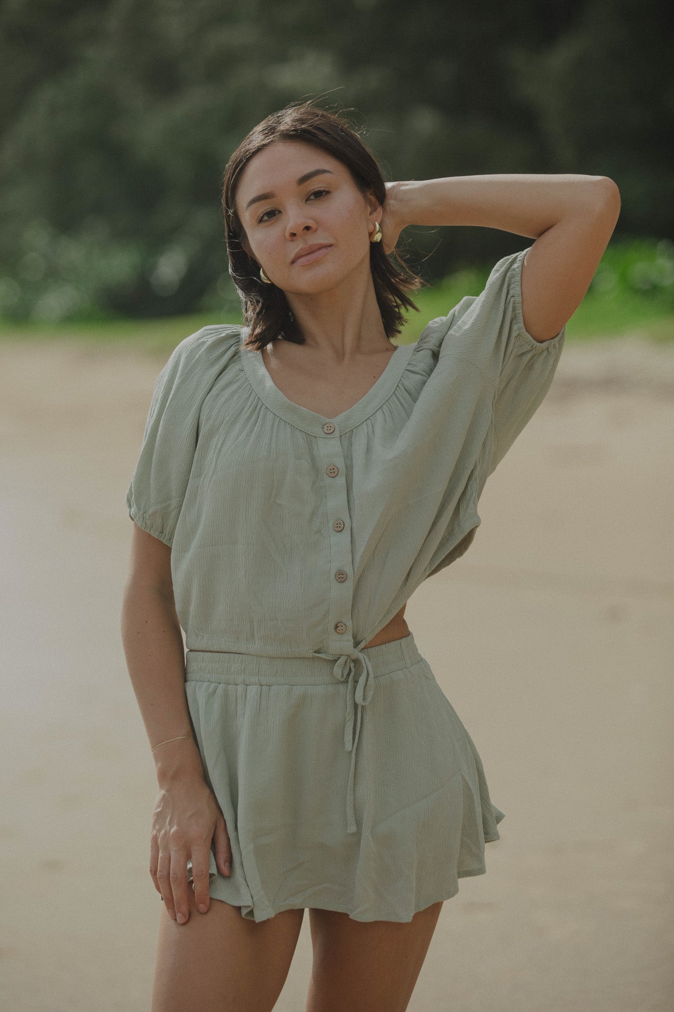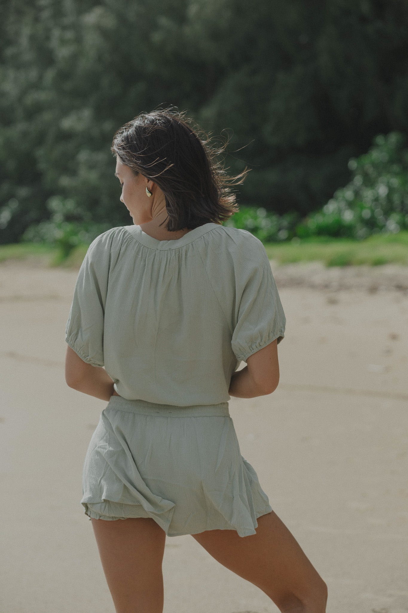 Sage colored flowy mini skort with an elastic waist. Perfect to wear summer days!