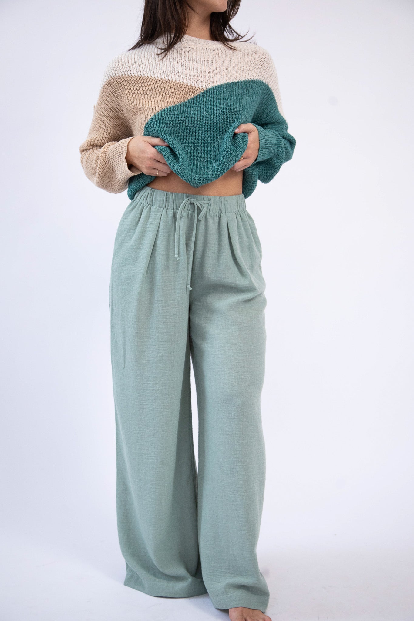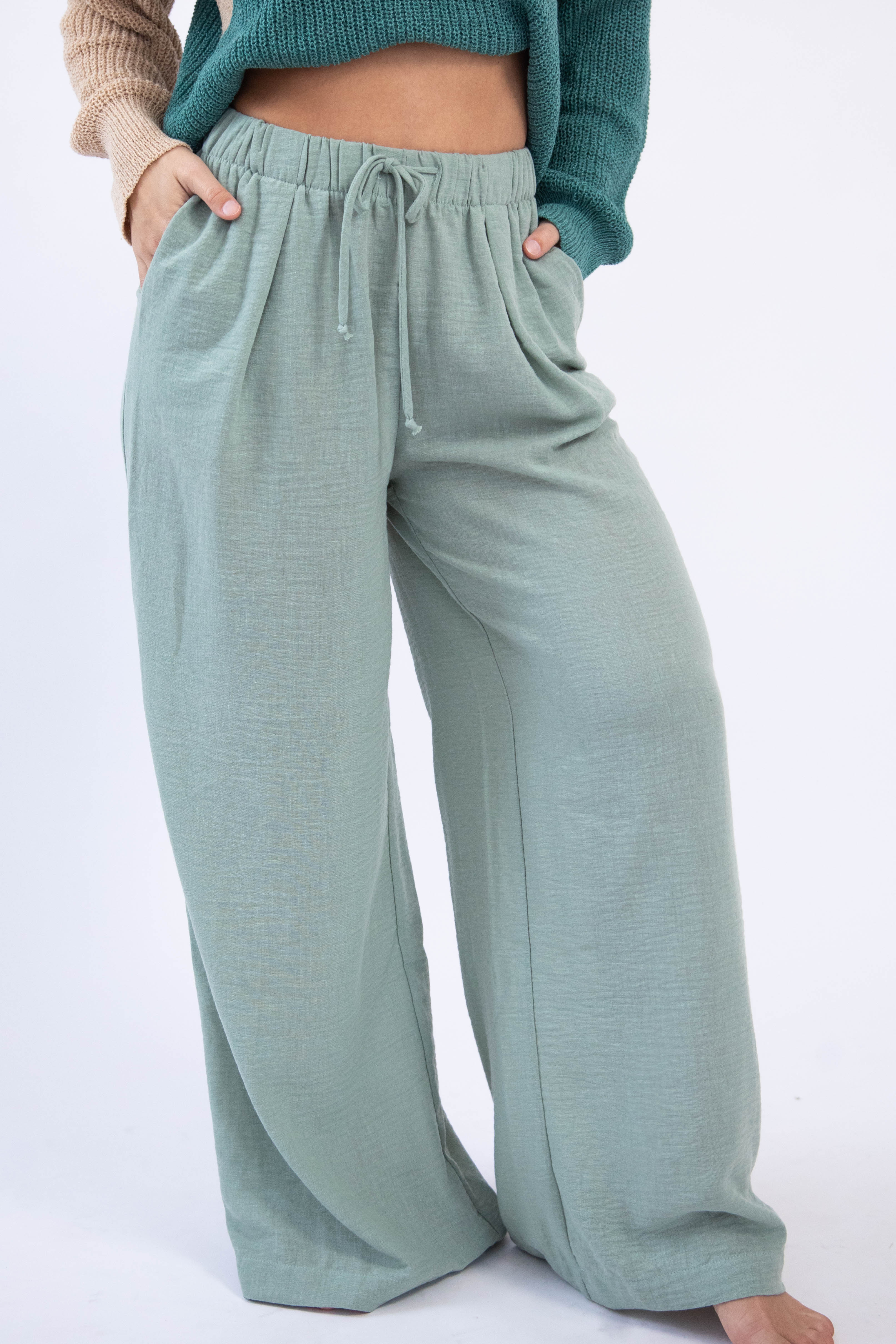 Sage-colored green wide leg pants, featuring a tie waist. Perfect to pair with any top!
