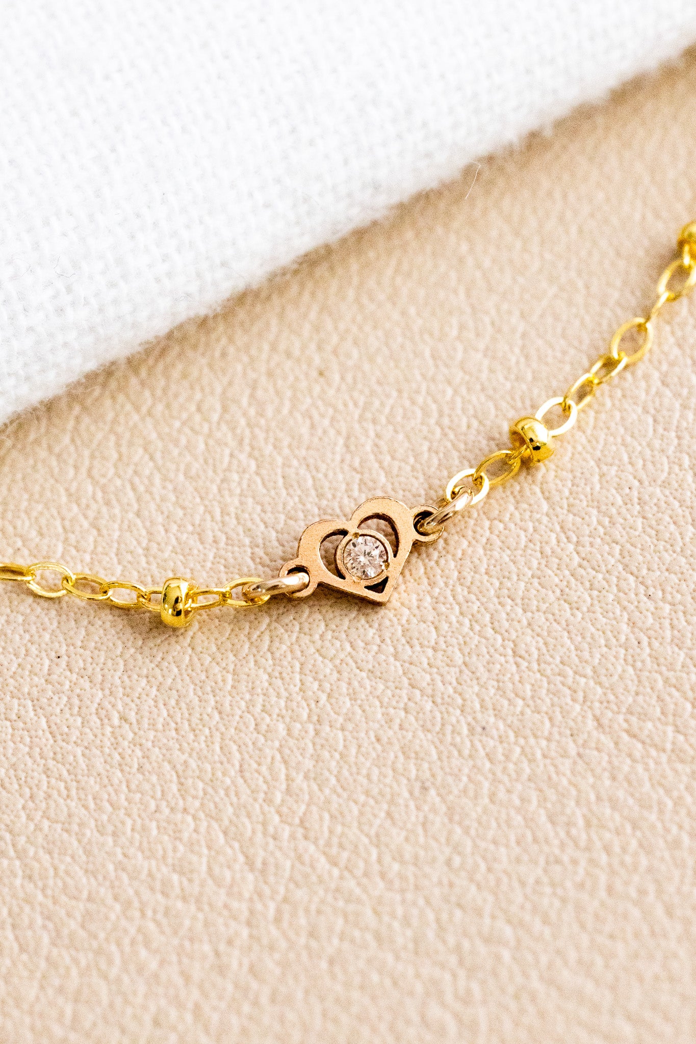 - 14k gold filled dainty satellite chain bracelet with a 7mm cubic zirconia heart connector