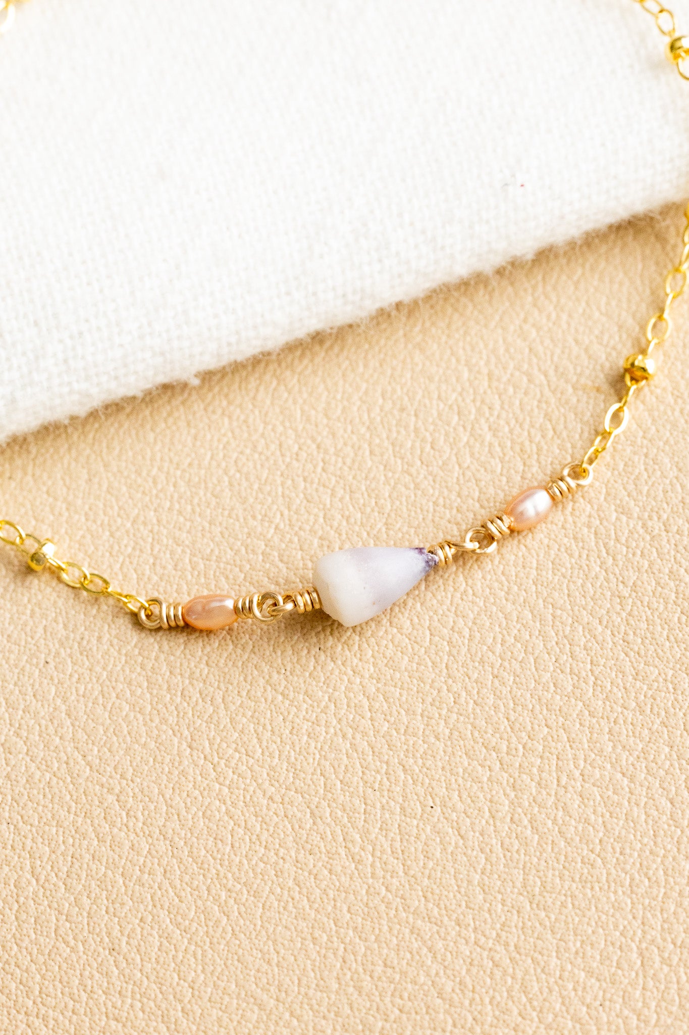- 14k gold filled dainty satellite chain bracelet with a 7mm dwarf cone shell in between two 2mm mini light pink rice/oval shaped freshwater pearls