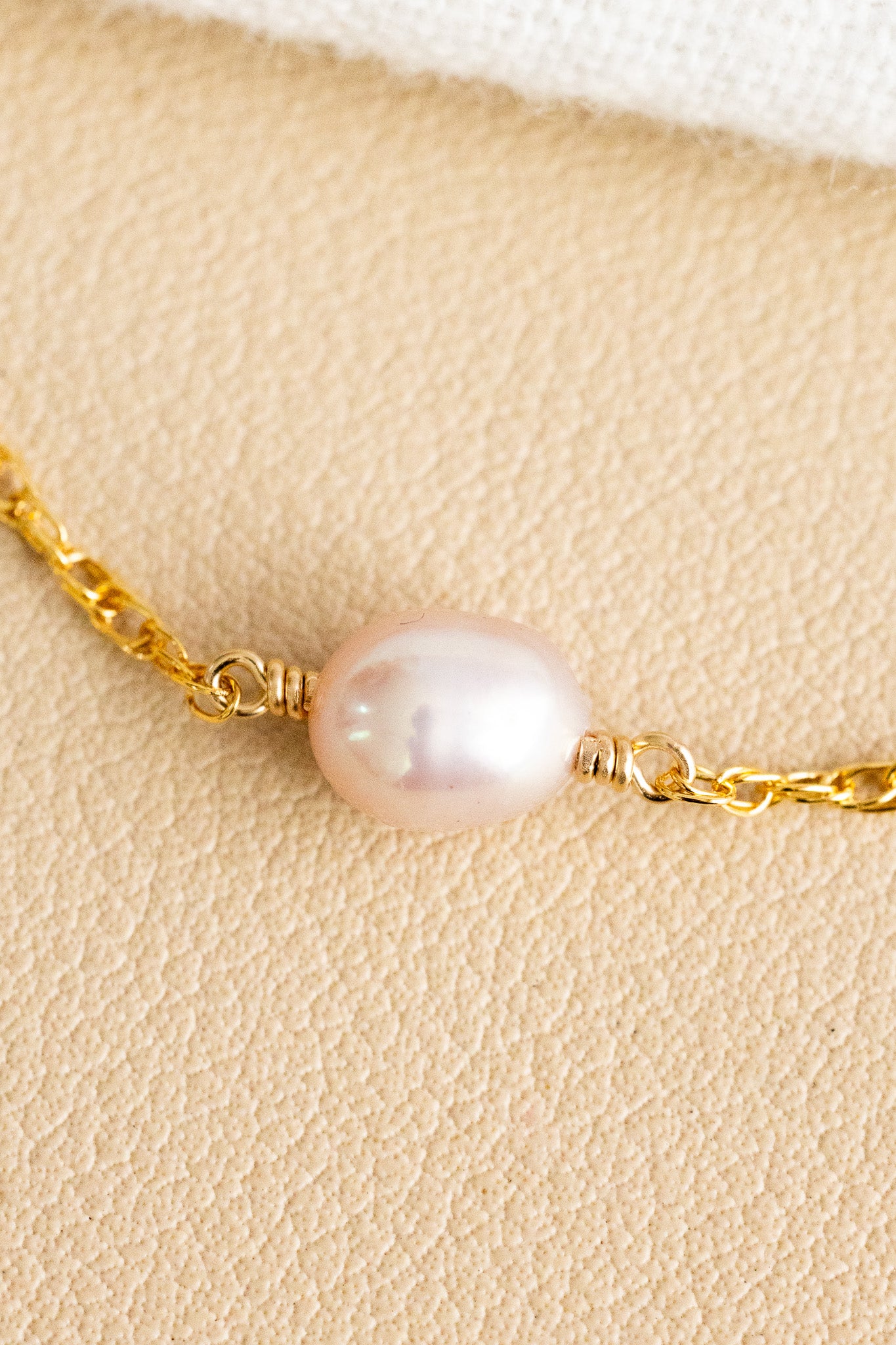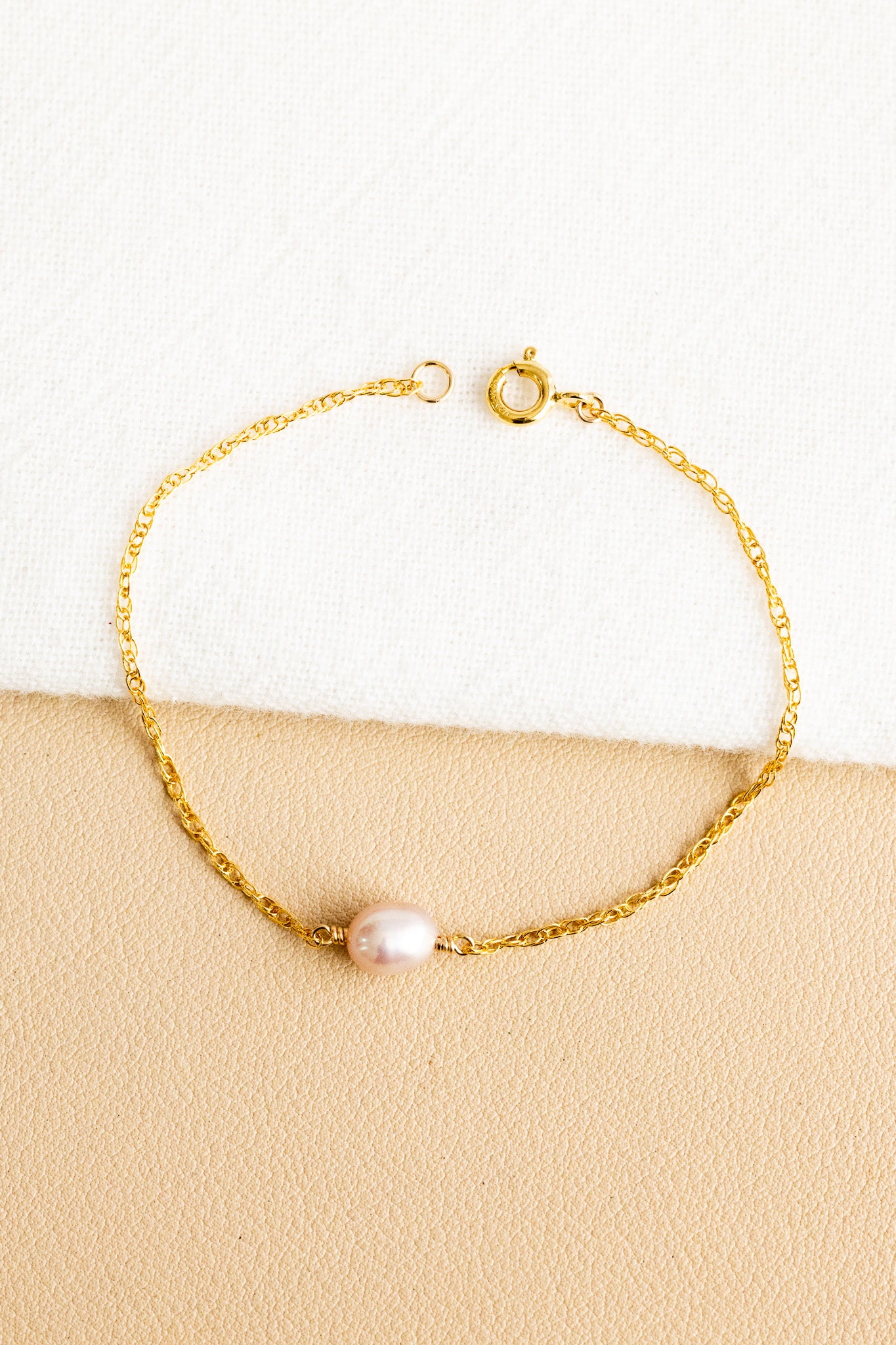 - 14k gold filled dainty rope chain bracelet with an 8mm light pink freshwater pearl