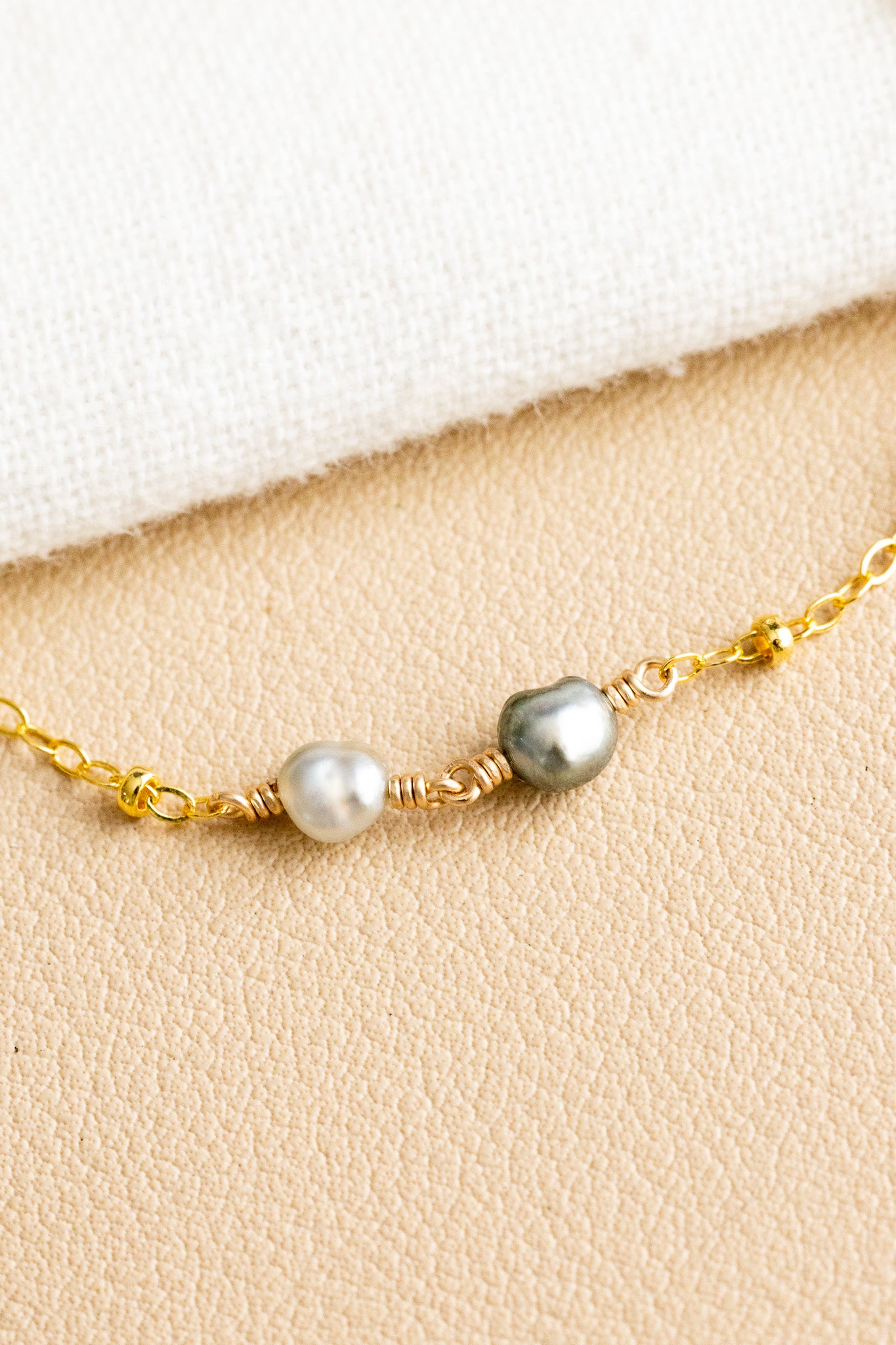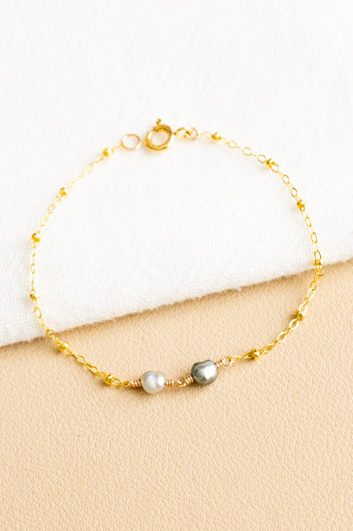 • 14k gold filled dainty satellite chain bracelet with two 4.5mm silver keshi Tahitian pearls