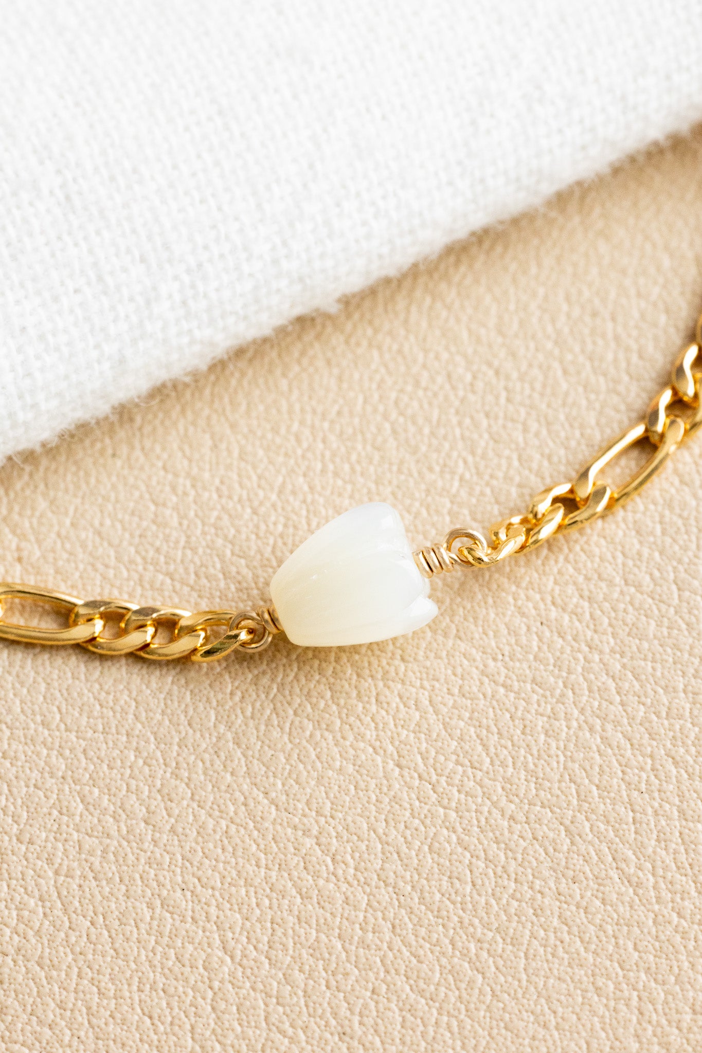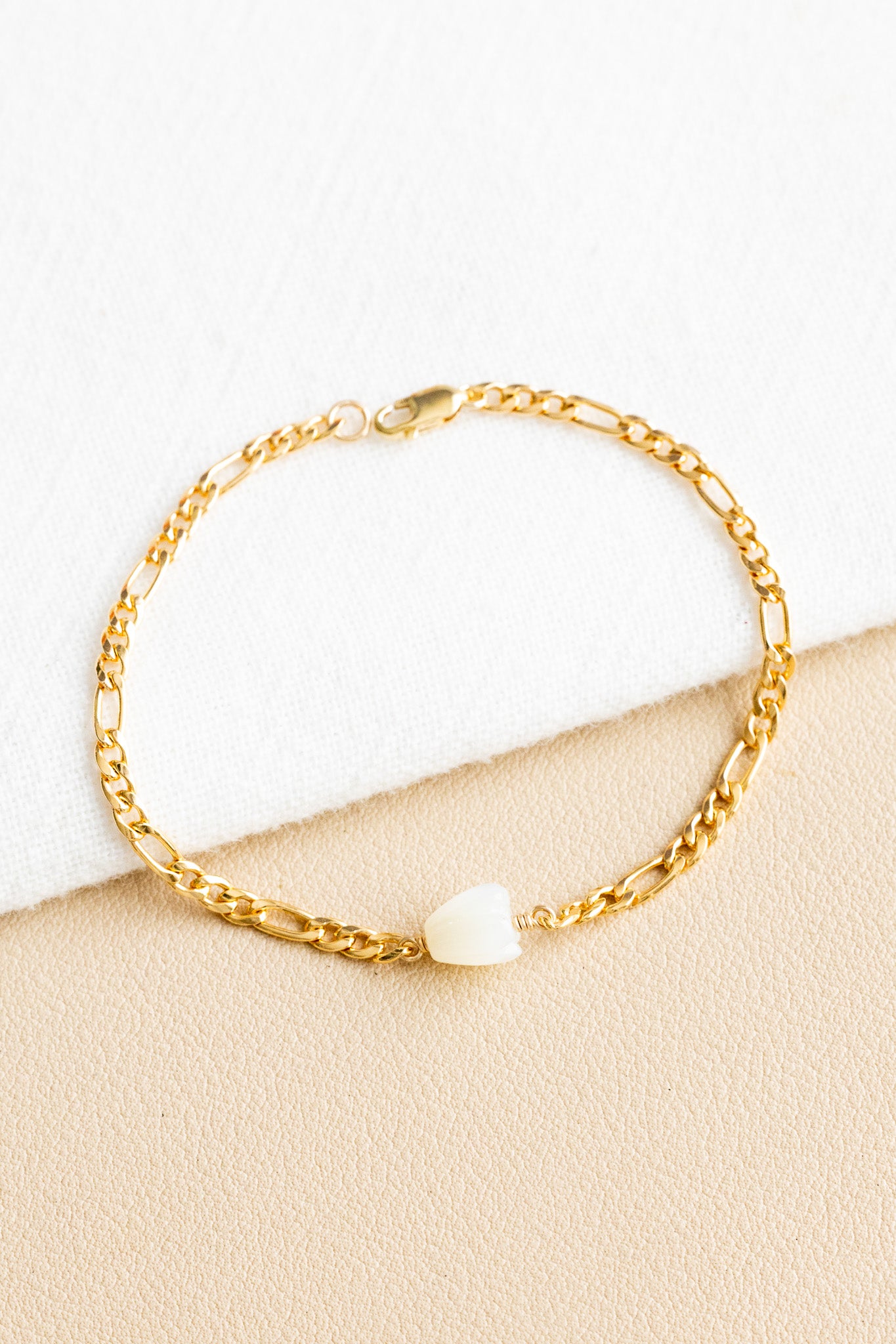 - 14k gold filled figaro chain bracelet with a 7mm small mother of pearl pikake bead