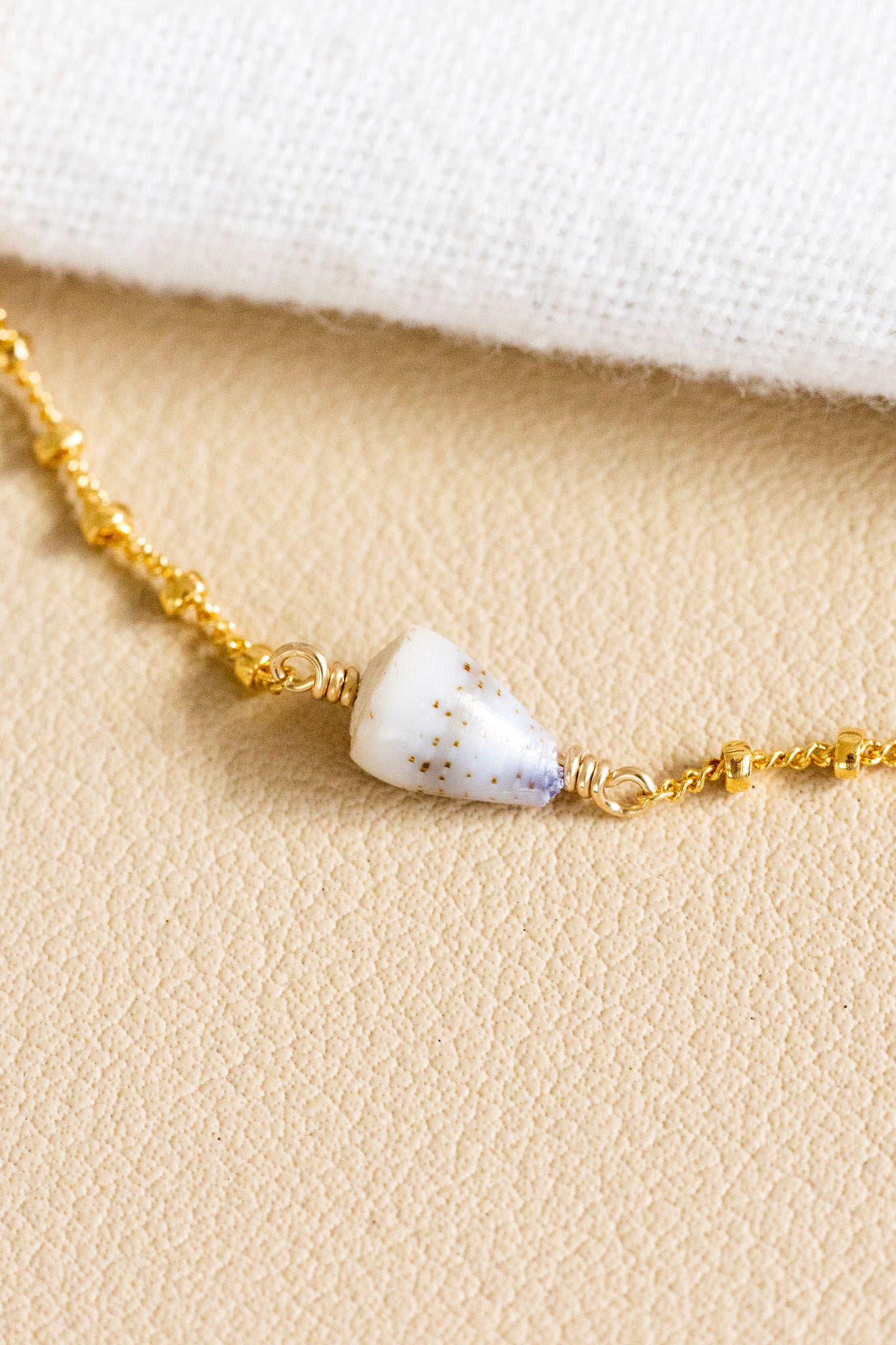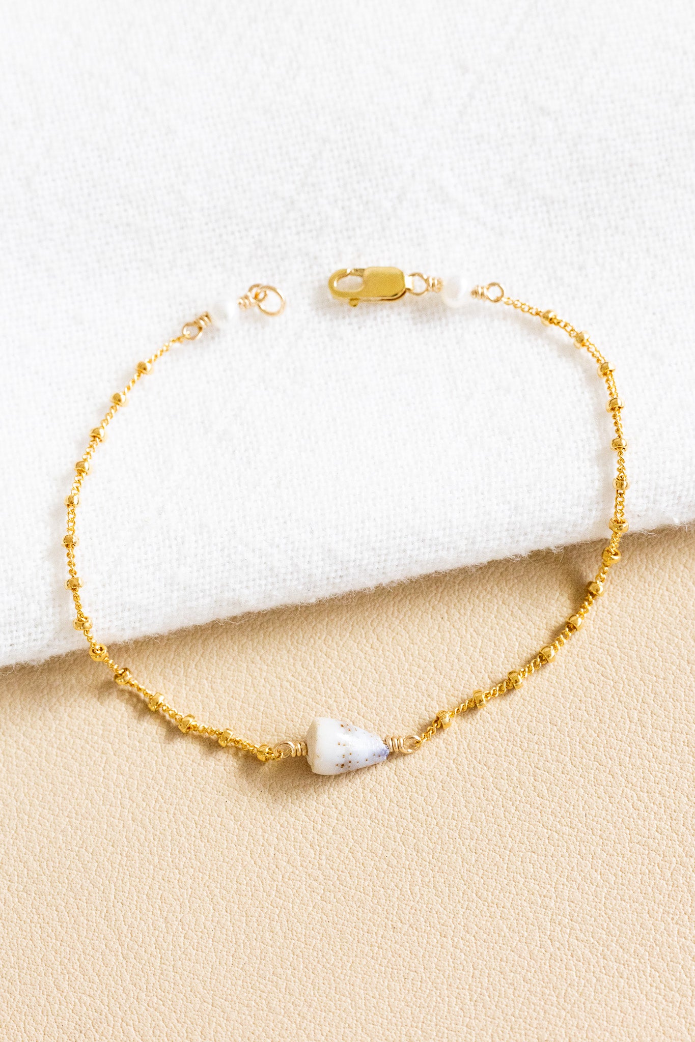 - 14k gold filled chain bracelet with a 8mm Dwarf Cone shell and 3mm mini round freshwater pearls at both ends of the chain