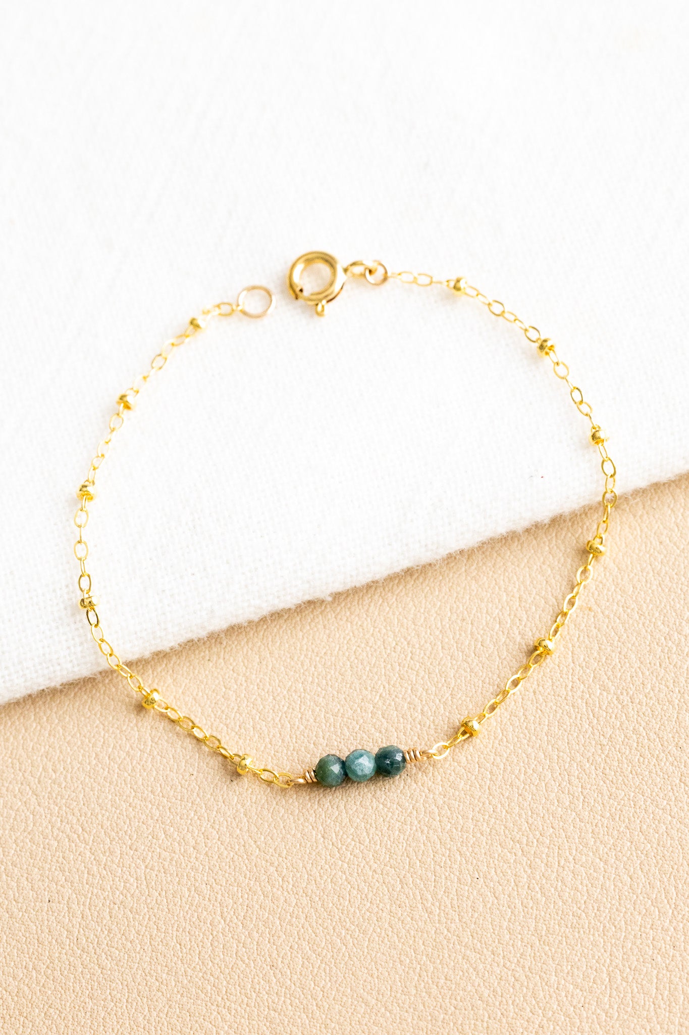 - 14k gold filled dainty satellite bracelet with three 3mm blue tourmaline stones