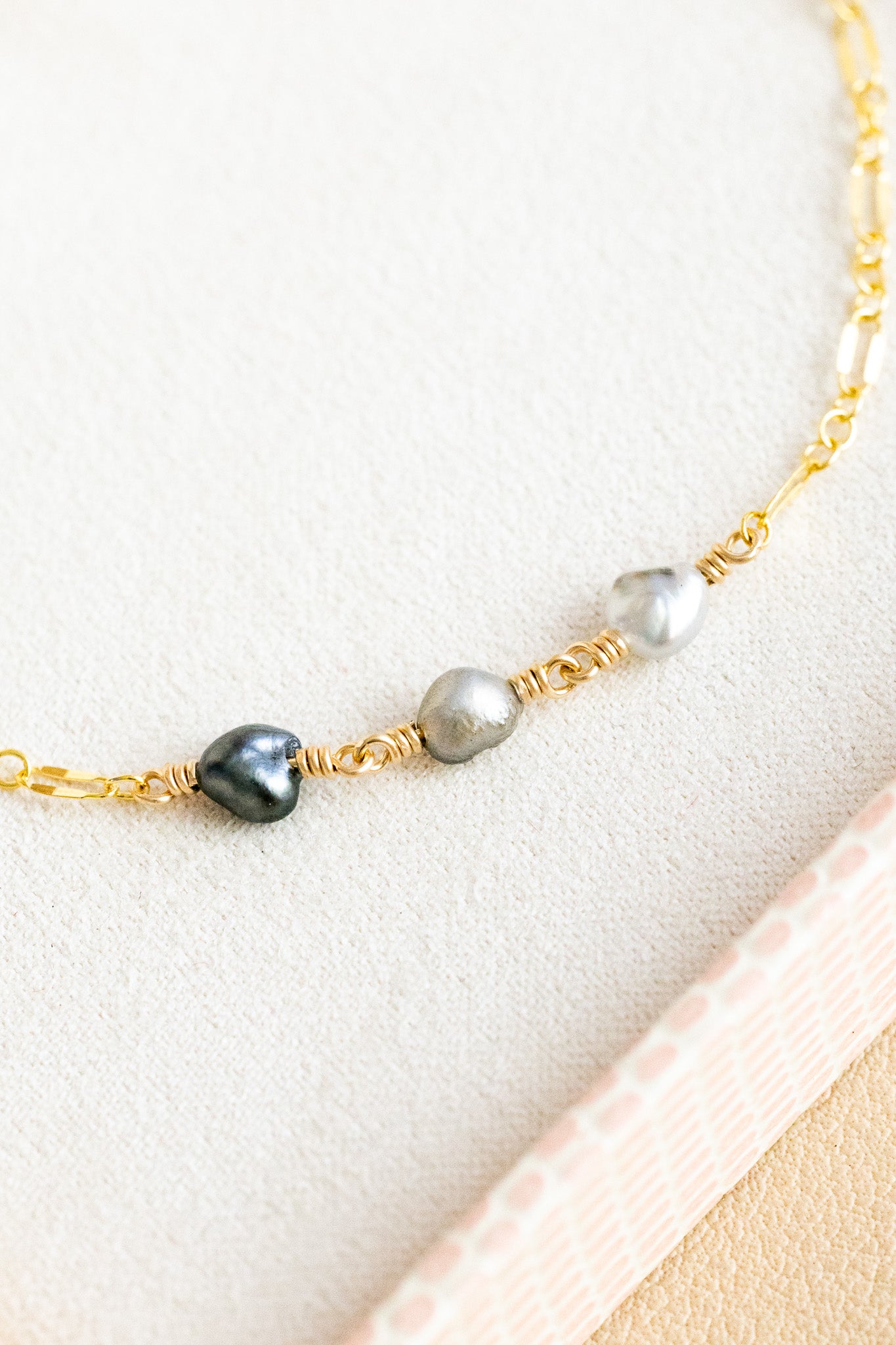 - 14k gold filled dainty dapped chain bracelet with a color mix gradient (light-dark) of three 5mm keshi tahitian pearls