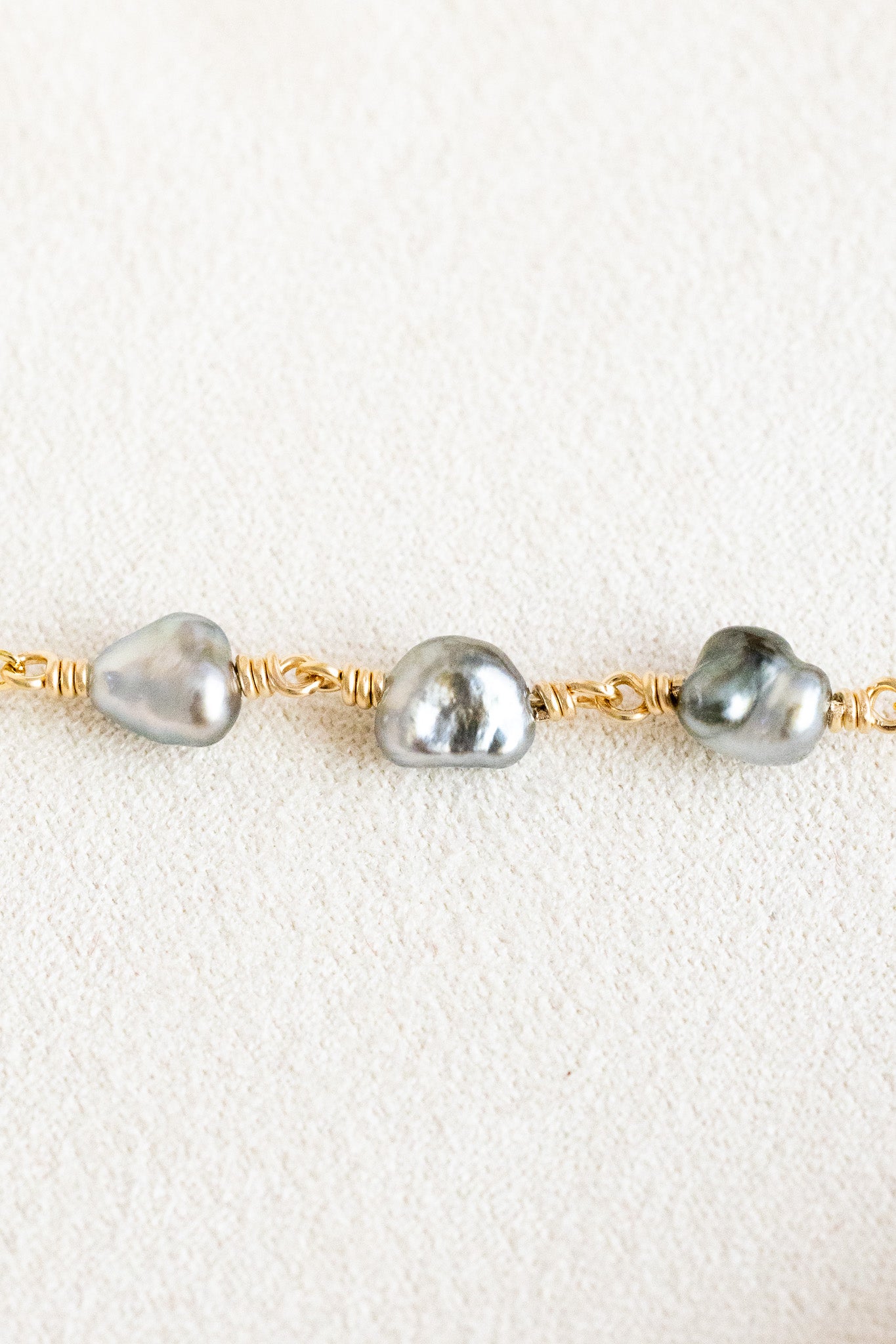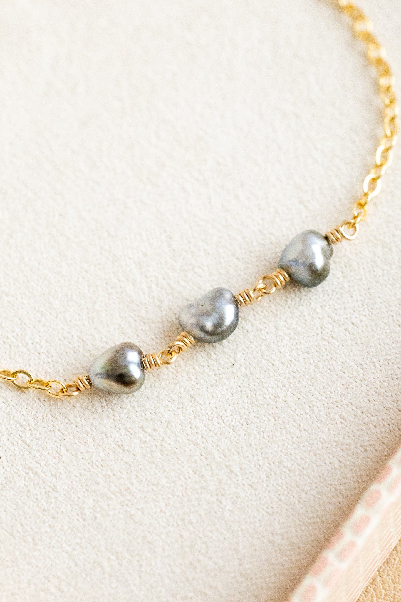 - 14k gold filled dainty chain bracelet with three 5-6mm silver keshi tahitian pearls