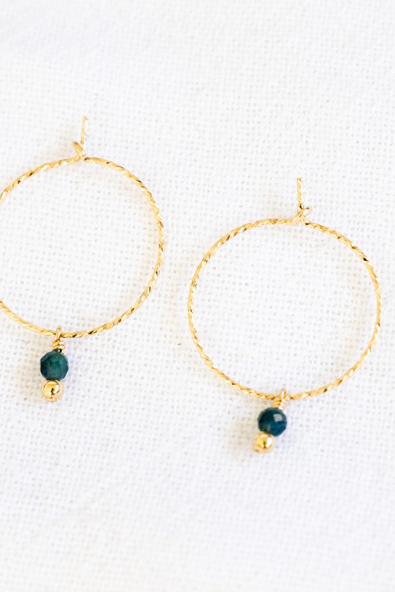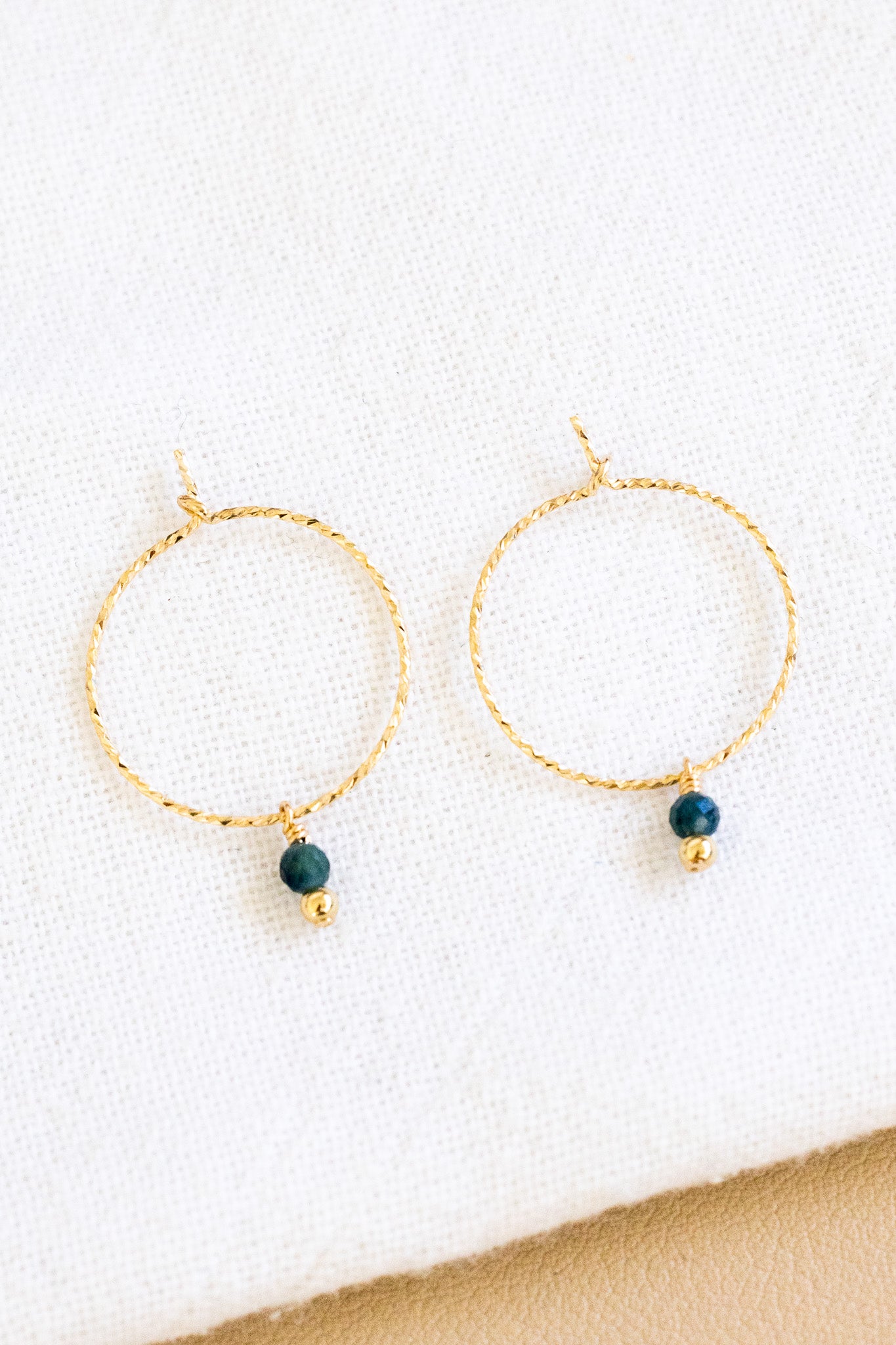 • 14k gold filled 20mm twisted textured hoops with 3mm blue tourmaline beads and 2.5mm gold filled beads