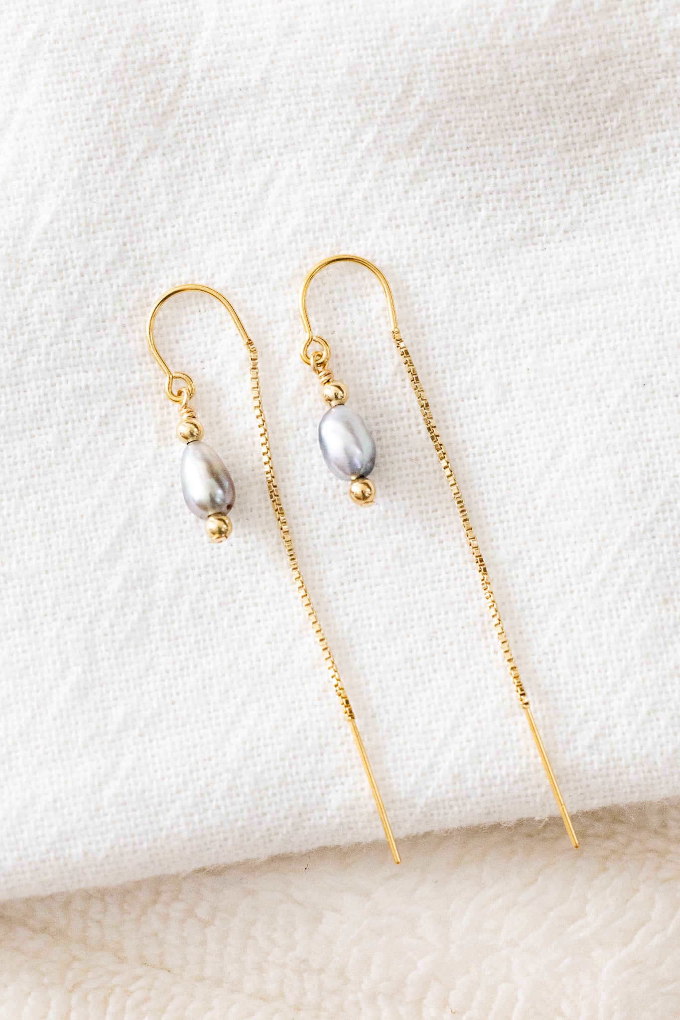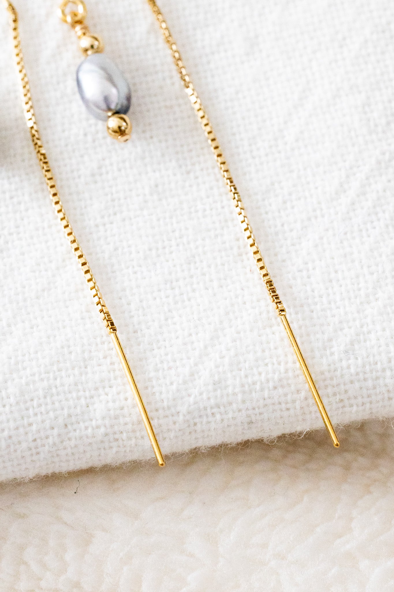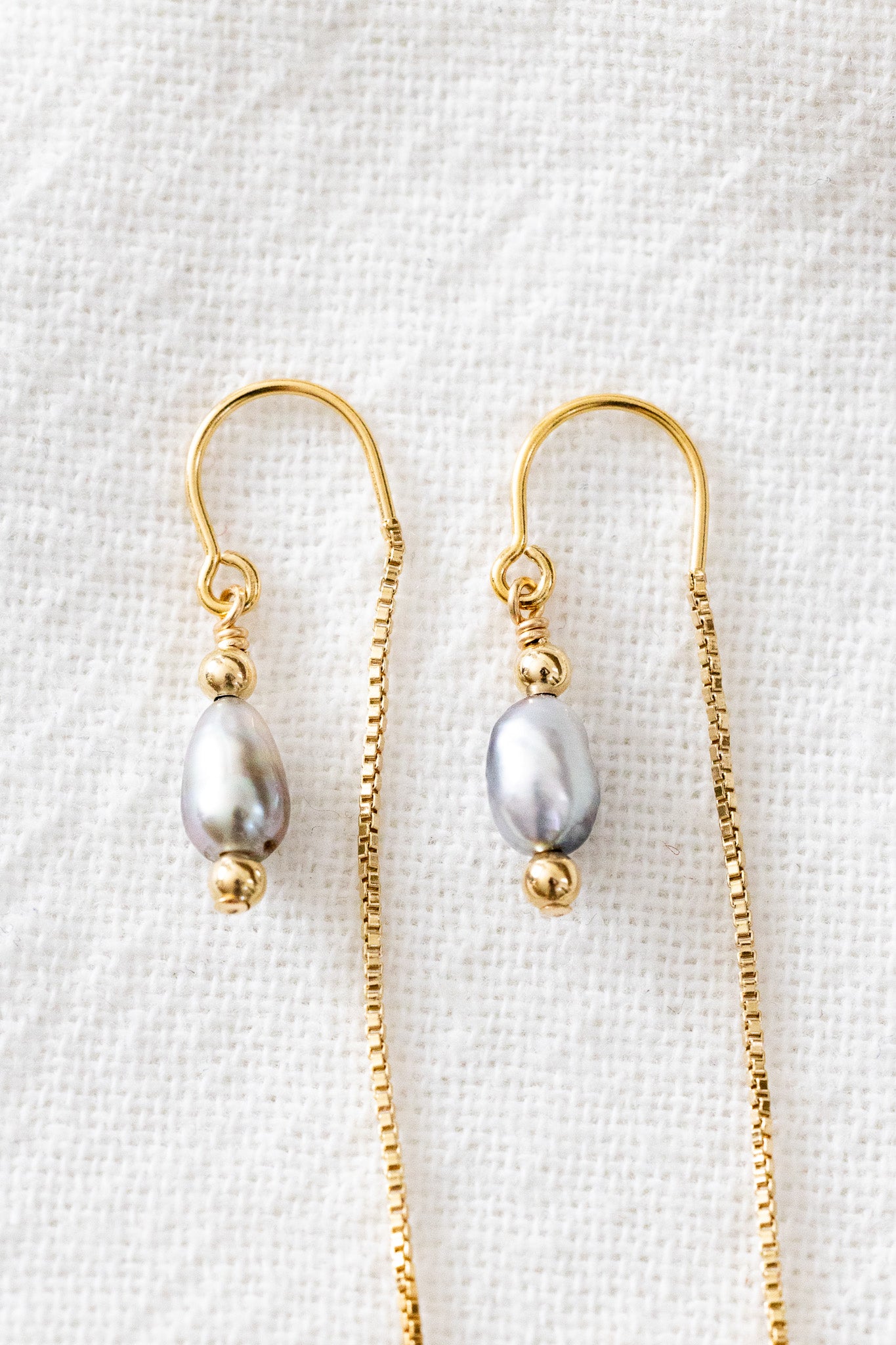 - 14k gold filled U box ear threaders with 4mm x 6mm keshi Tahitian pearls in between 2.5mm gold filled beads