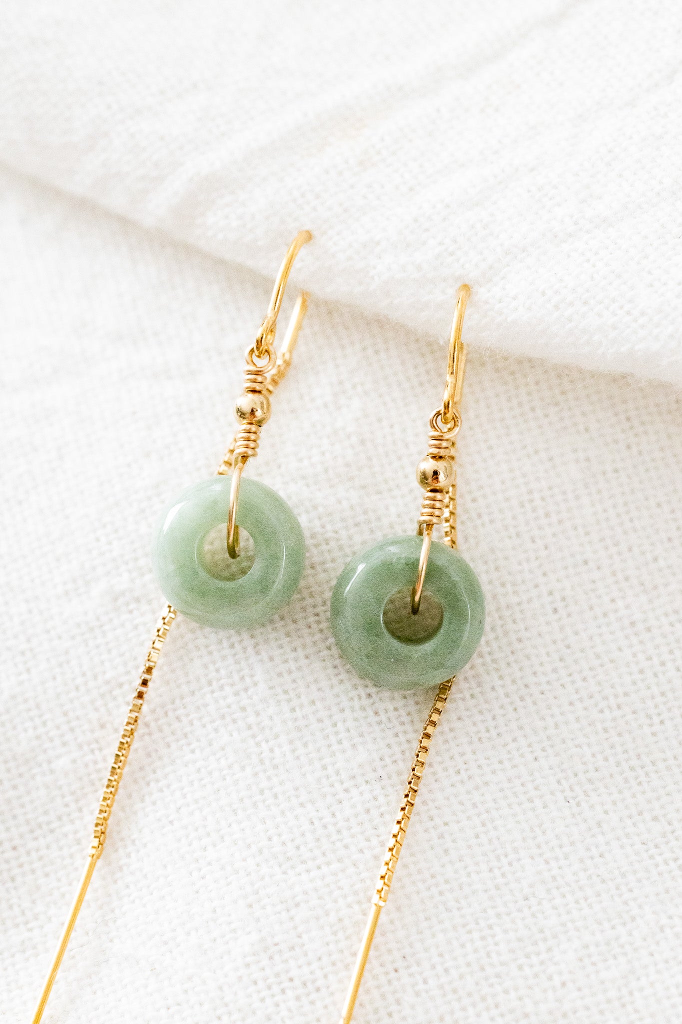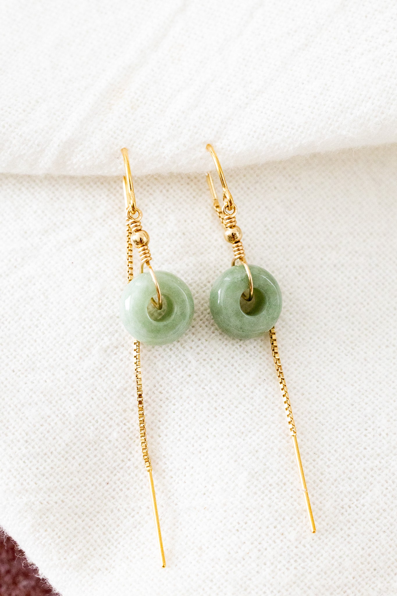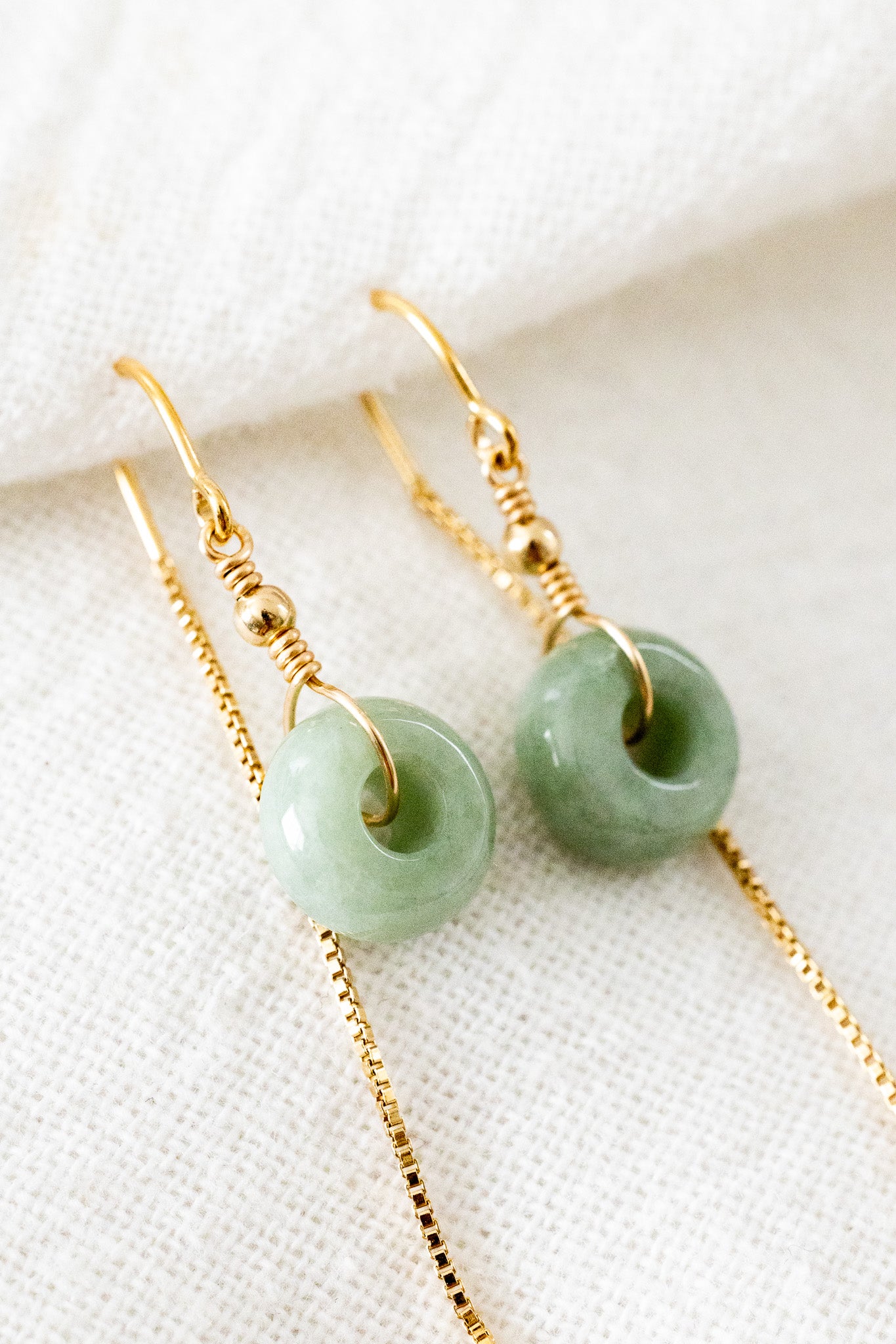 - 14k gold filled U plain ear threaders with 2.5mm gold filled beads above 5mm x 10mm jadeite donut beads