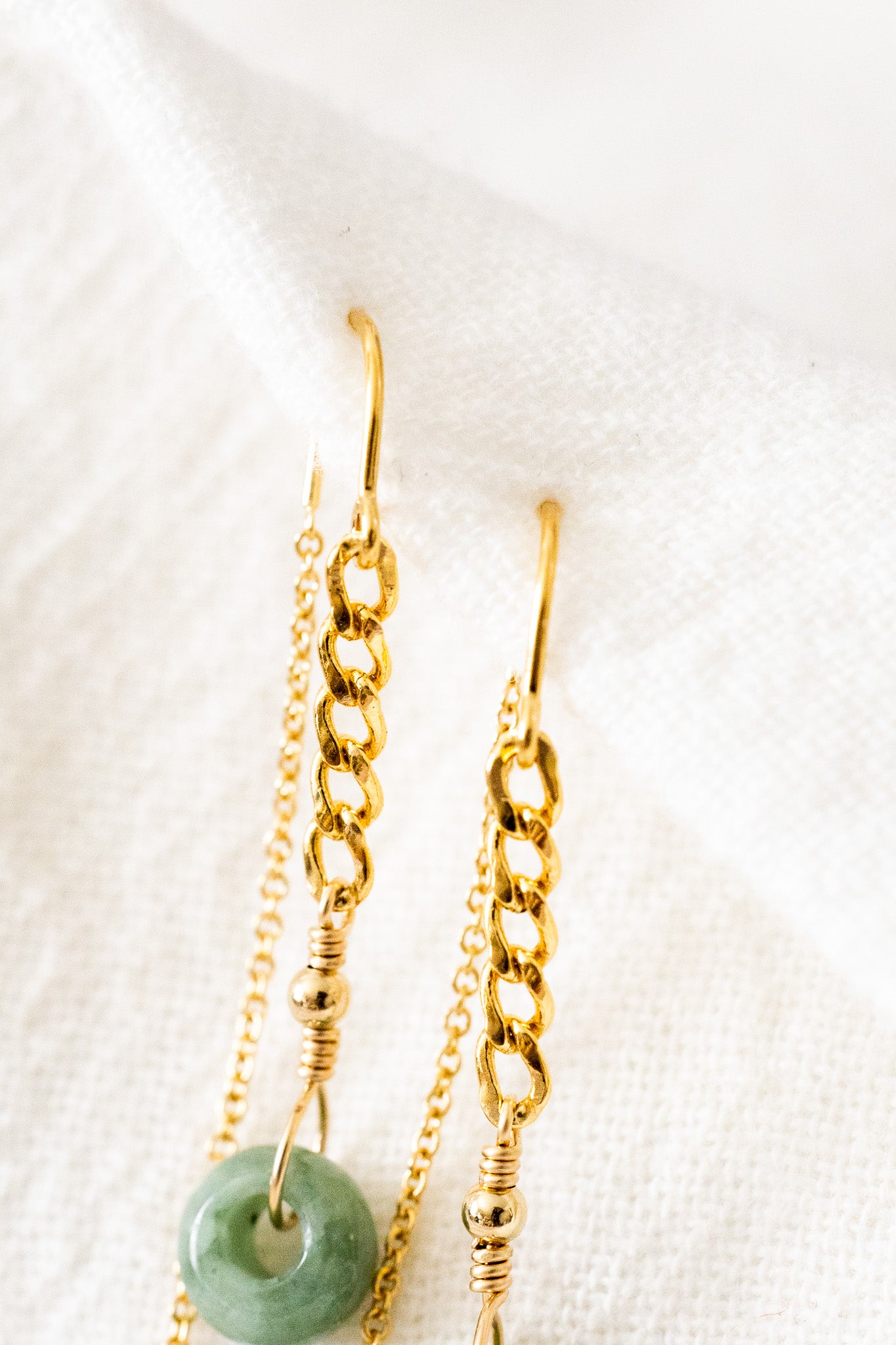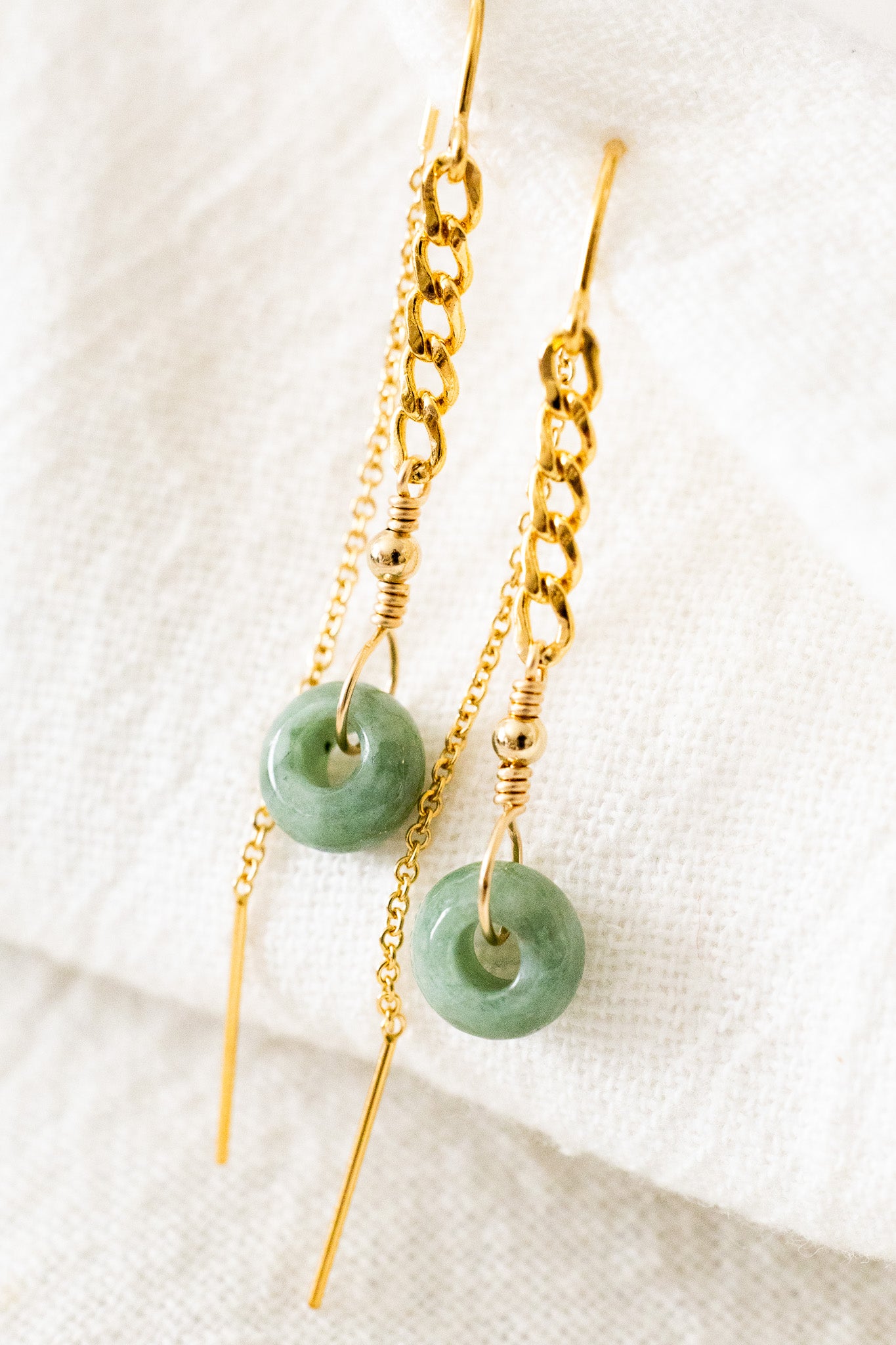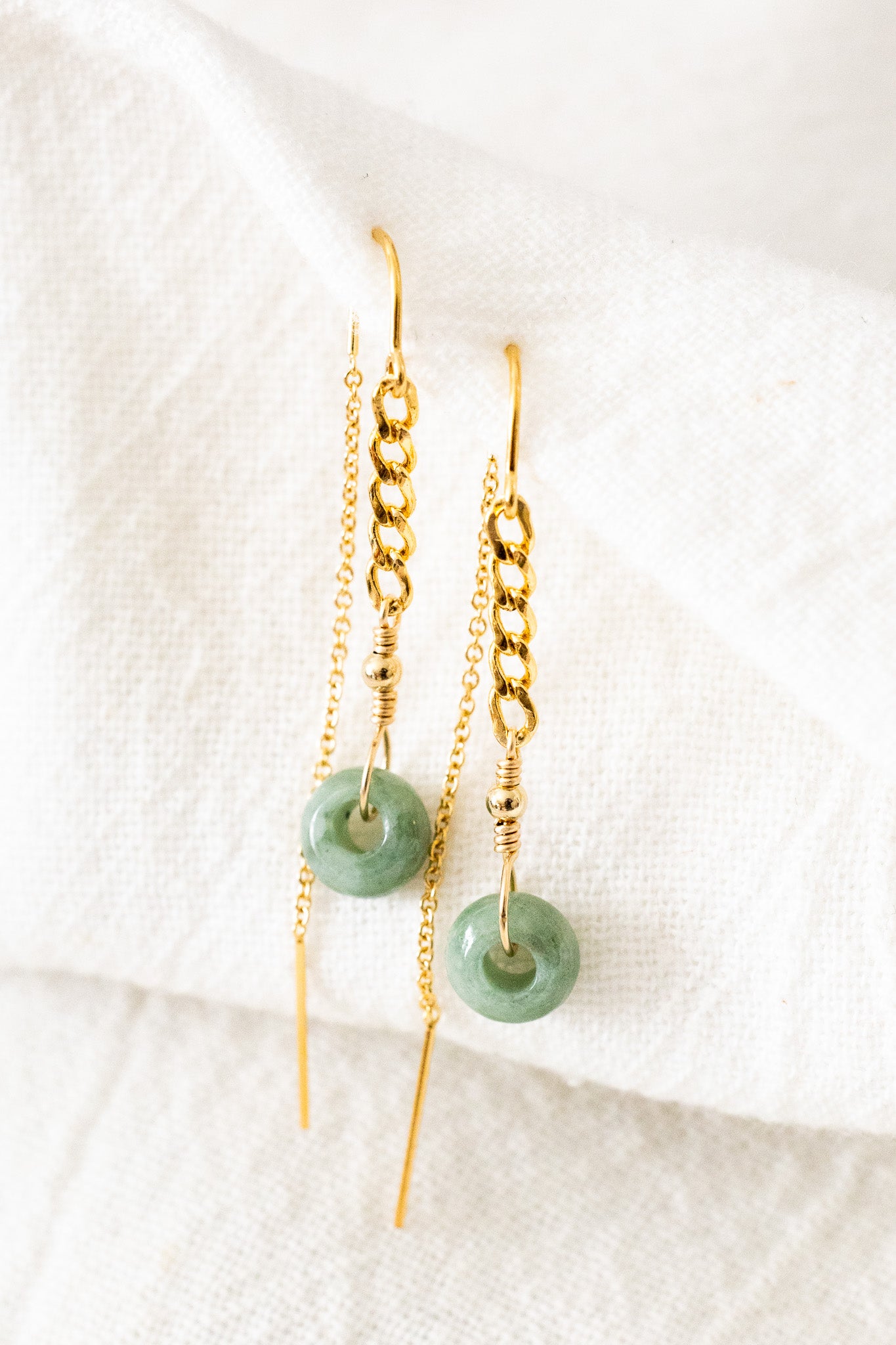 - 14k gold filled U plain ear threaders with half an inch of 14k gold filled curb chain and 2.5mm gold filled beads above 4mm x 8mm mini jadeite donut beads