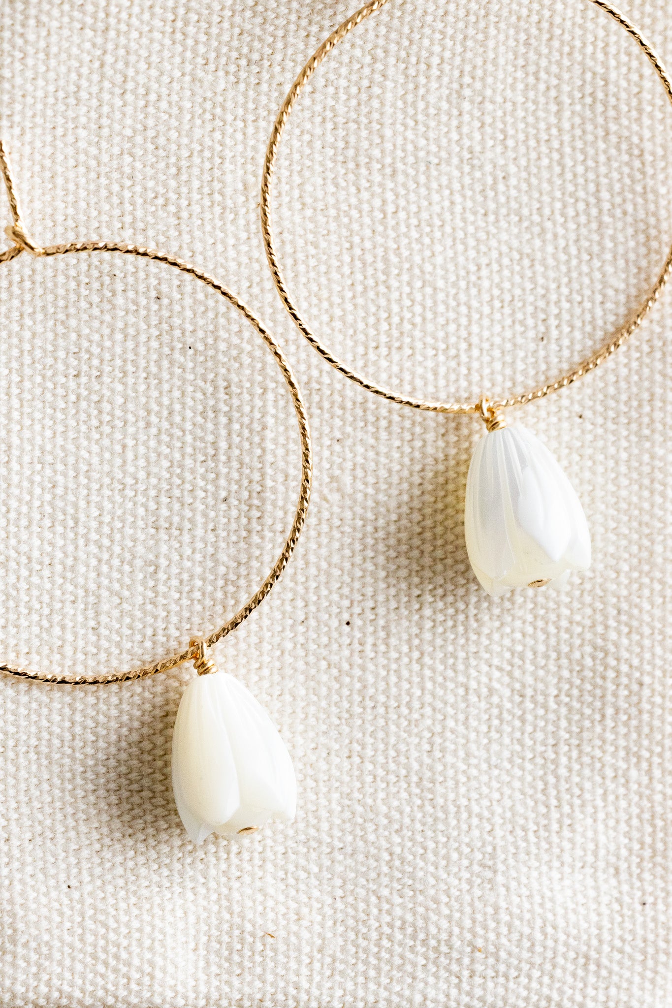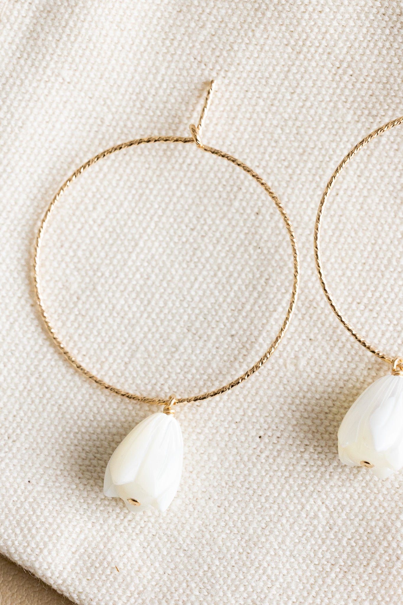 • 14k gold filled 30mm twisted hoops with two large mother of pearl pikake beads