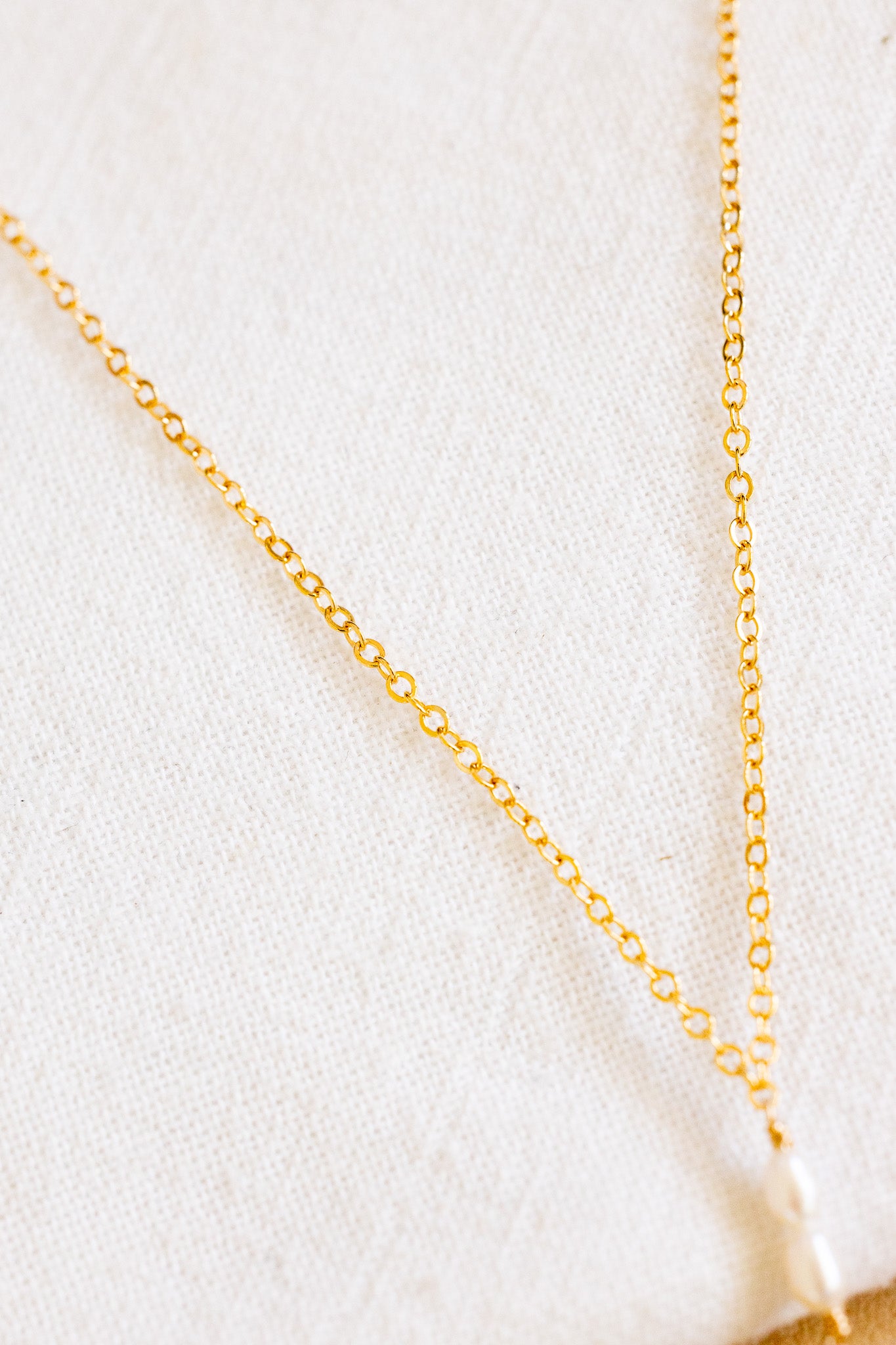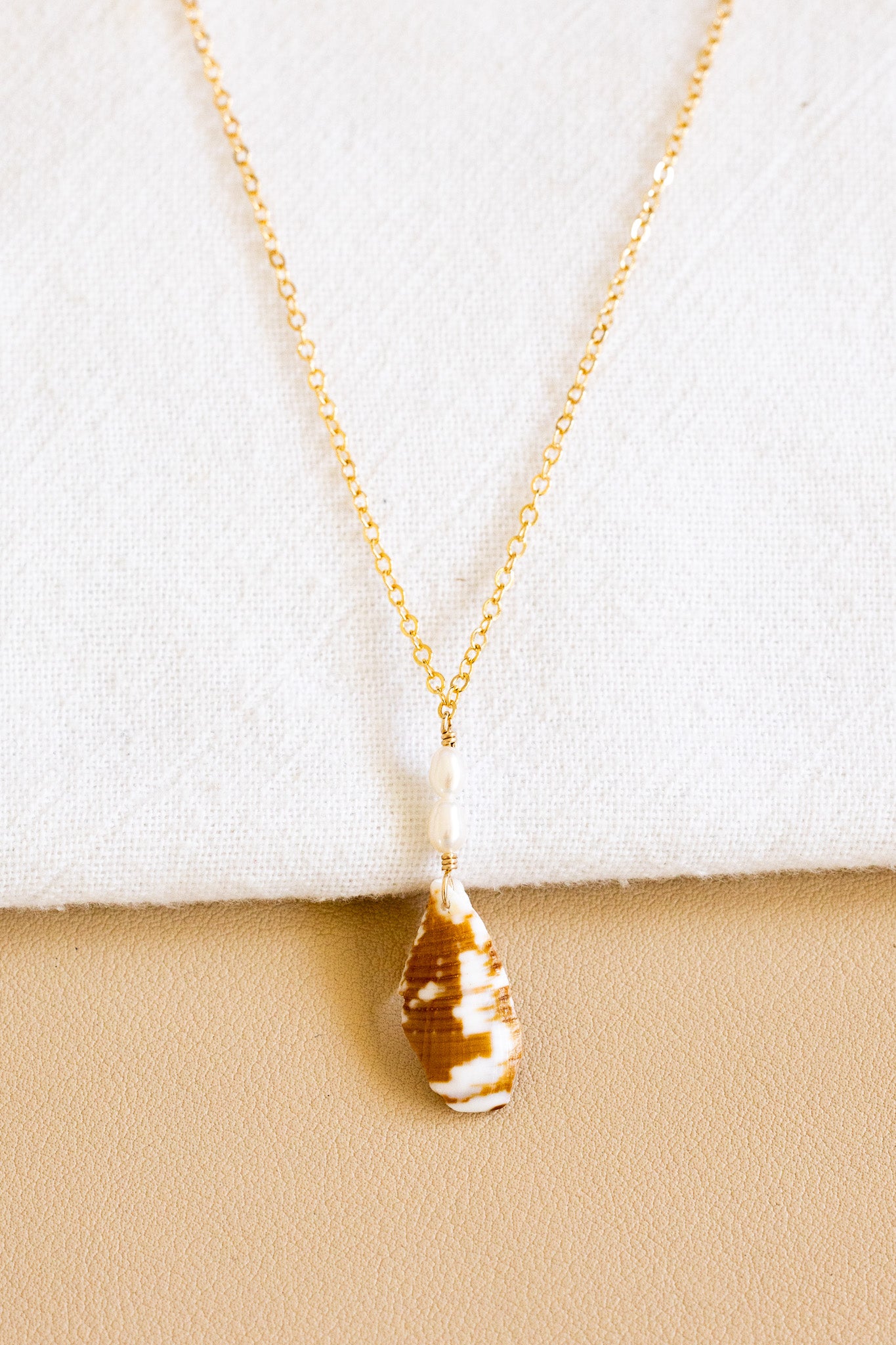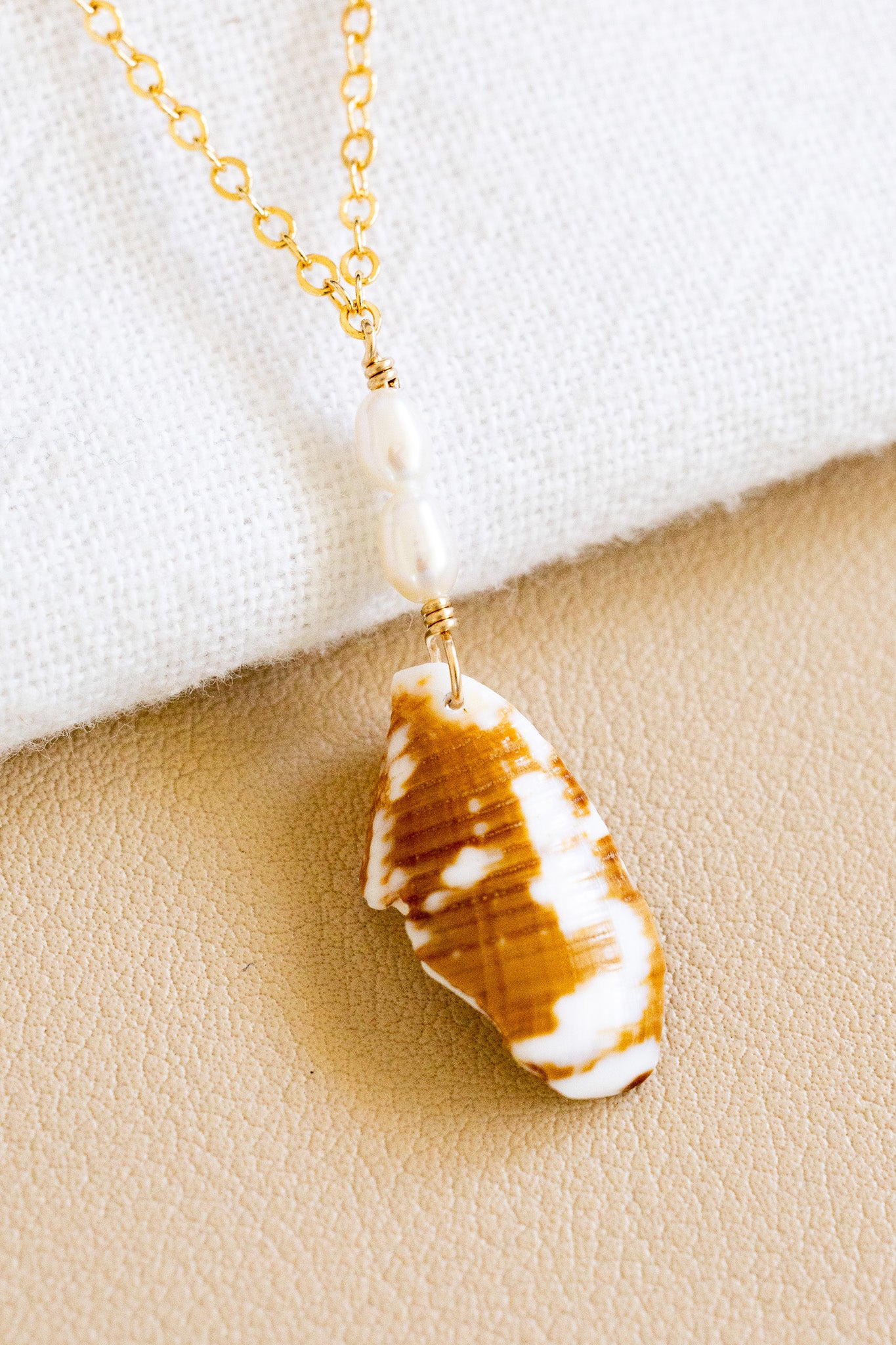 - 14k gold filled chain necklace with two 3.5mm x 4-5mm freshwater pearls and a 22mm cat cone shell fragment