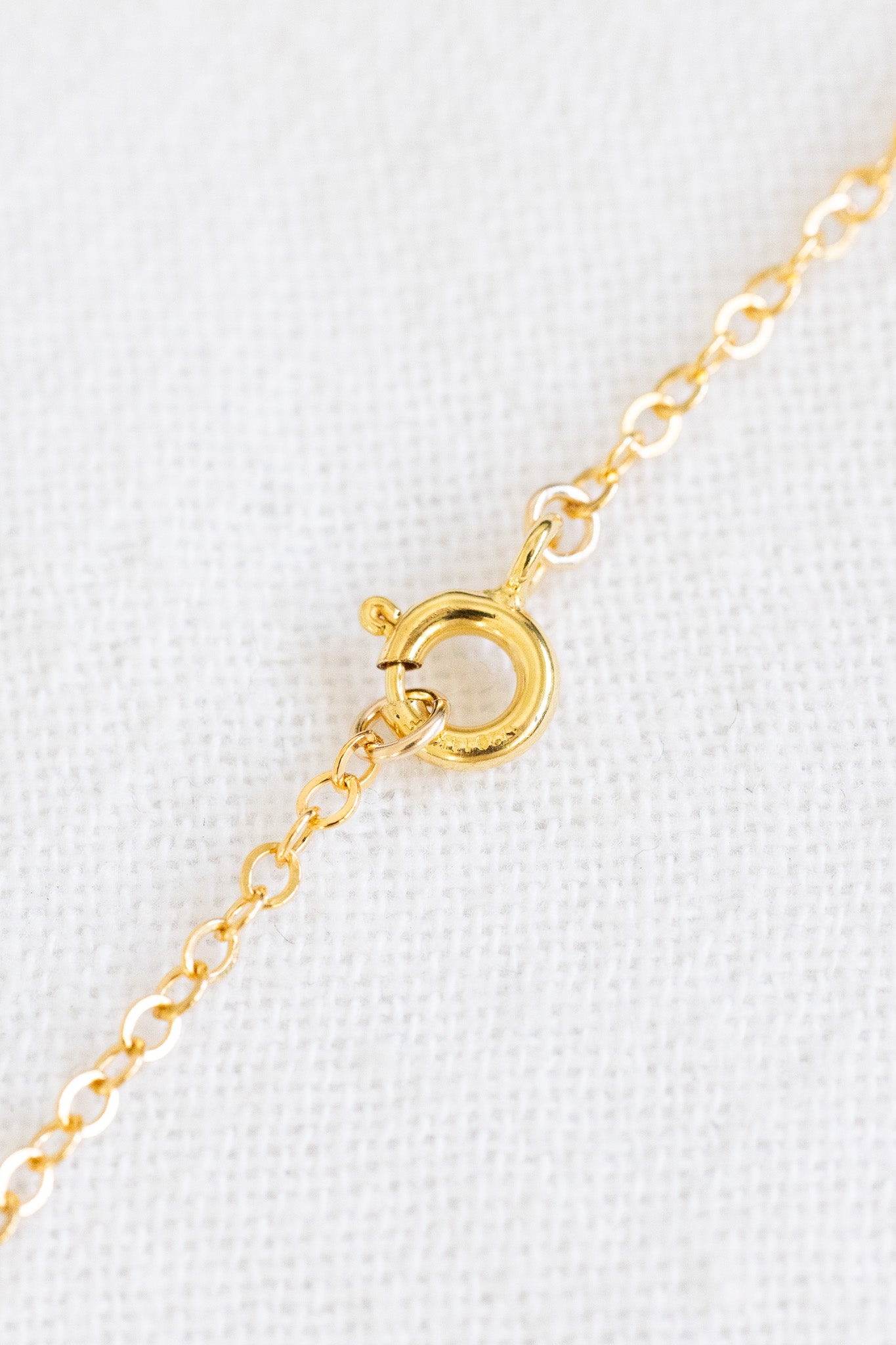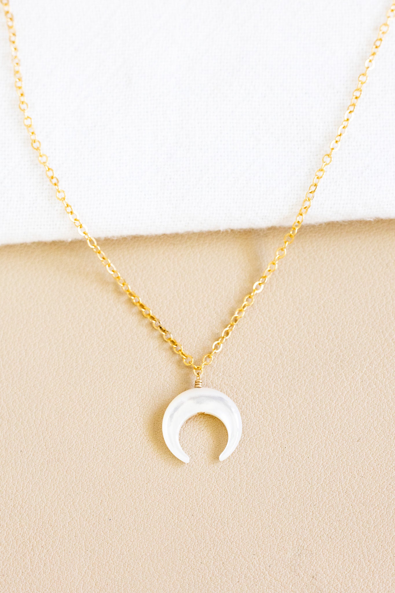 - 14k gold filled chain necklace with a 15mm mother of pearl crescent pendant