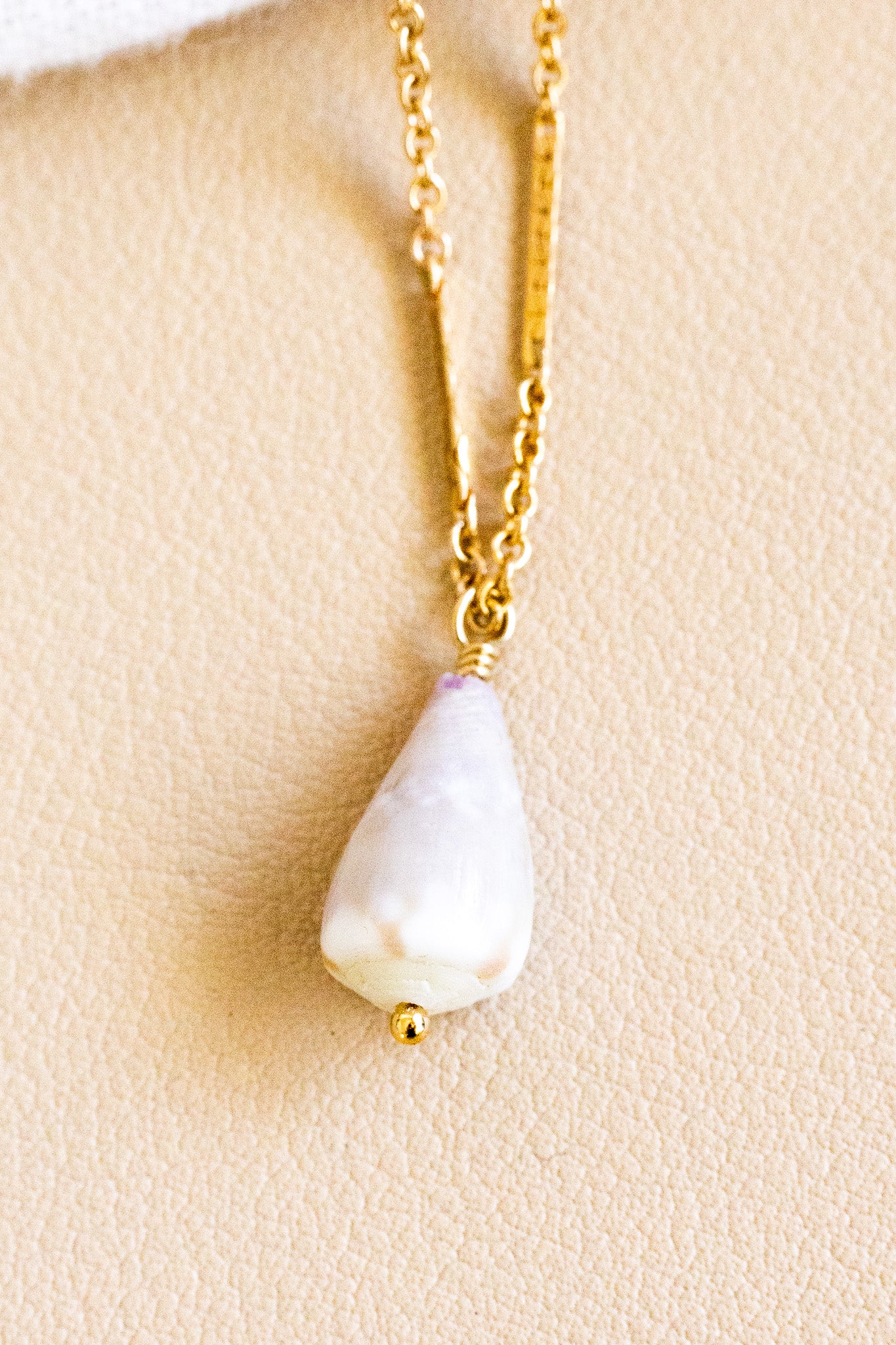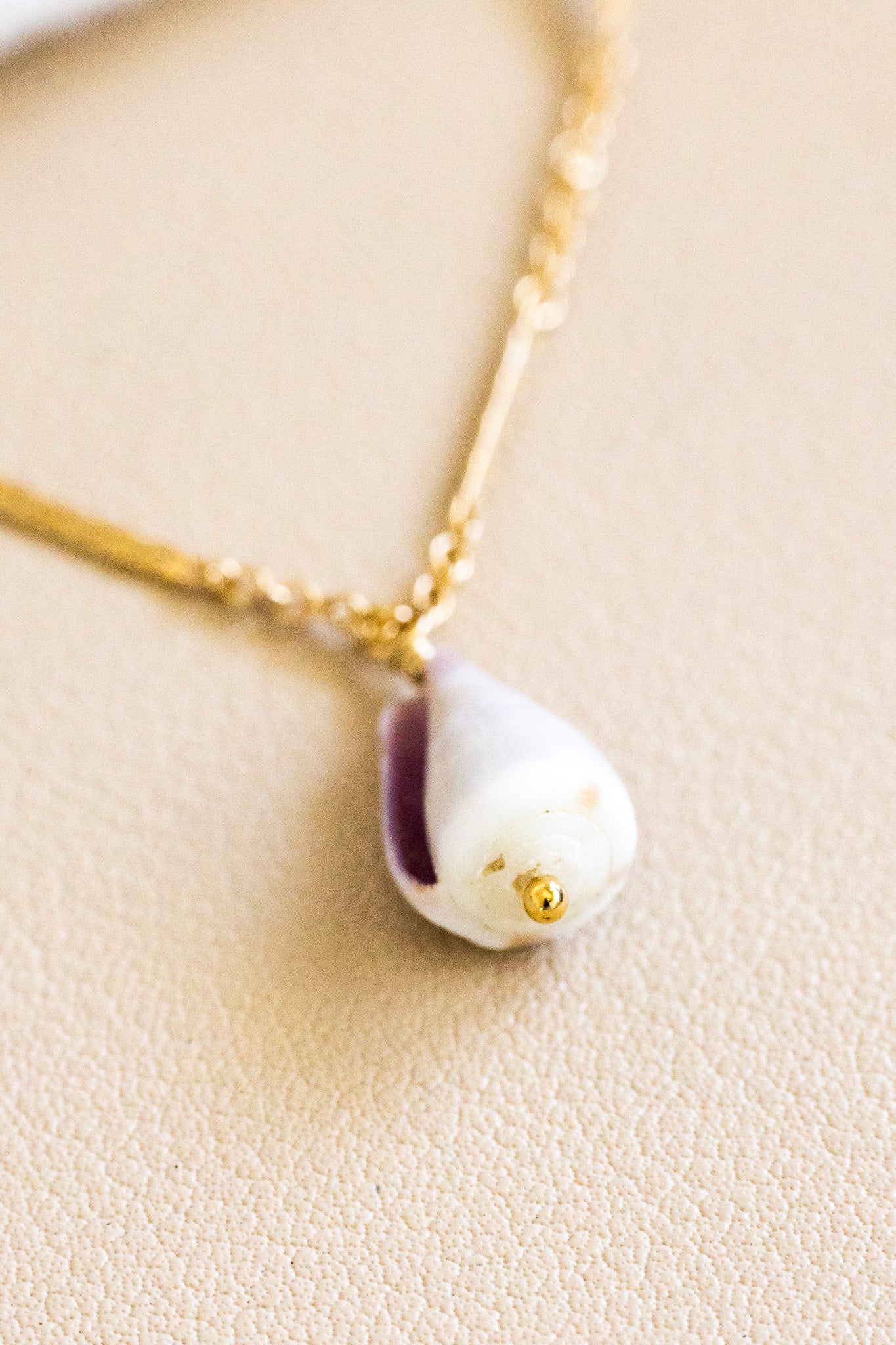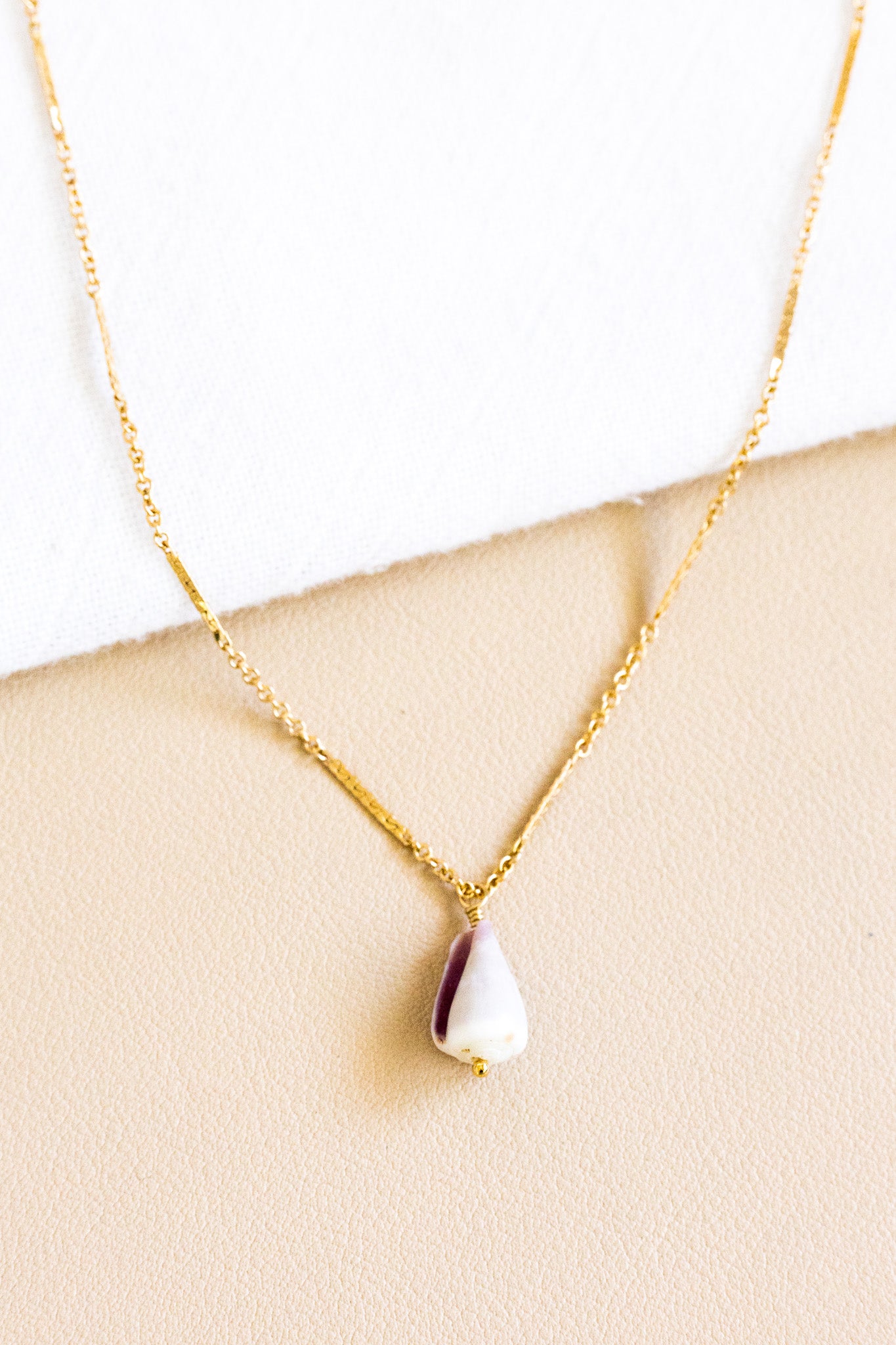 - Dainty 14k gold filled bar chain necklace with a 8mm x 14mm pale brown/purple Rat Cone Shell