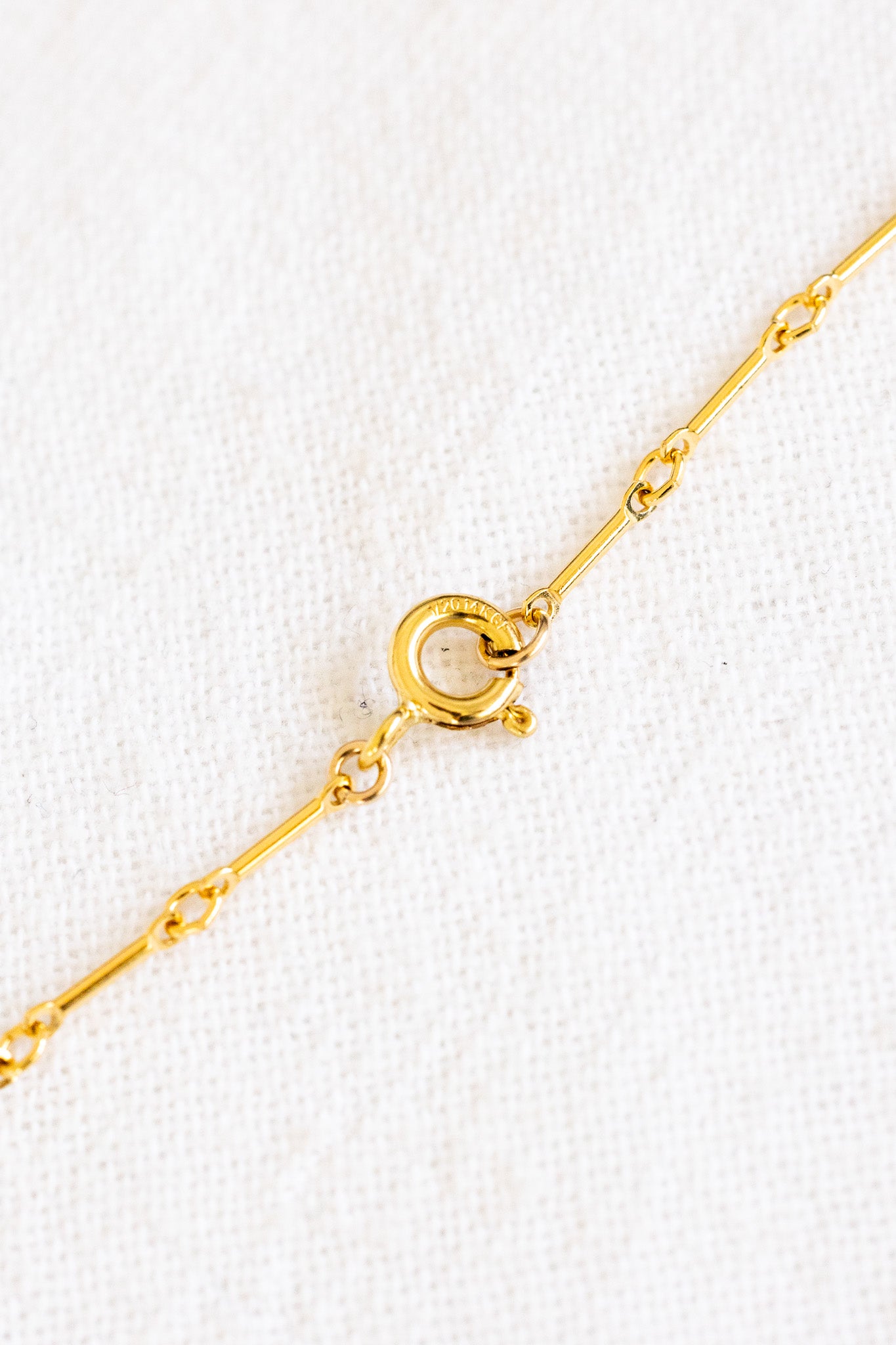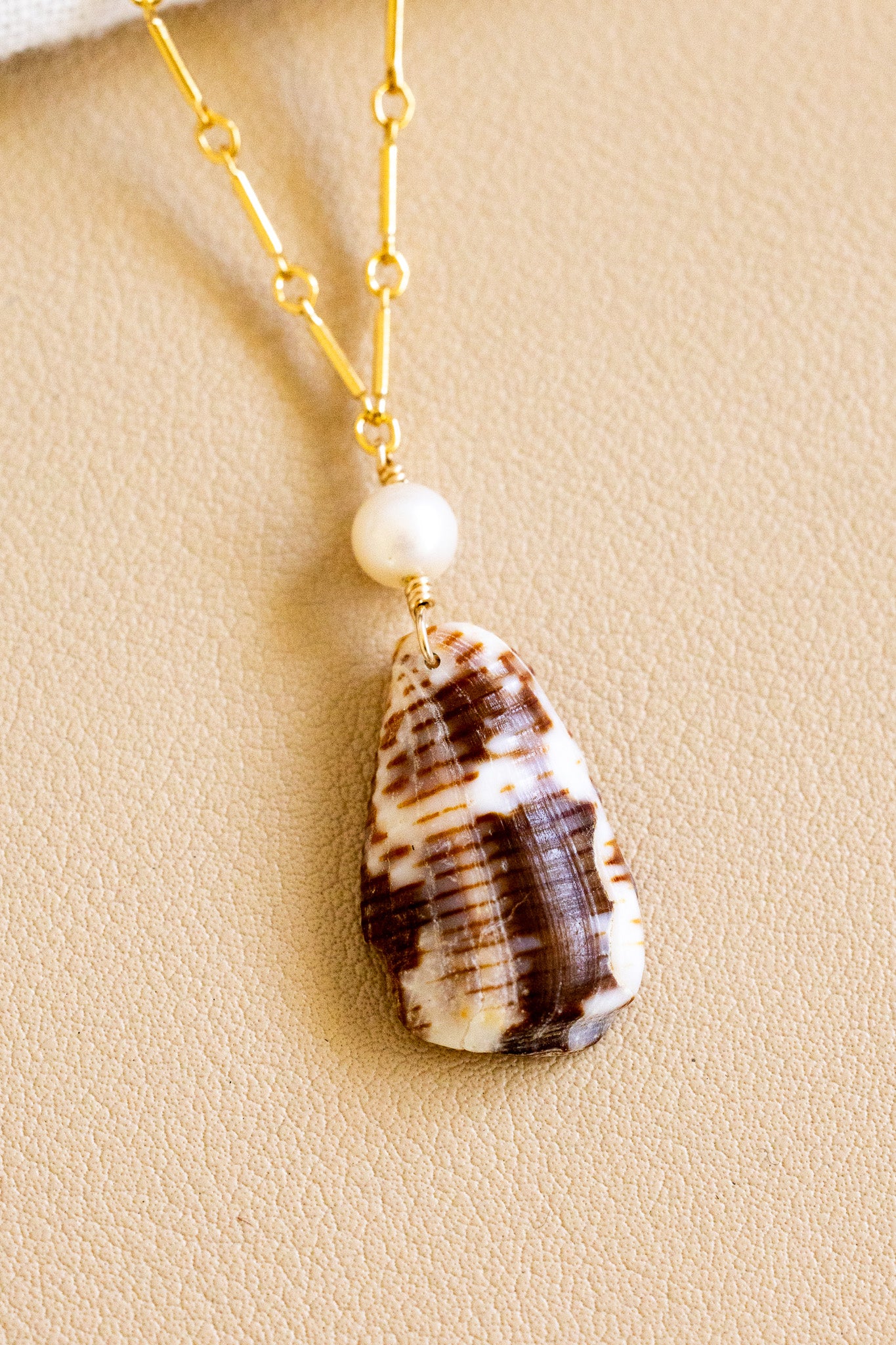 • 14k gold filled chain necklace with a 5mm round freshwater pearl and a 24mm cat cone shell fragment