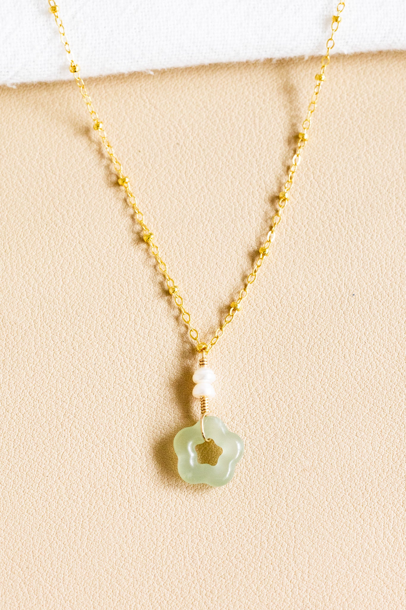 Dainty 14k gold filled satellite chain necklace with two 2mm mini button freshwater pearls stacked on top a 12mm natural jade flower pendant