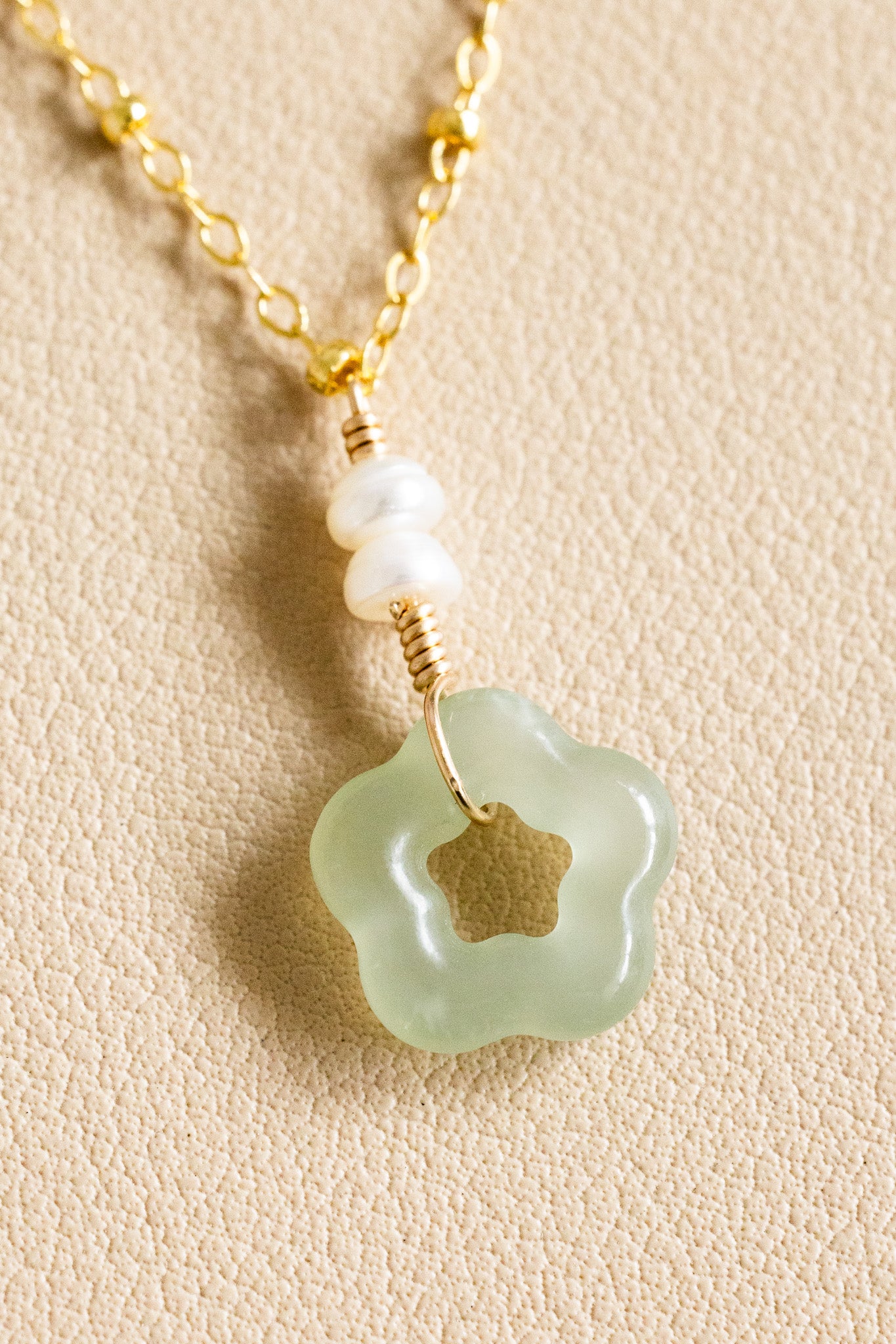 Stacked Button Pearl & Jade Flower Beam Necklace