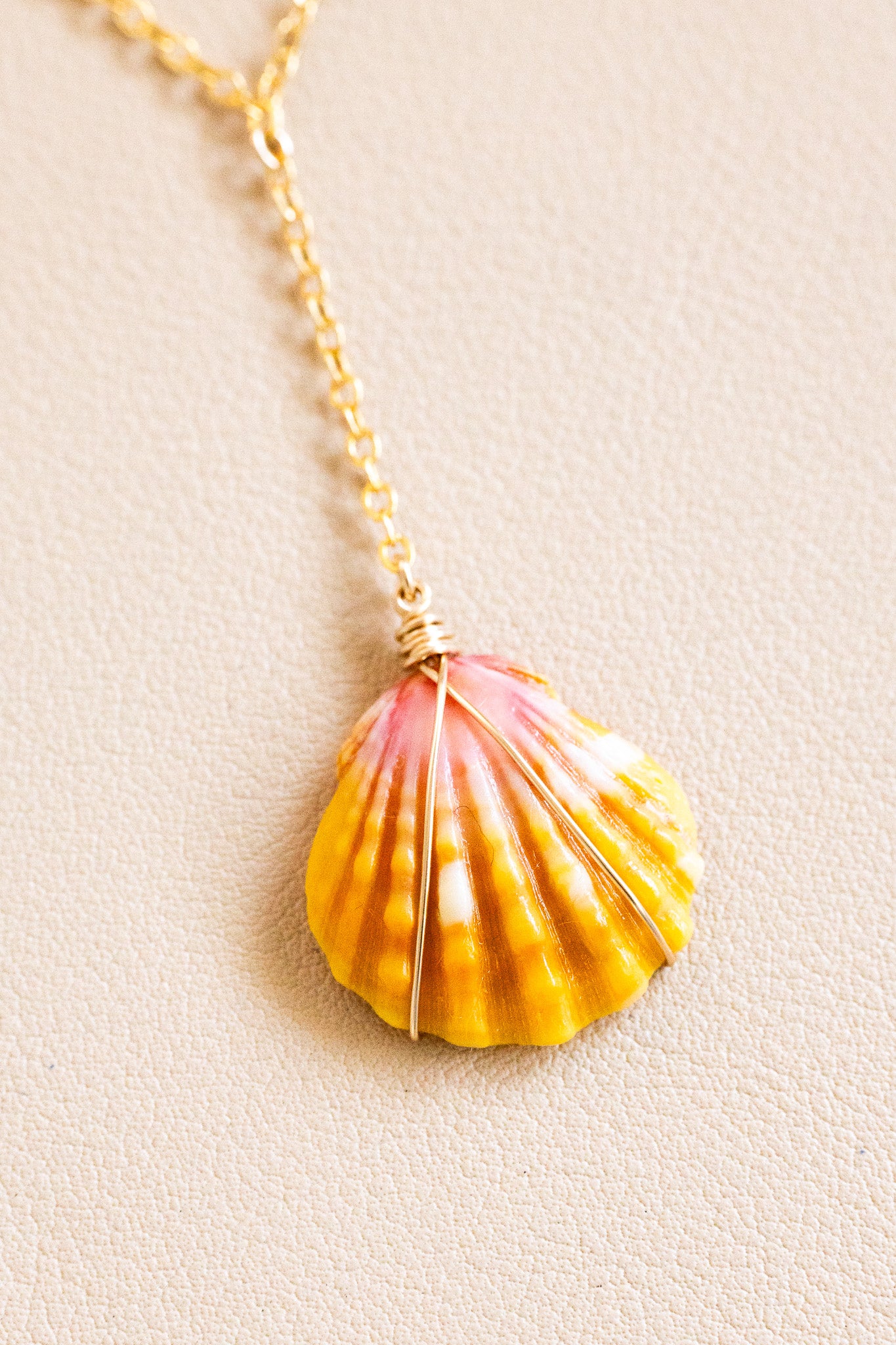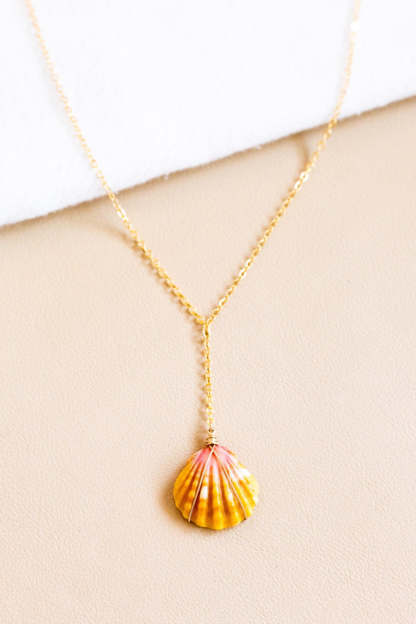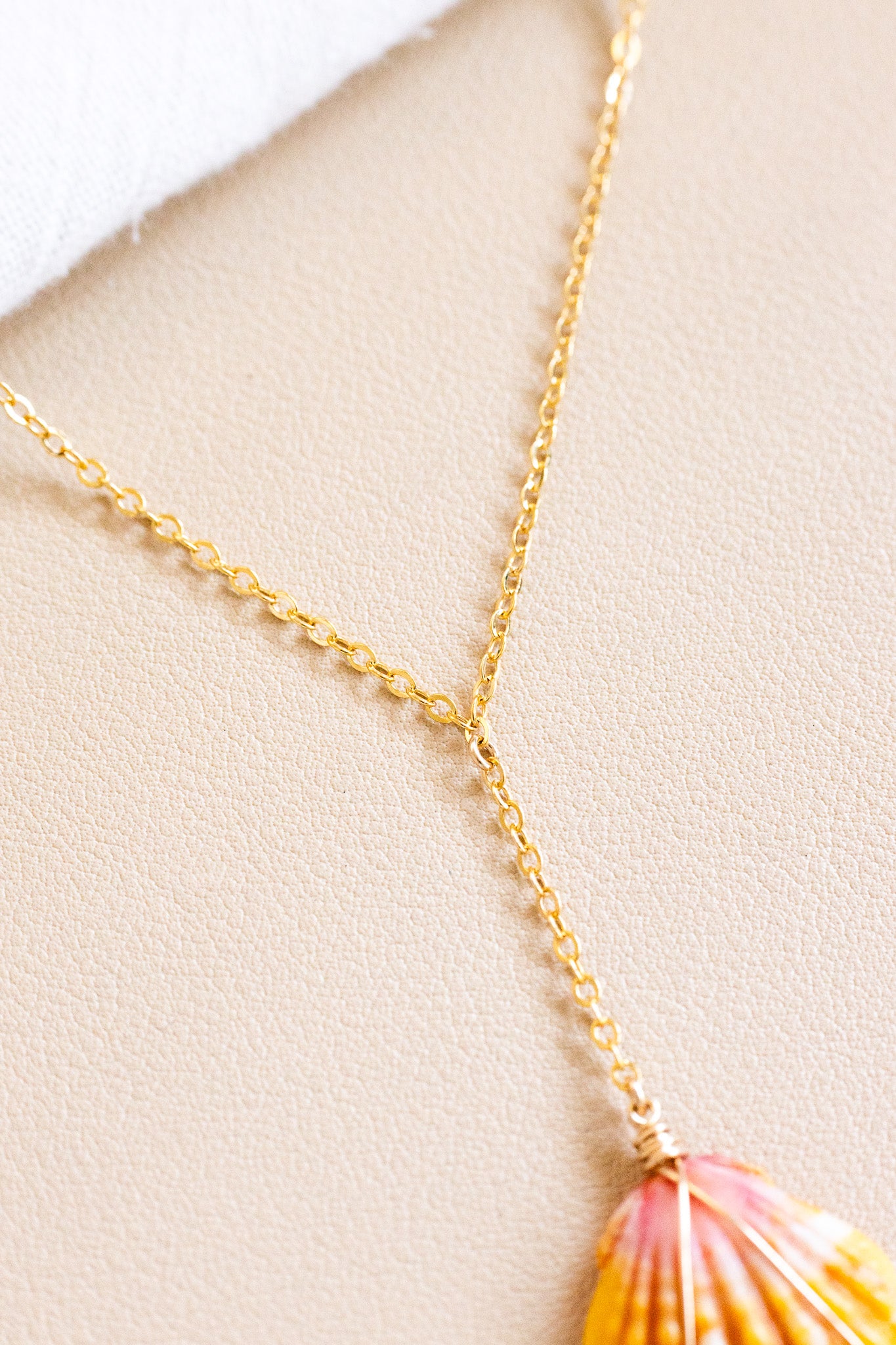 - 14k gold filled lariat chain style necklace with a 22mm medium-sized yellow-orange-pink sunrise shell