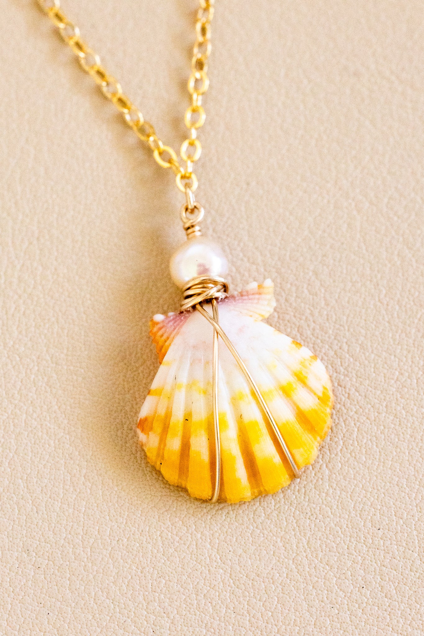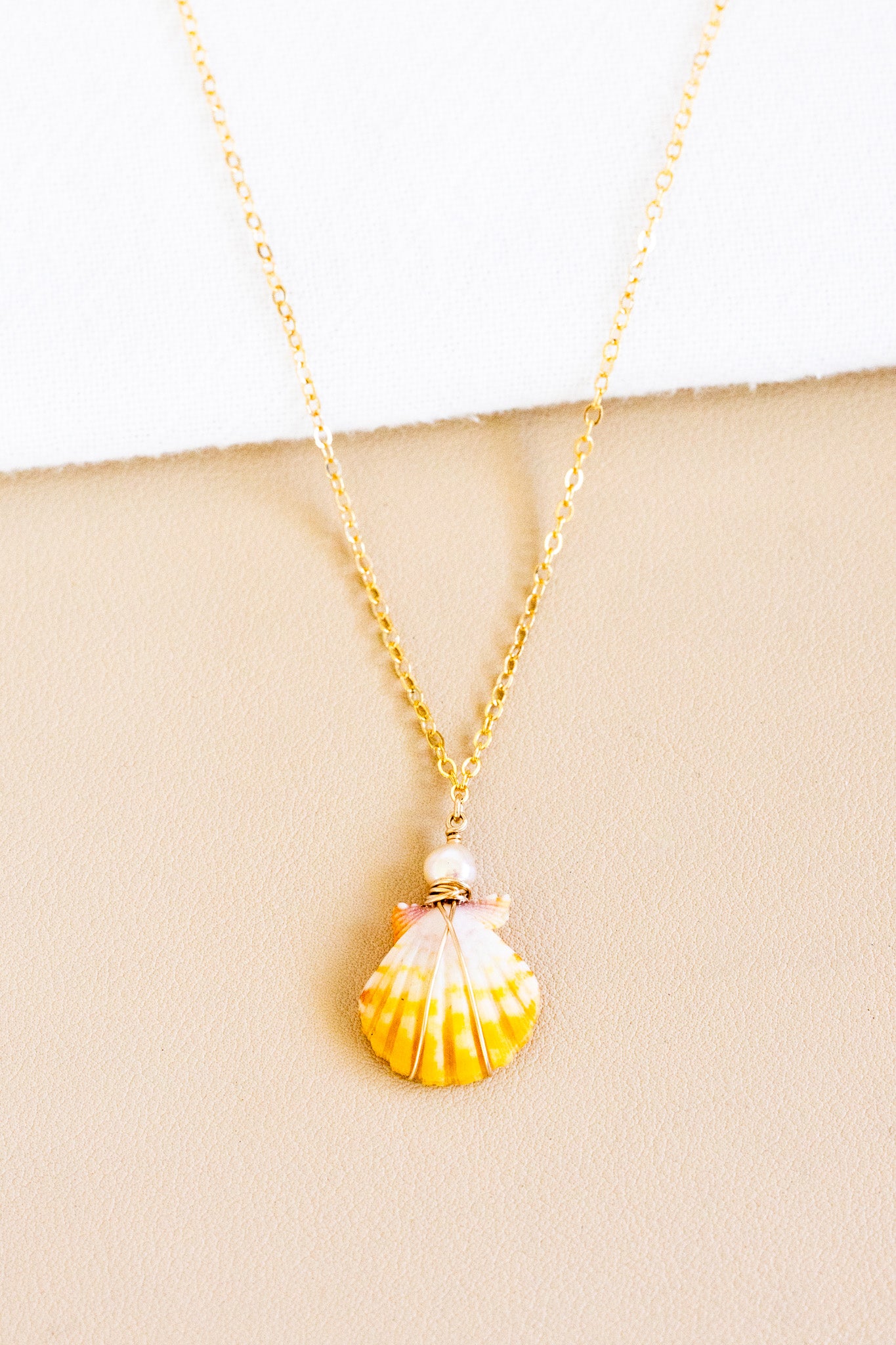 - 14k gold filled chain necklace with a 5mm light pale pink round freshwater pearl above a 18mm small-sized orange-white-pink striped sunrise shell