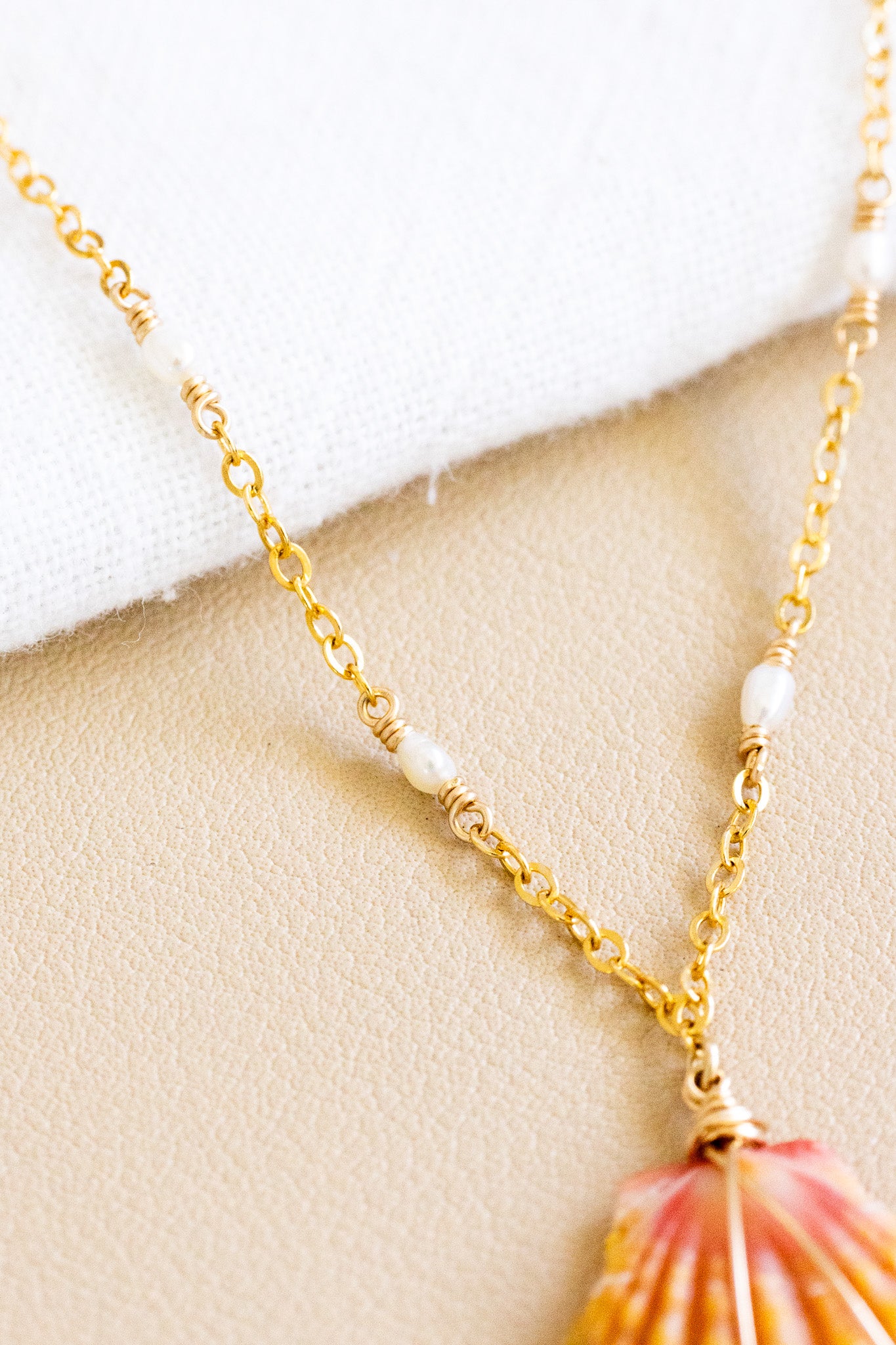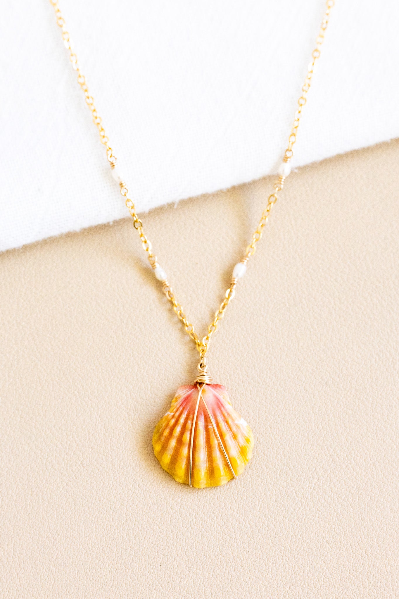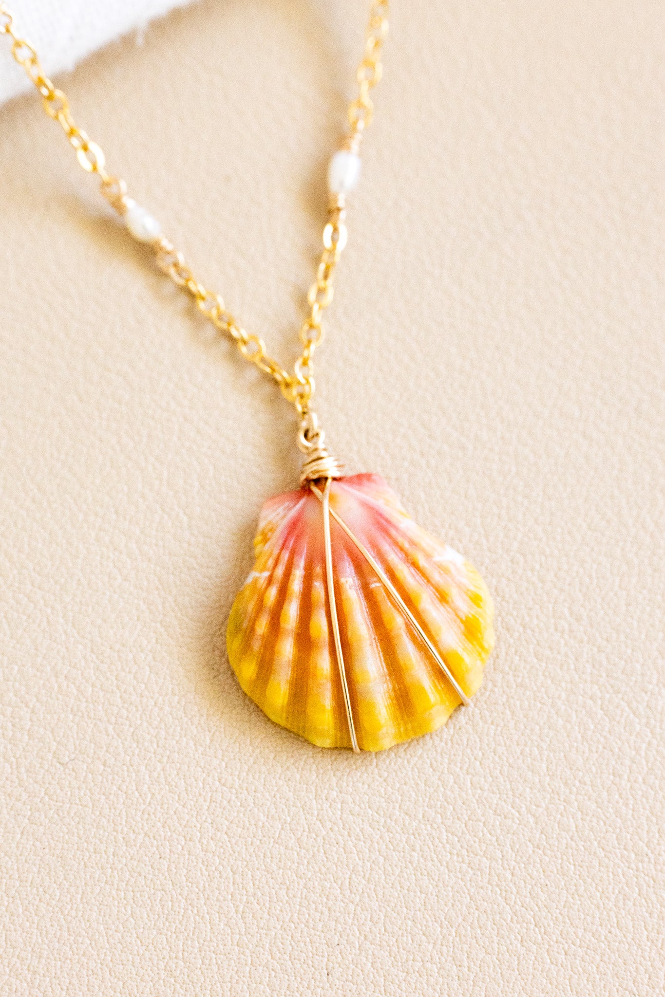 - 14k gold filled chain necklace with a 21mm medium-sized yellow-orange-pink sunrise shell and four 2.5-3mm mini freshwater pearls