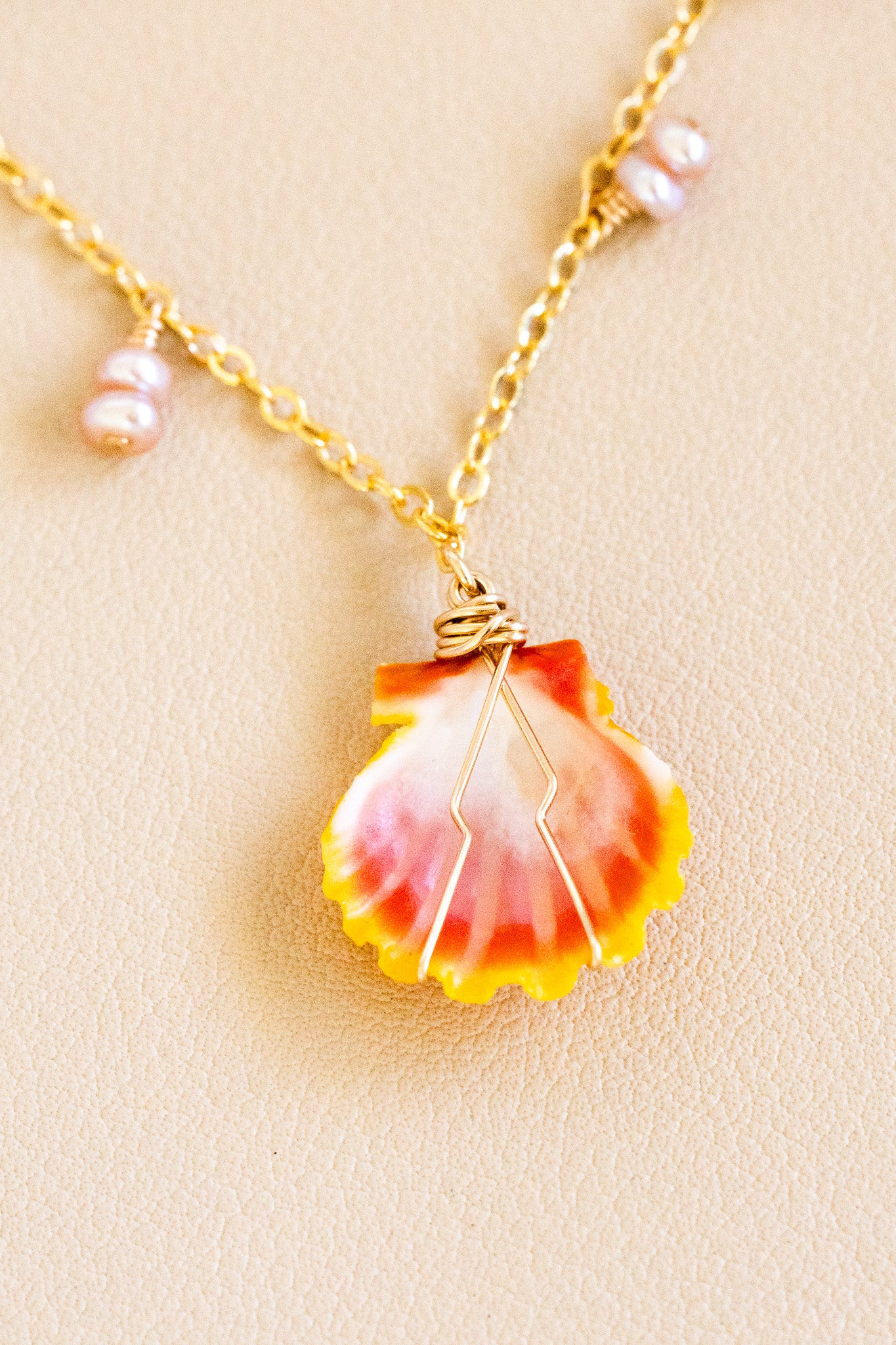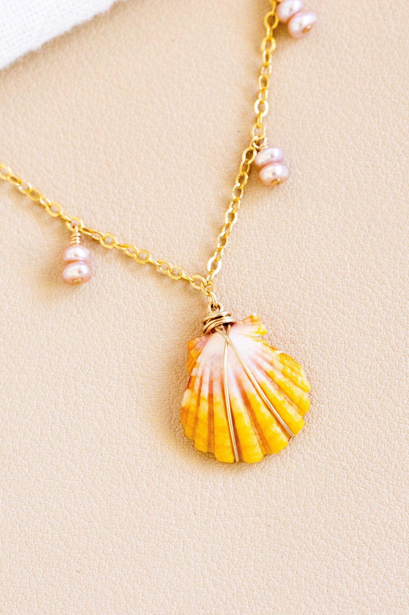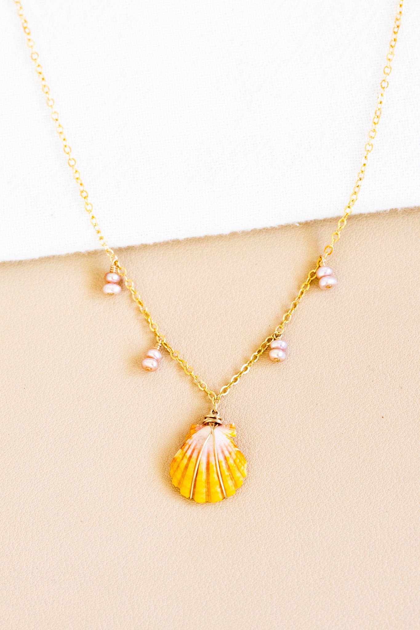 - 14k gold filled chain necklace with a 17mm small-sized orange-pink-white sunrise shell in between four sets of two 2-3mm mini button-shaped pink freshwater pearl stacks