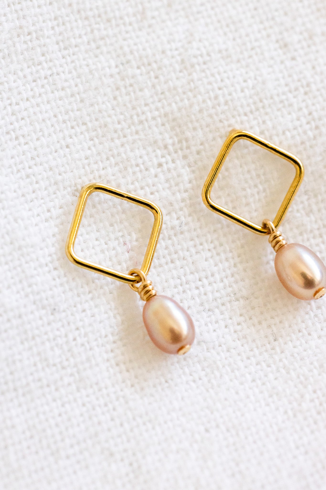 • 14k gold filled geometric studs with 5mm pink freshwater pearls