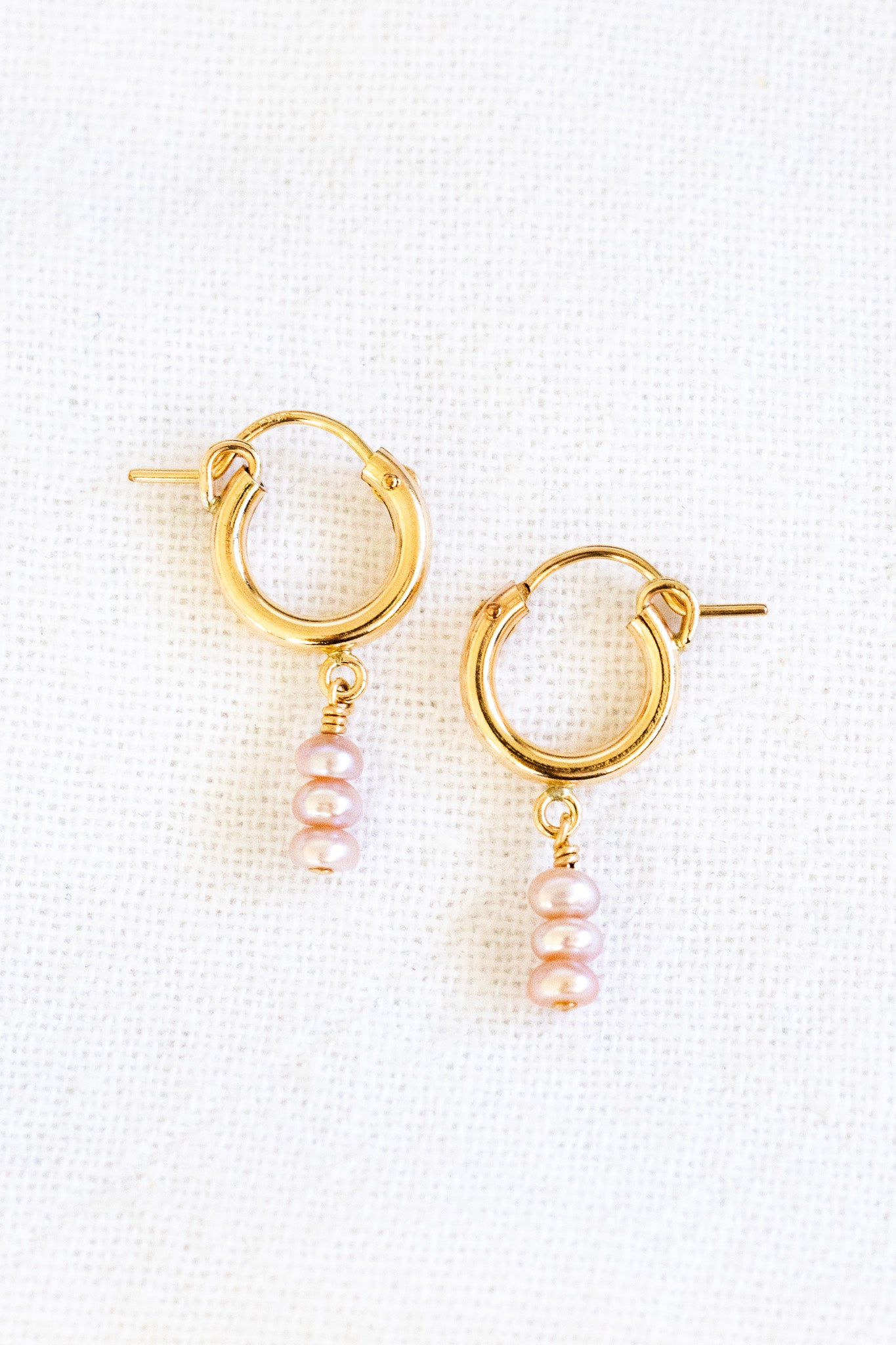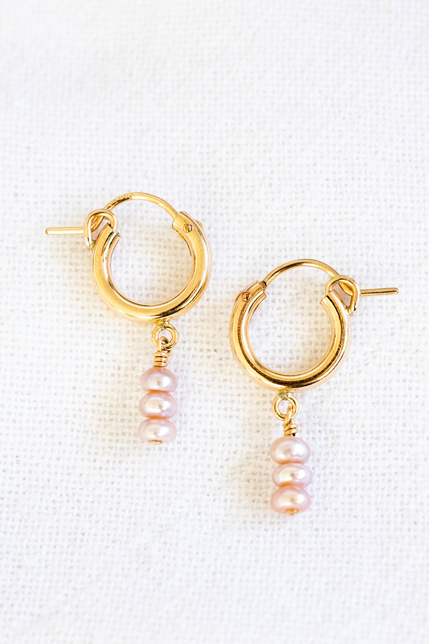 - 14k gold filled 12mm huggie hoops with 2.5mm x 3.5mm mini pink button shaped freshwater pearls