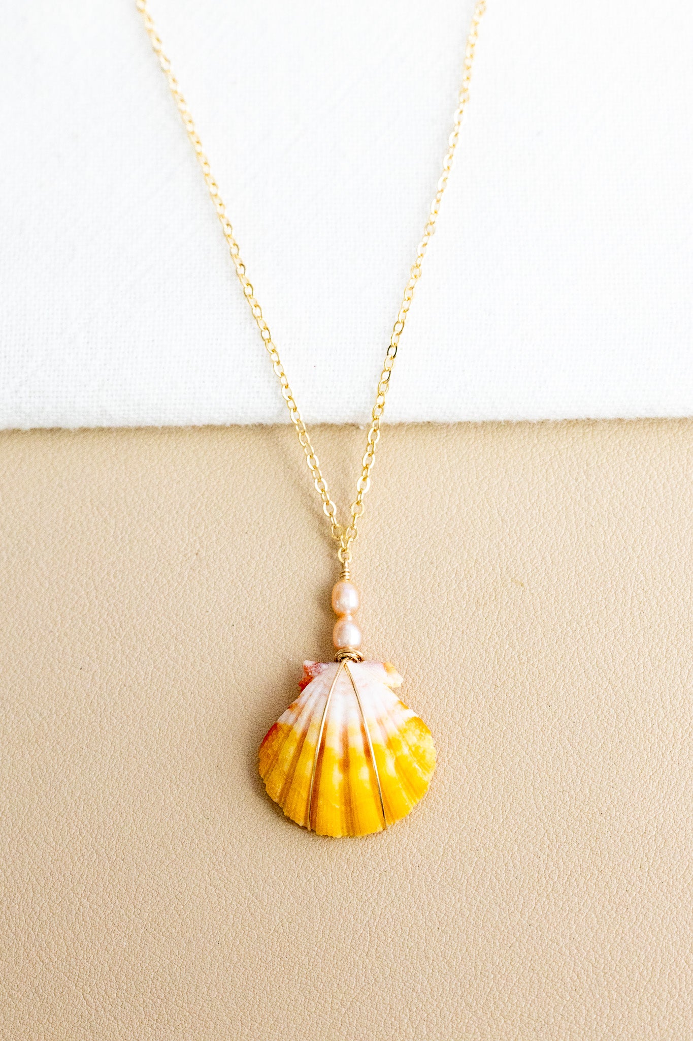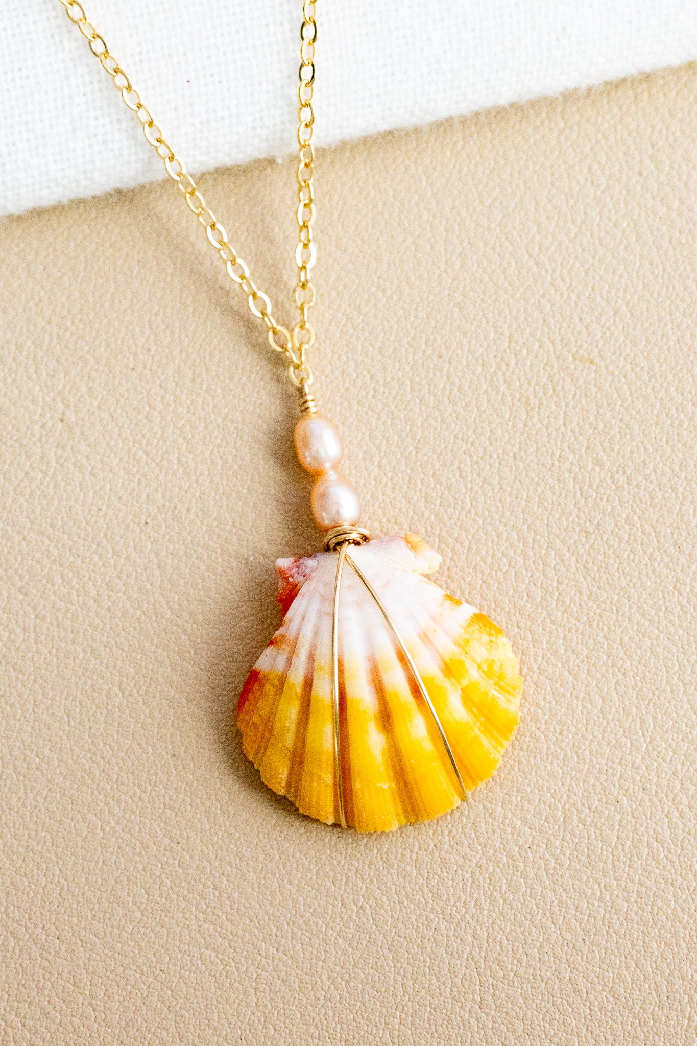 - 14k gold filled chain necklace with two 4mm x 5mm pink oval shaped freshwater pearls above a 24mm medium pale orange-white Sunrise Shell