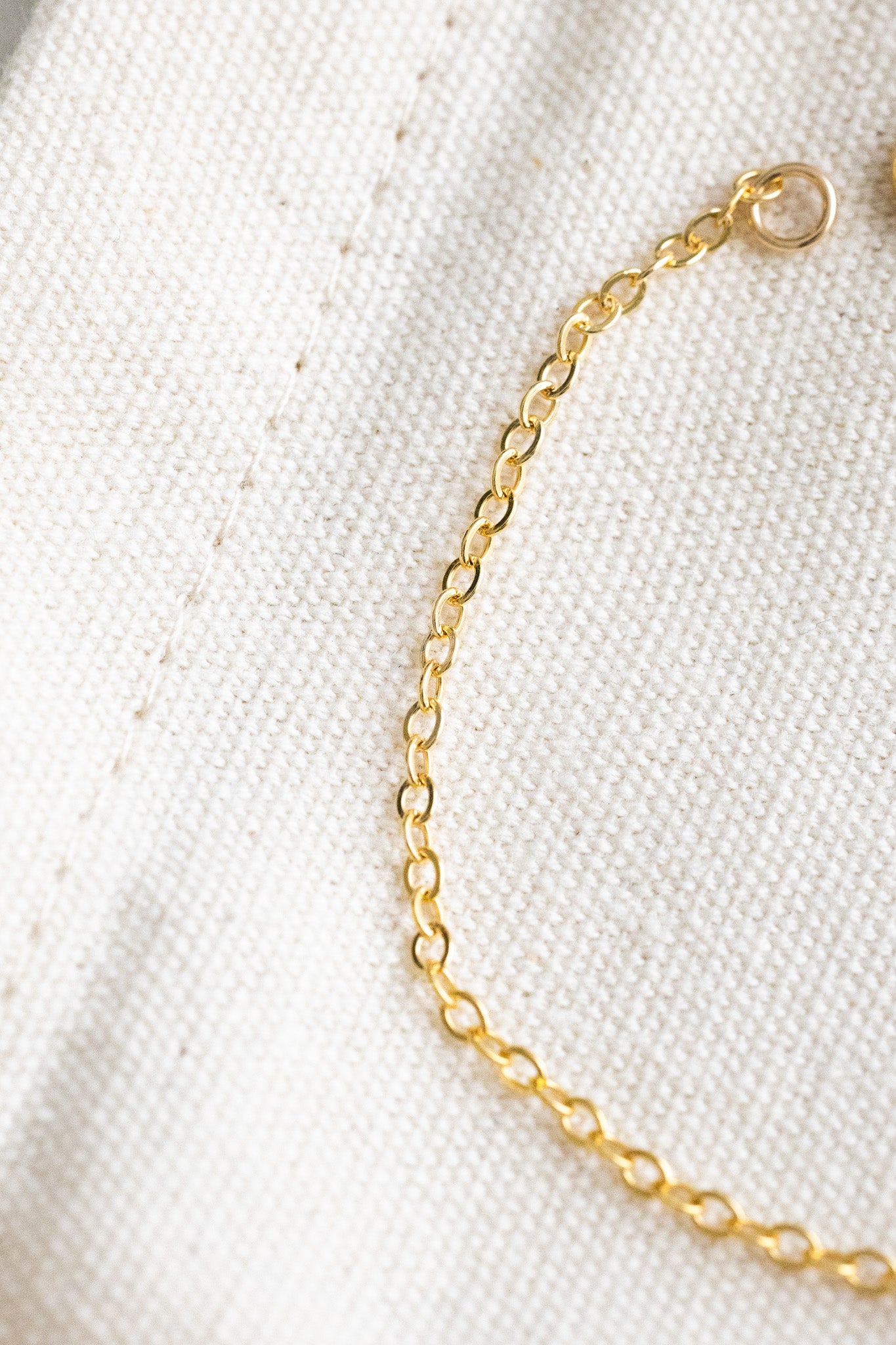 - 14k gold filled dainty chain bracelet with a 6mm x 7mm keshi freshwater pearl in between two 2.5mm gold filled beads