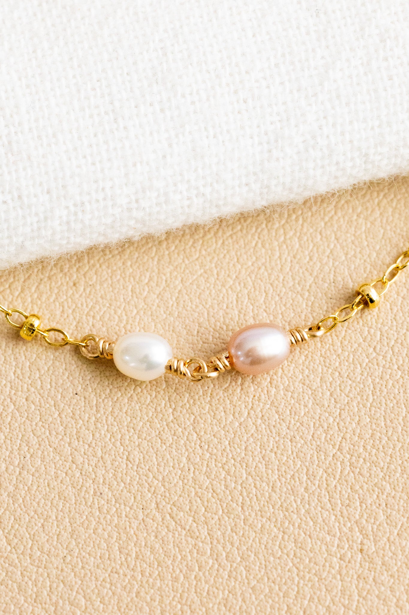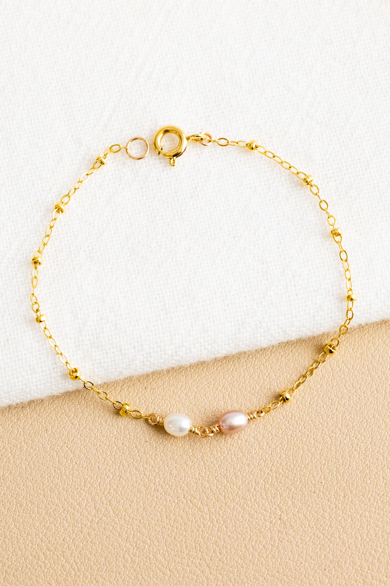 • 14k gold filled dainty satellite chain bracelet with a 5mm small freshwater pearl and pink freshwater pearl
