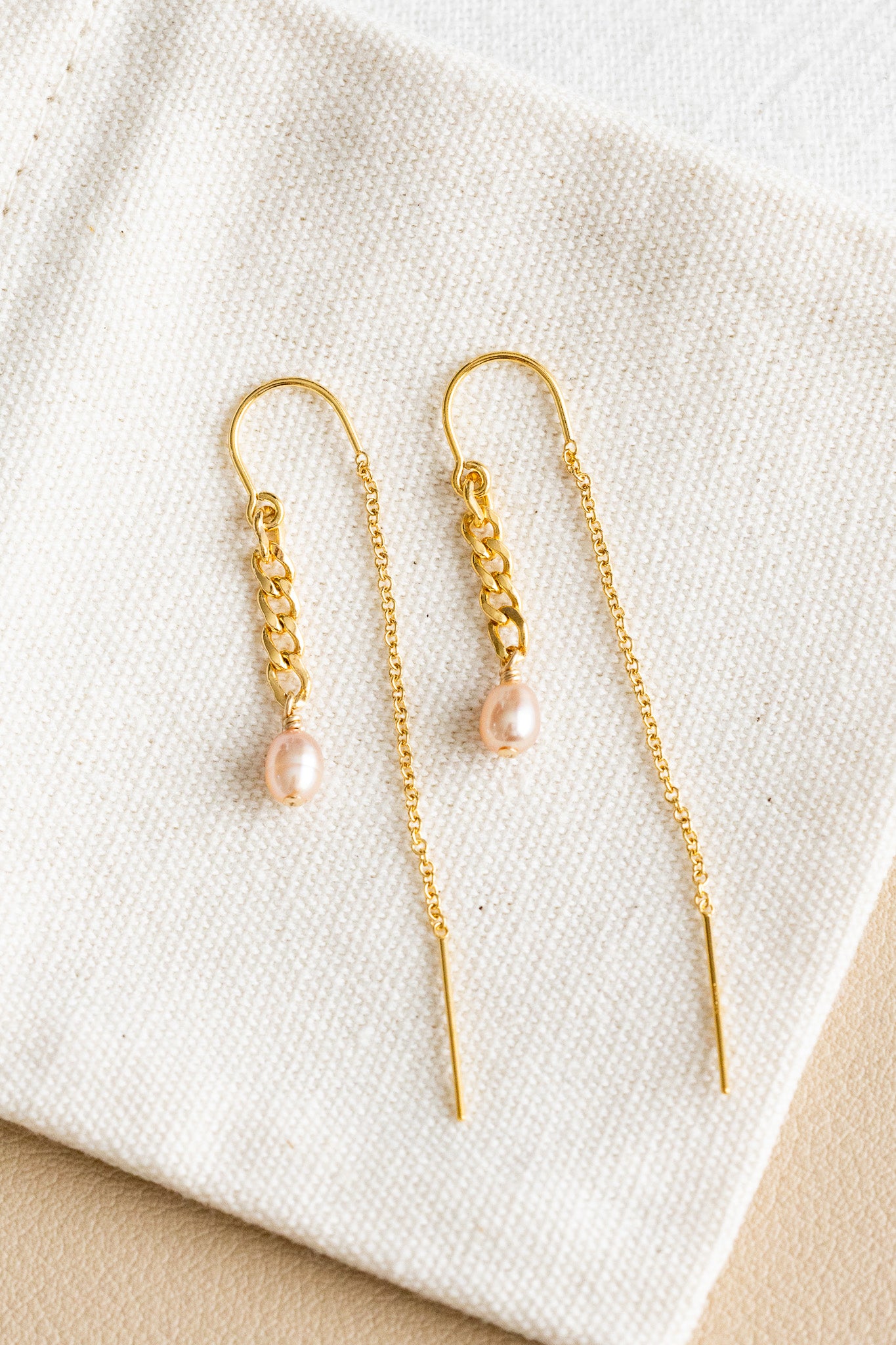 - 14k gold filled U ear threaders with curb chain drops and pink freshwater pearls