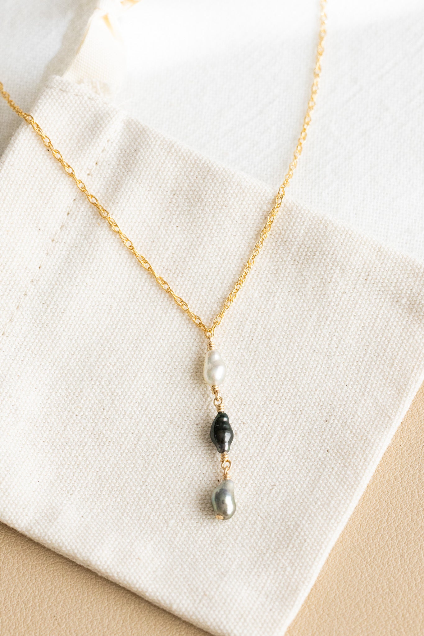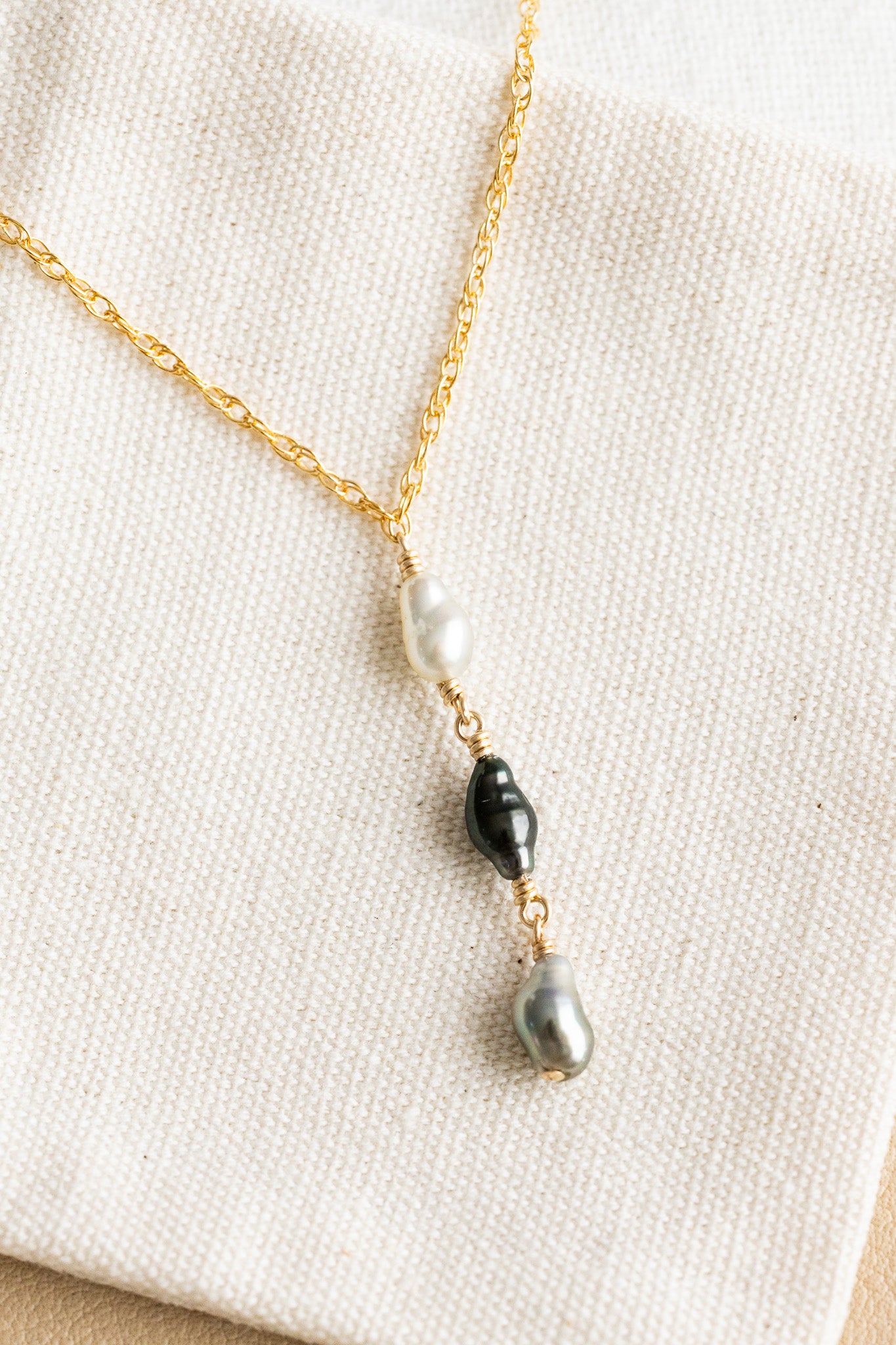 - 14k gold filled dainty rope necklace with a 7mm light keshi tahitian pearl, a 9mm dark keshi tahitian pearl, and an 8mm medium-dark keshi tahitian pearl