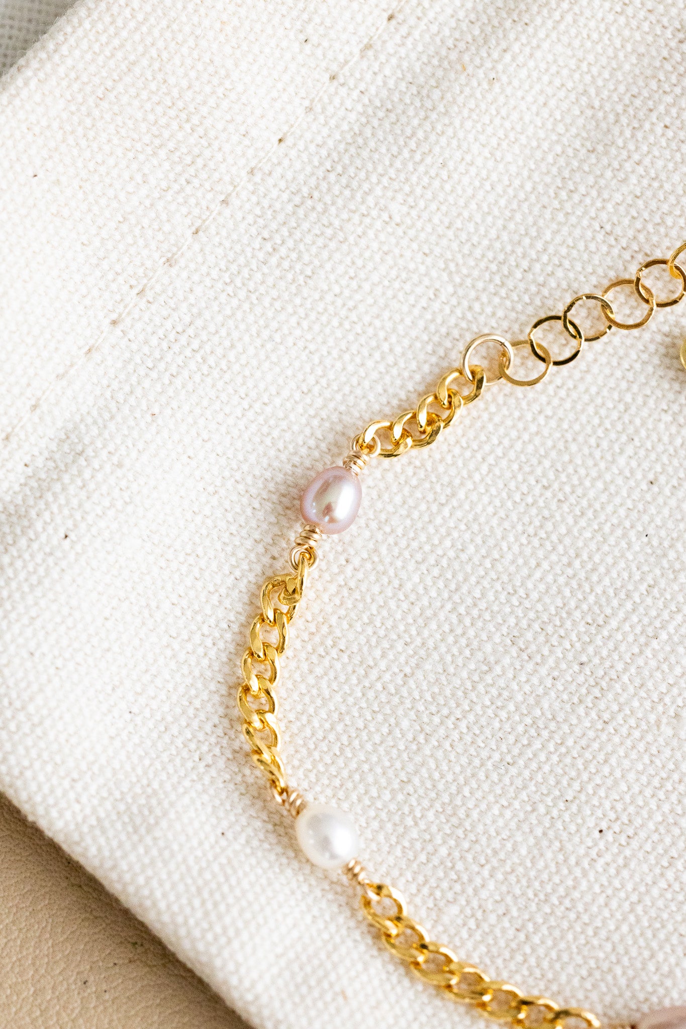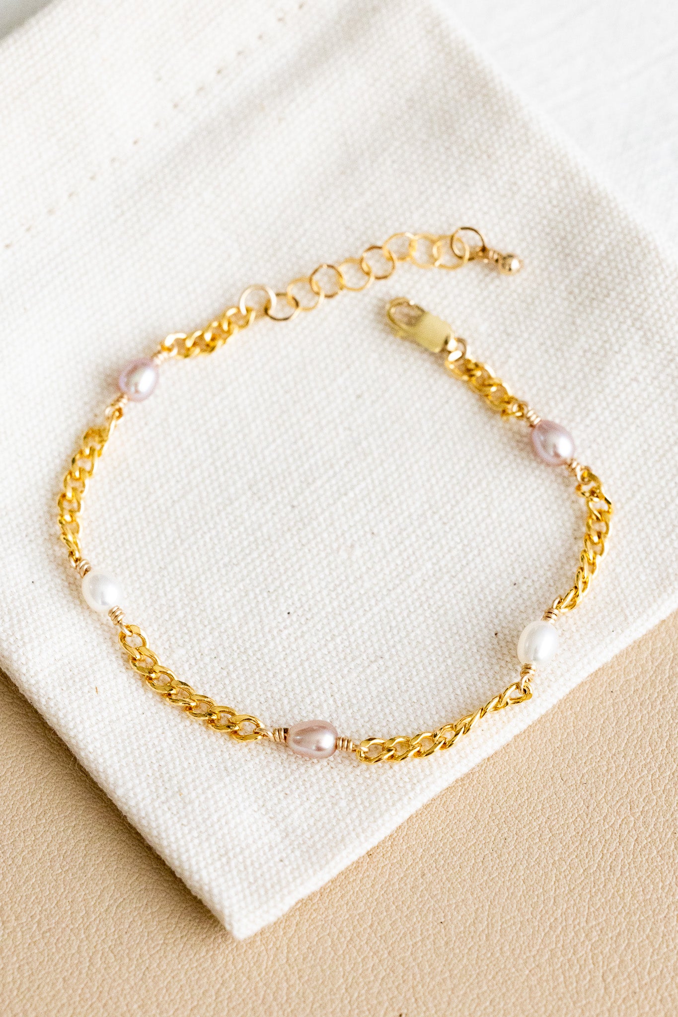 - 14k gold filled curb chain bracelet with two 3.5mm x 4mm white freshwater pearls and three 4mm x 5mm mauve freshwater pearls