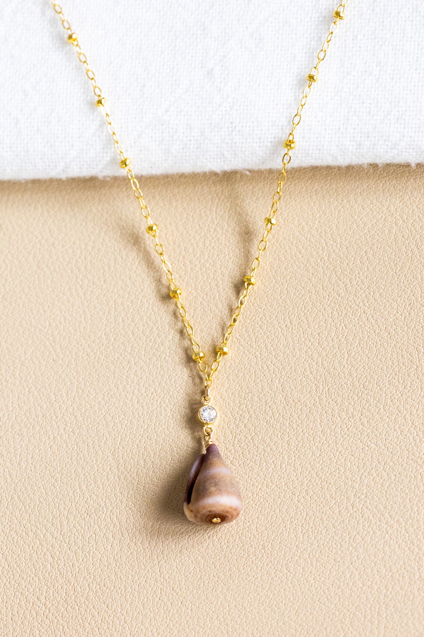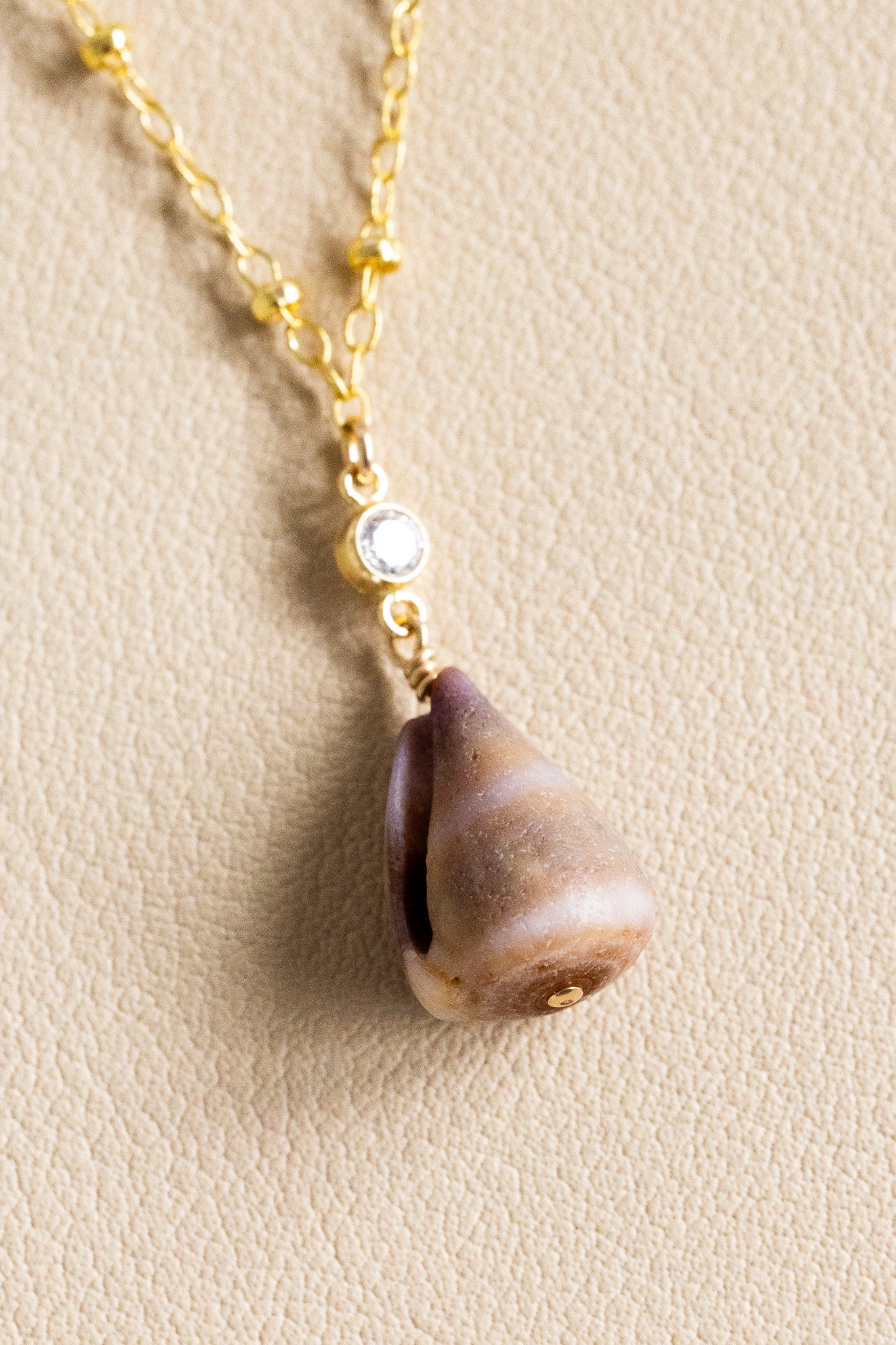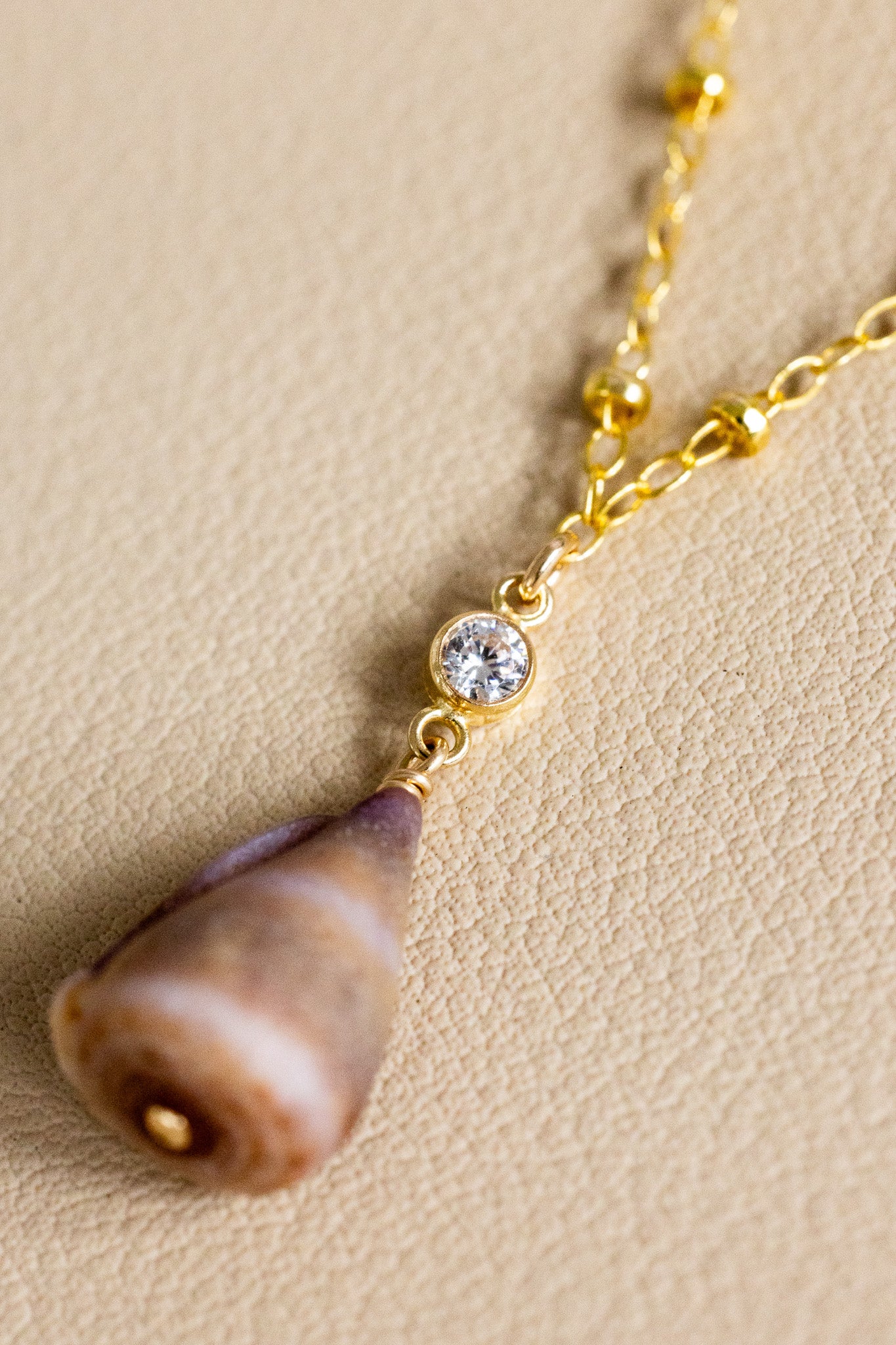 • 14k gold filled satellite chain necklace with a 3mm cubic zirconia connector above what is believed to be a 14mm Olive-Green Cone Shell