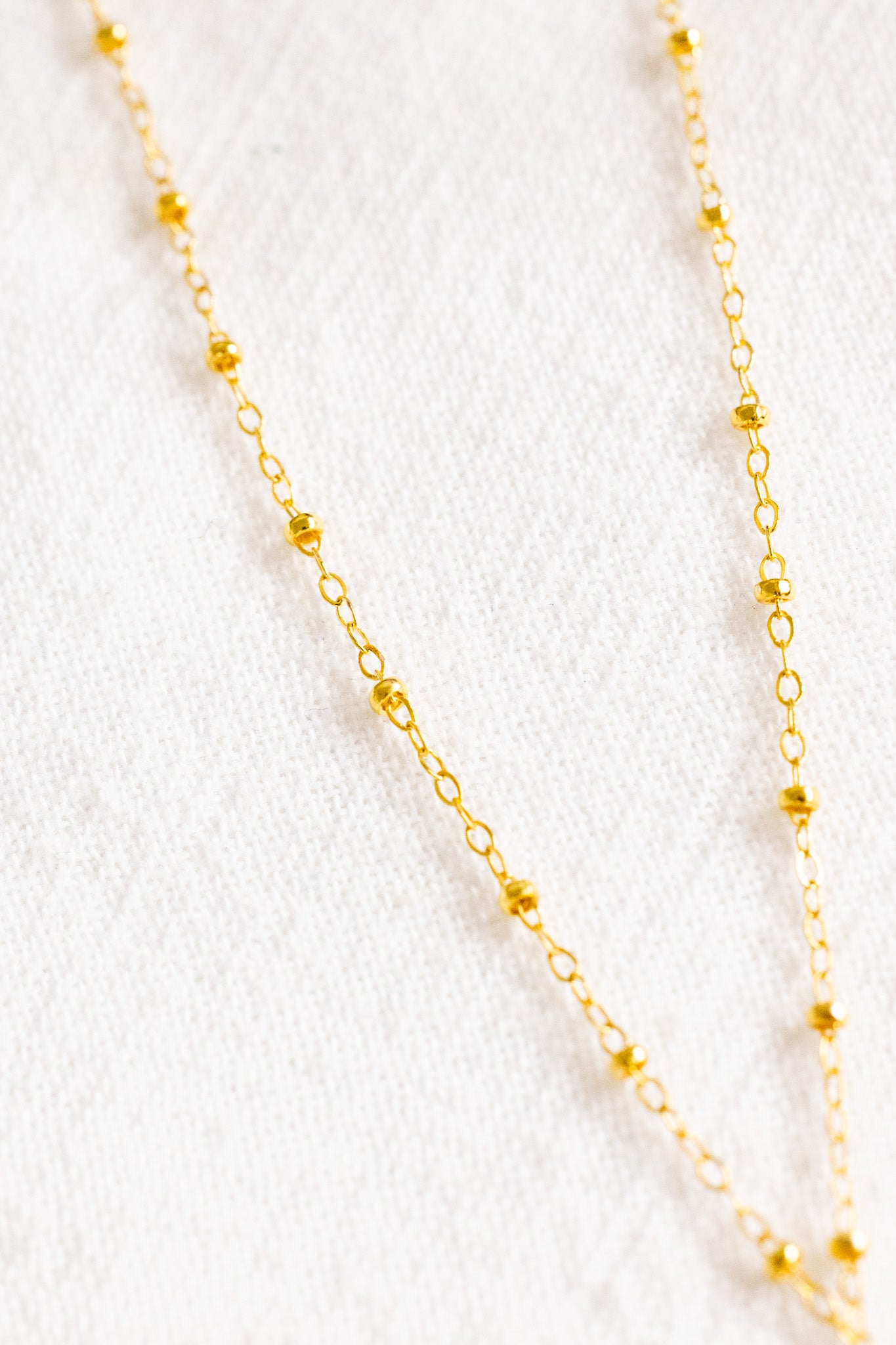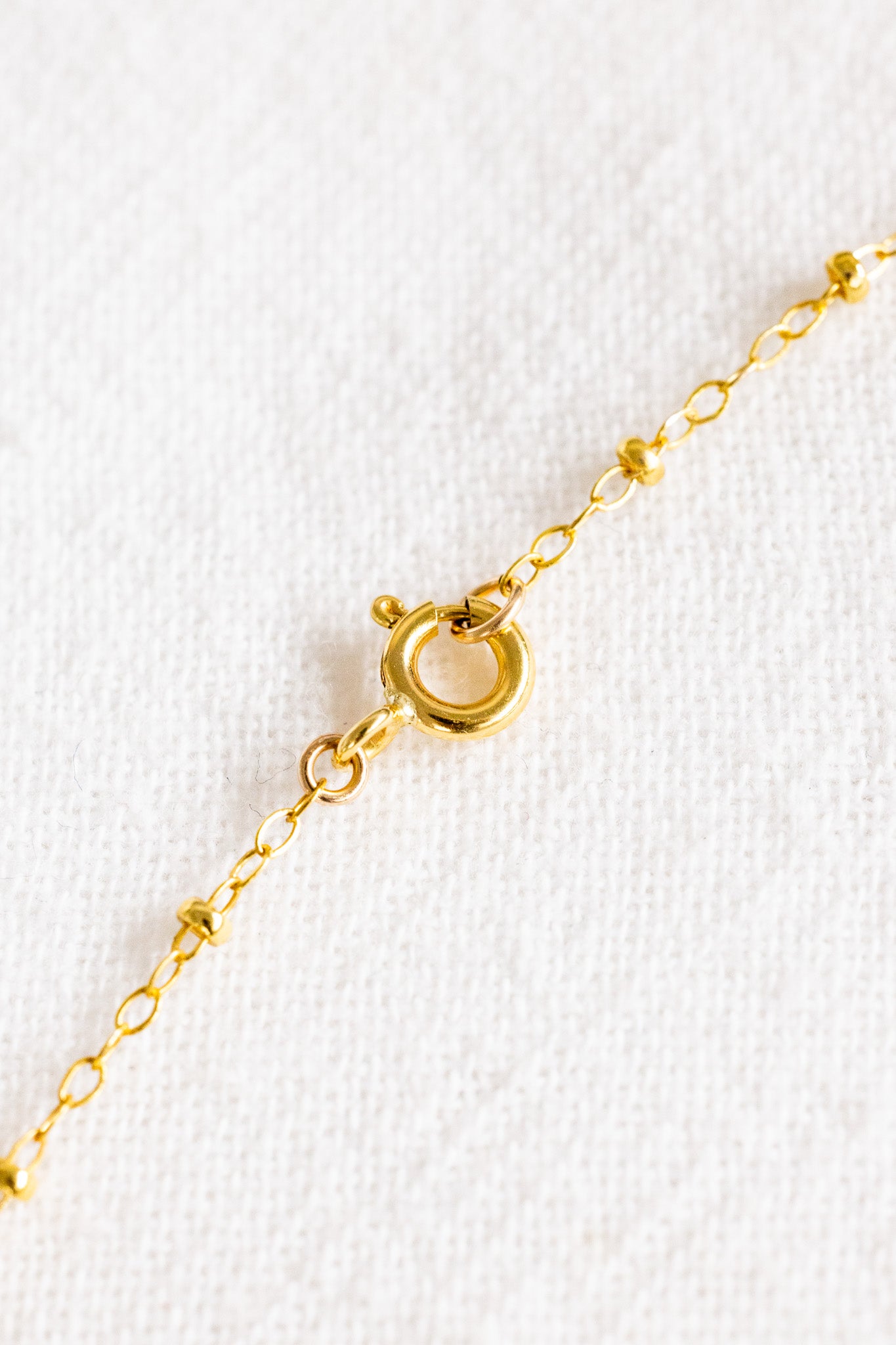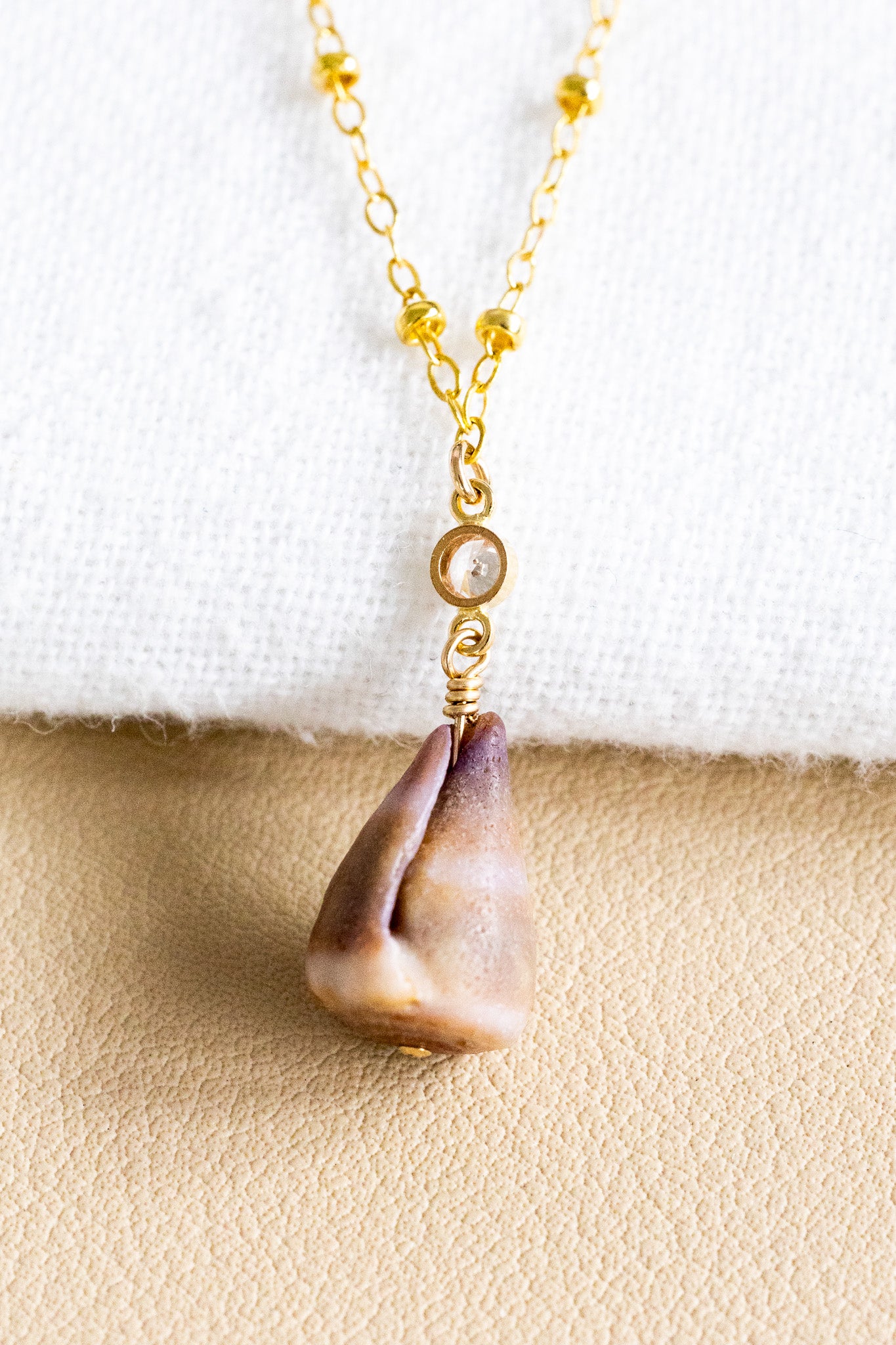 • 14k gold filled satellite chain necklace with a 3mm cubic zirconia connector above what is believed to be a 14mm Olive-Green Cone Shell