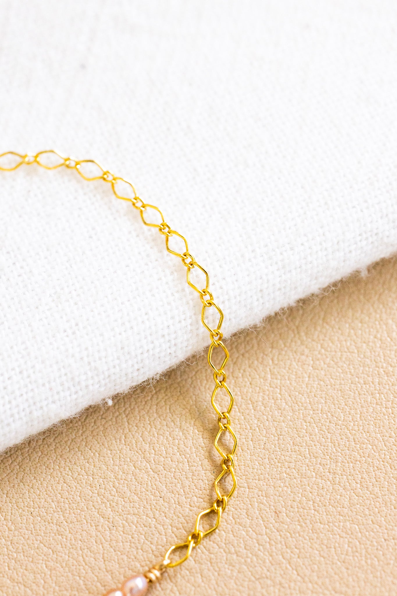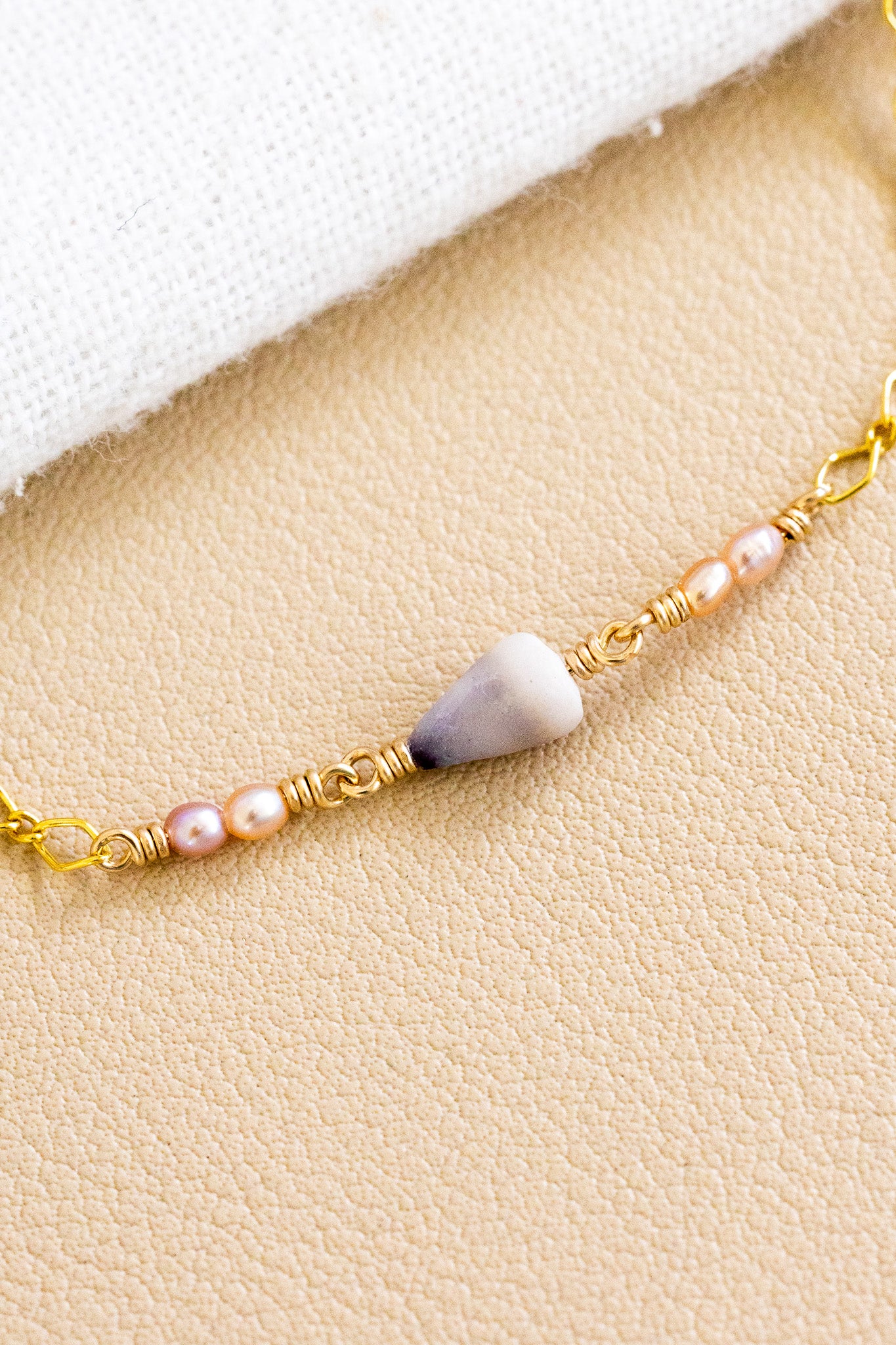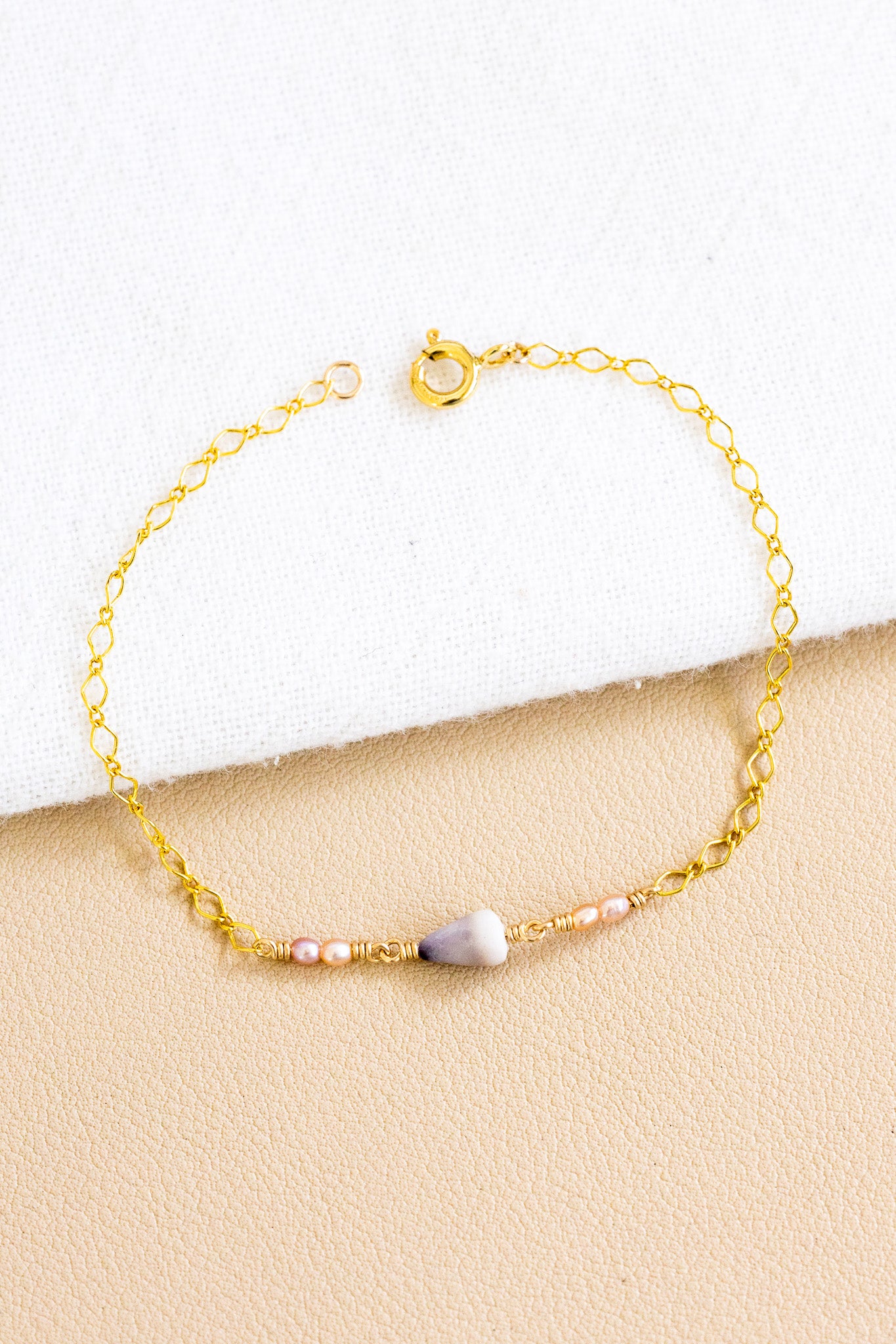 - Dainty 14k gold filled marquise link chain bracelet with a 7mm indigo-colored Dwarf Cone Shell in between two 2mm x 2.5mm mini rice/oval shaped light pink freshwater pearls on each side