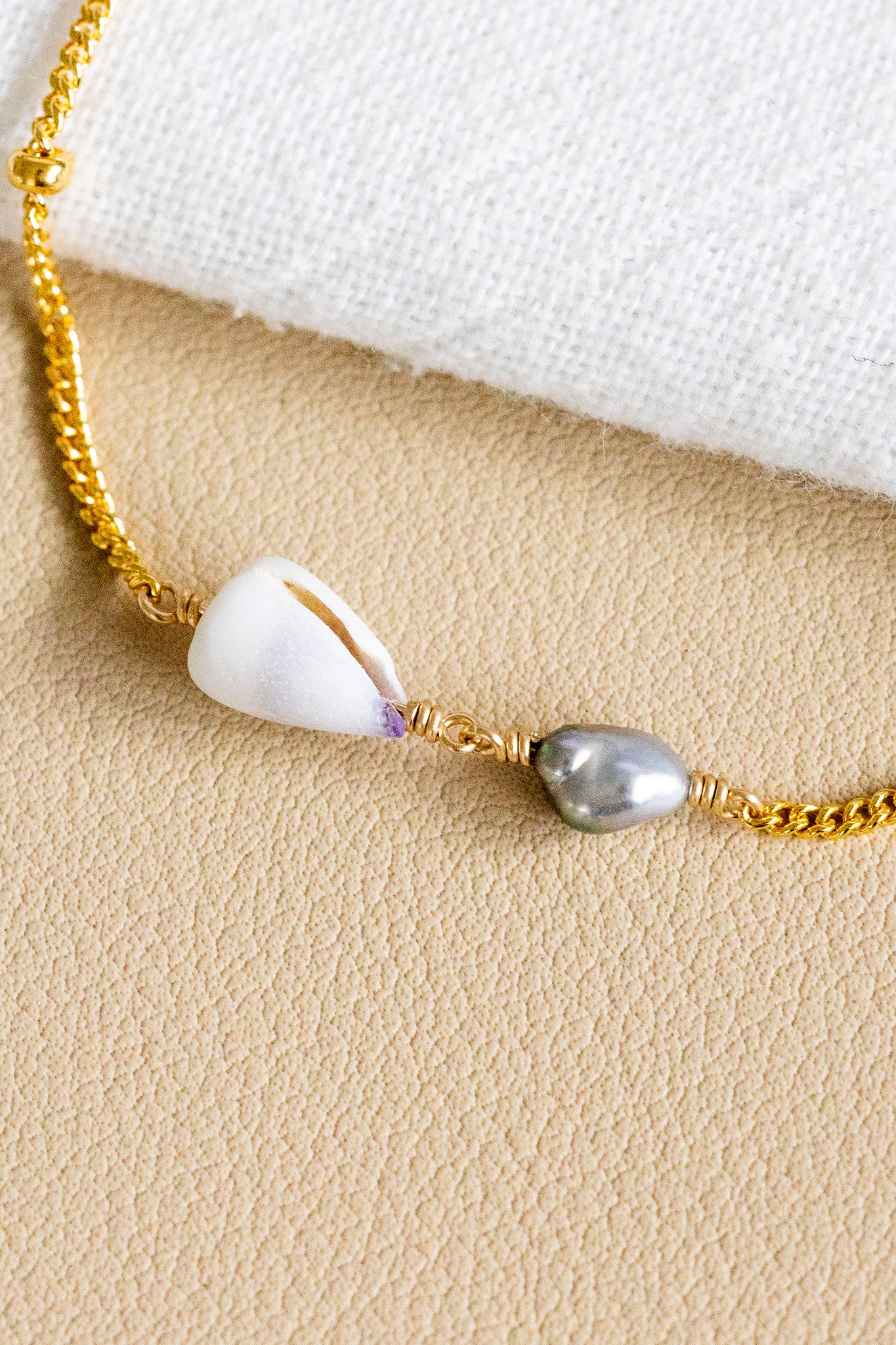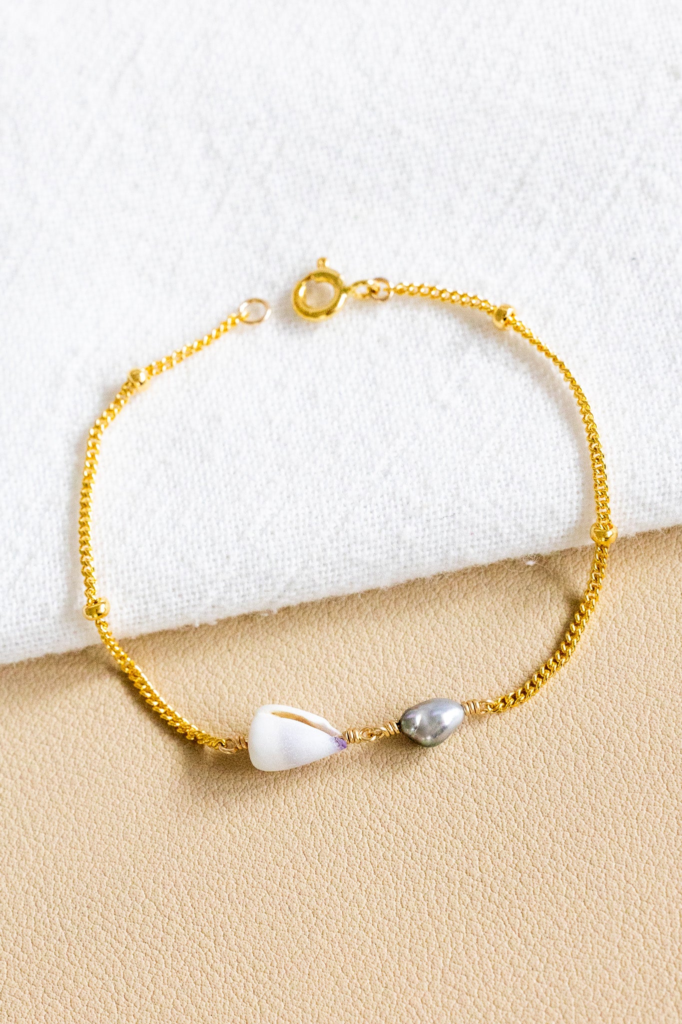 - 14k gold filled satellite chain bracelet with a 9mm indigo-colored Dwarf Cone Shell and a 5mm x 6mm keshi Tahitian pearl