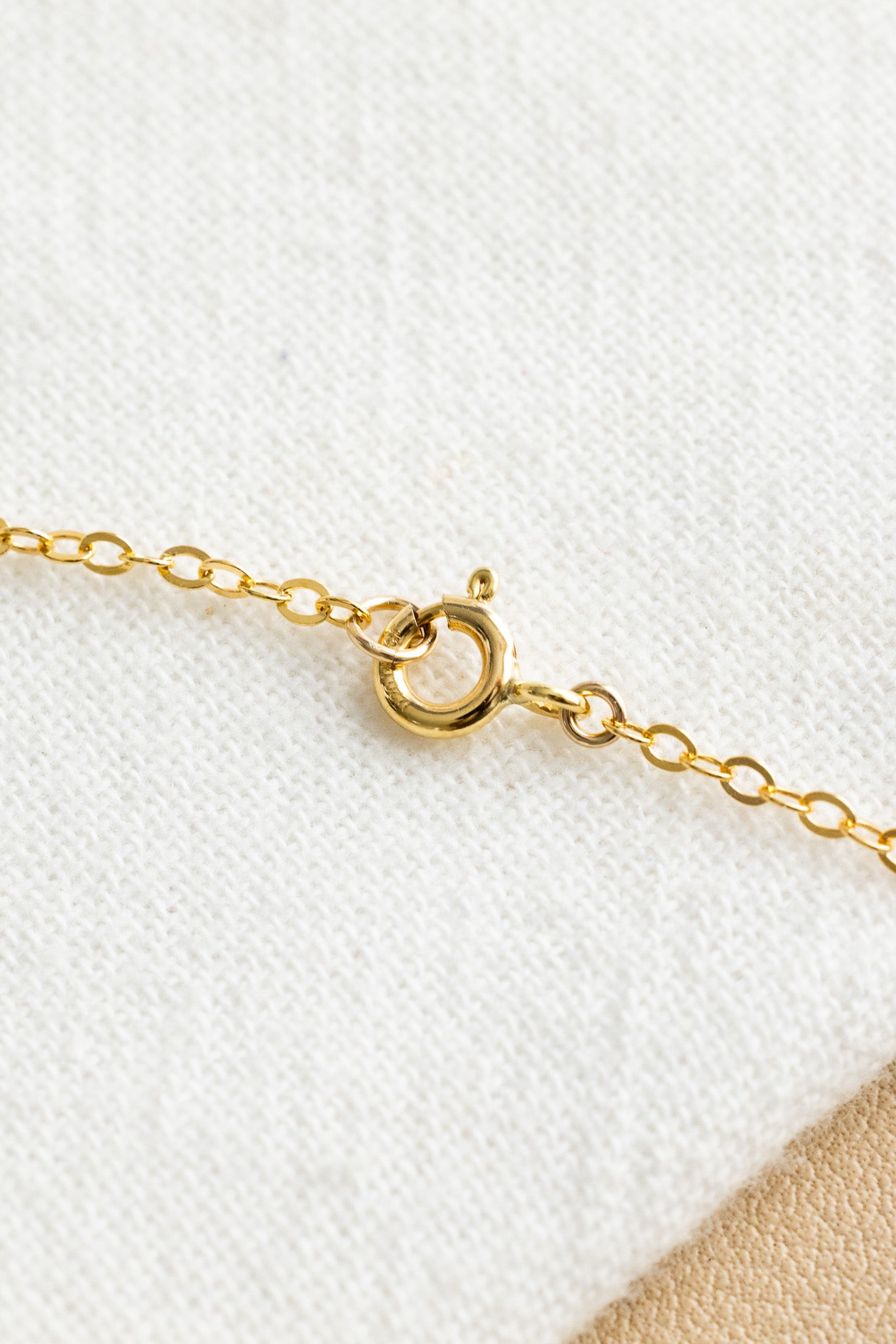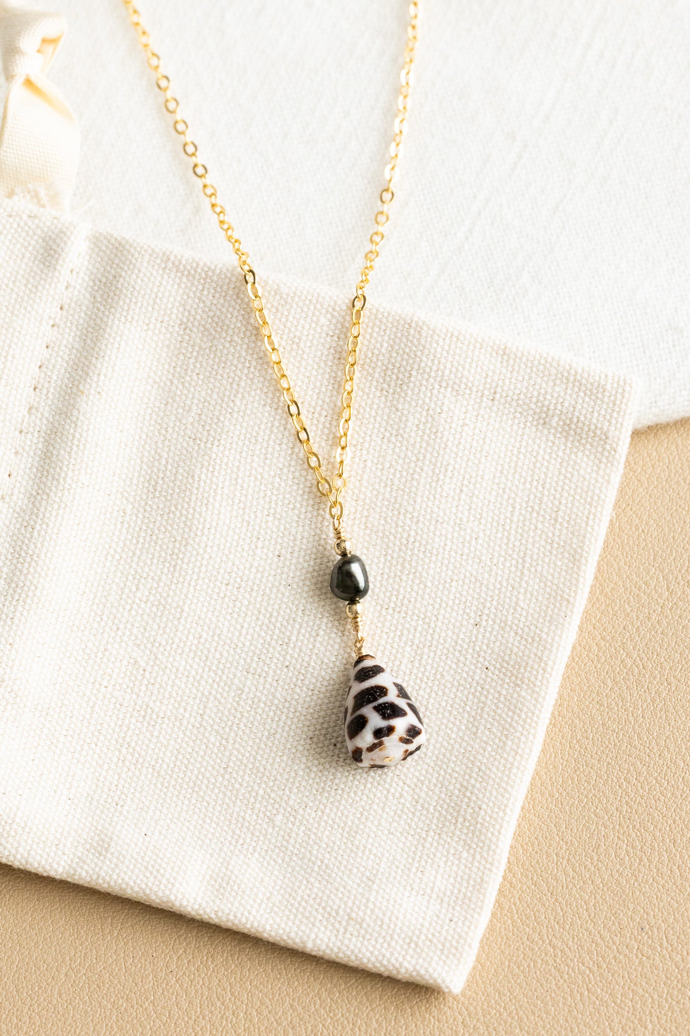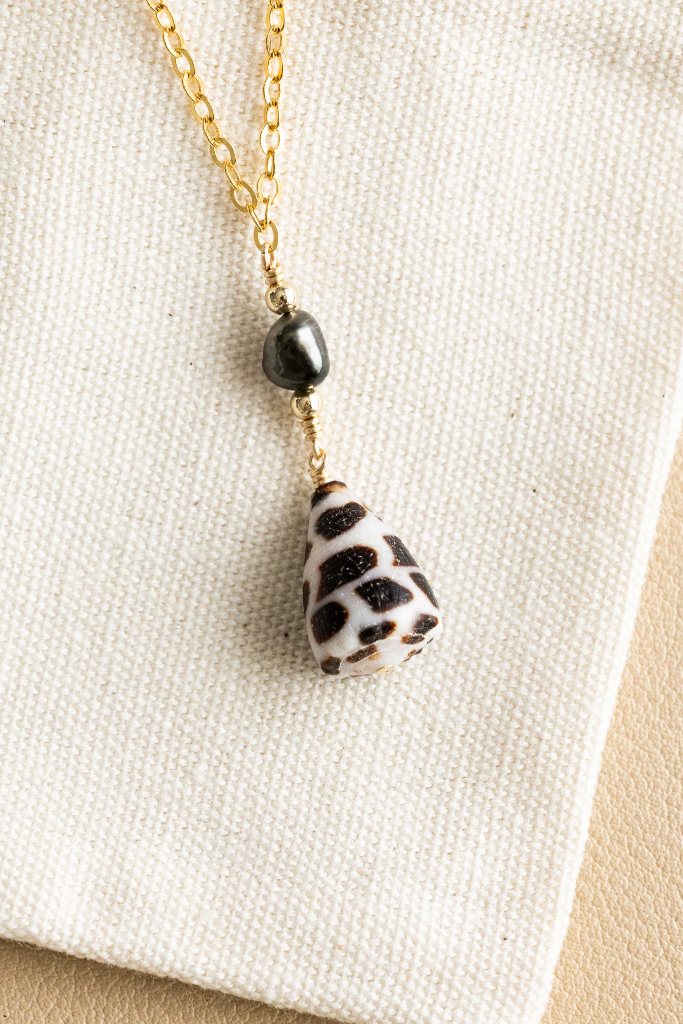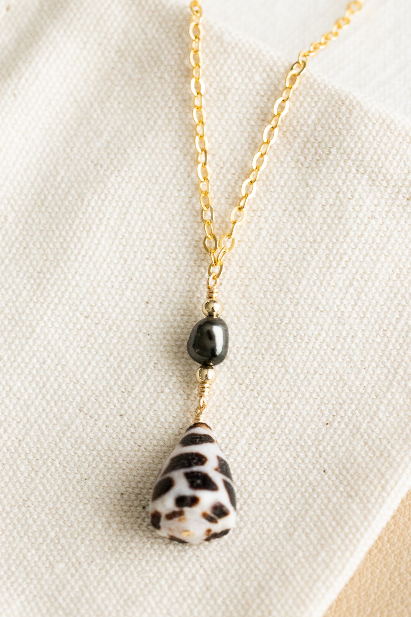 - 14k gold filled dainty necklace with a small-sized hebrew cone shell, a 4mm keshi tahitian pearl, and 2.5mm gold filled beads