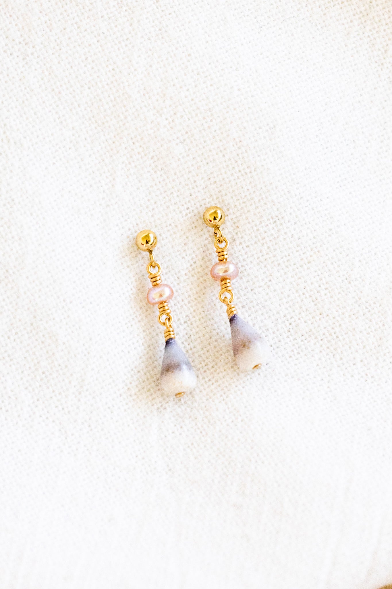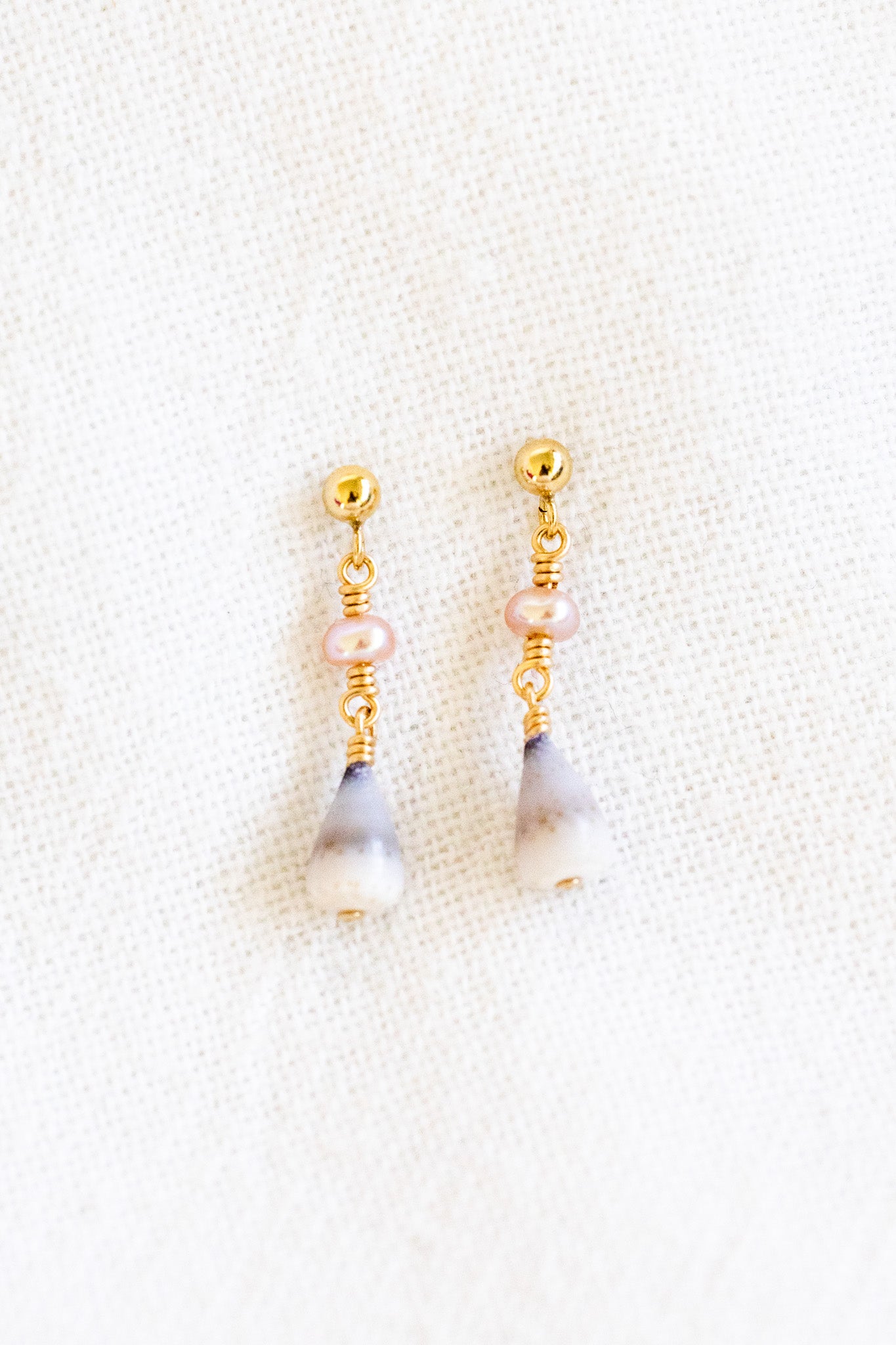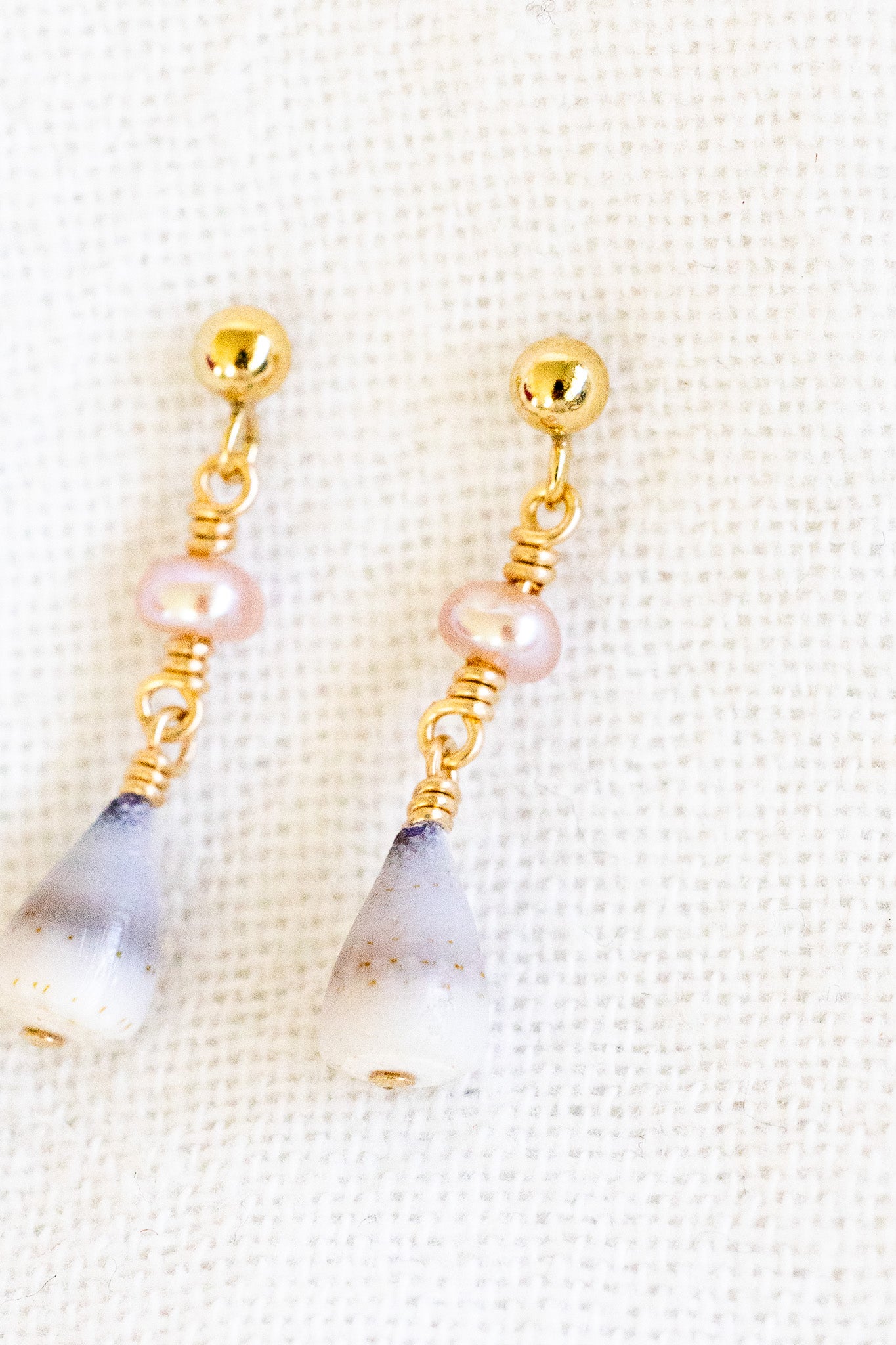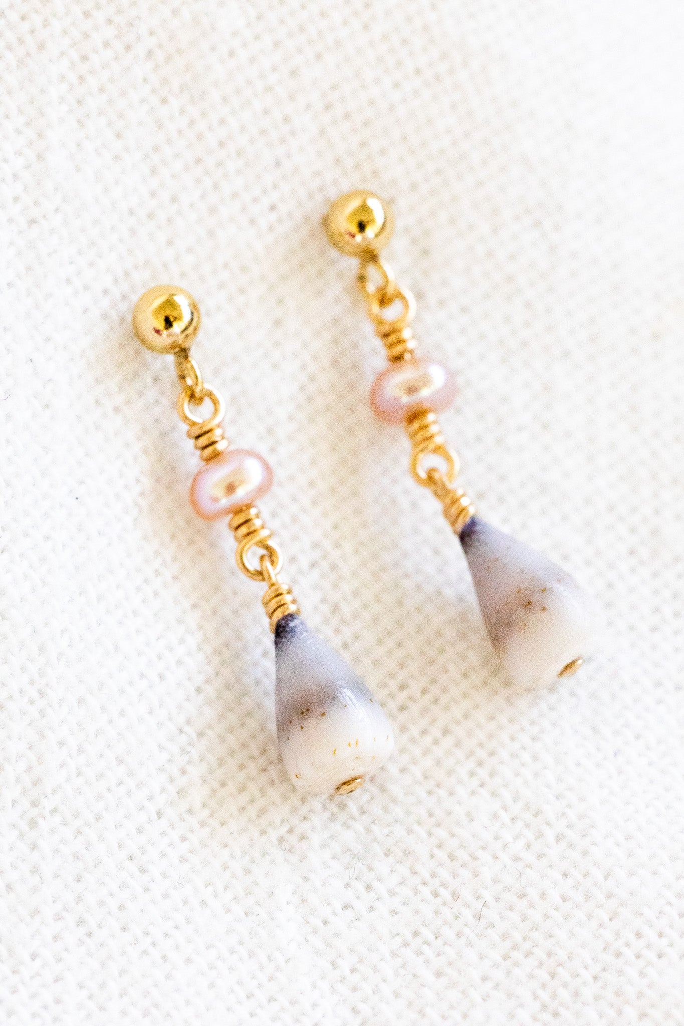 - 14k gold filled 3mm mini ball studs with 2.5mm x 3.5mm mini pink button-shaped freshwater pearls above 7.5-8mm Dwarf Cone Shells