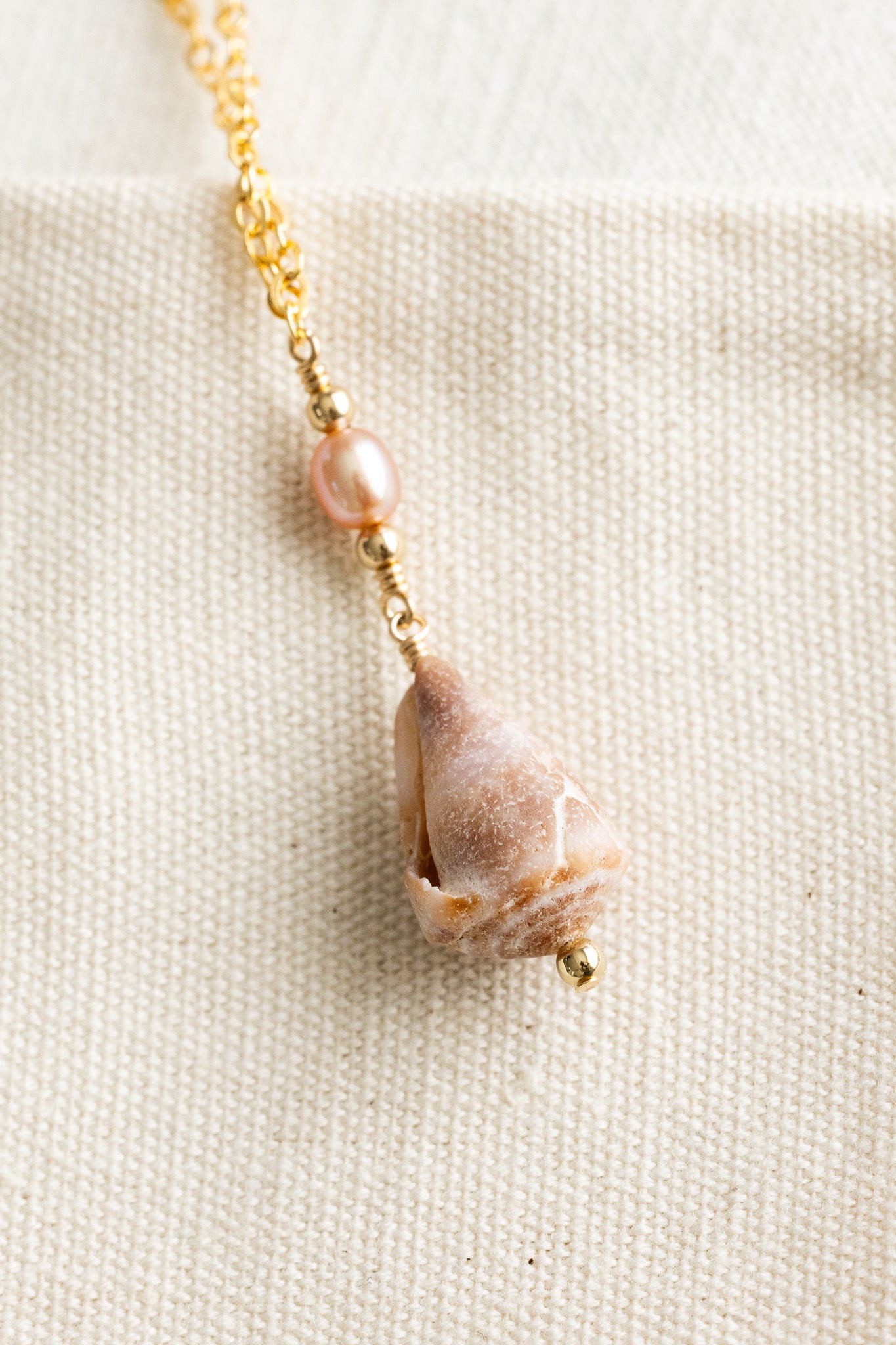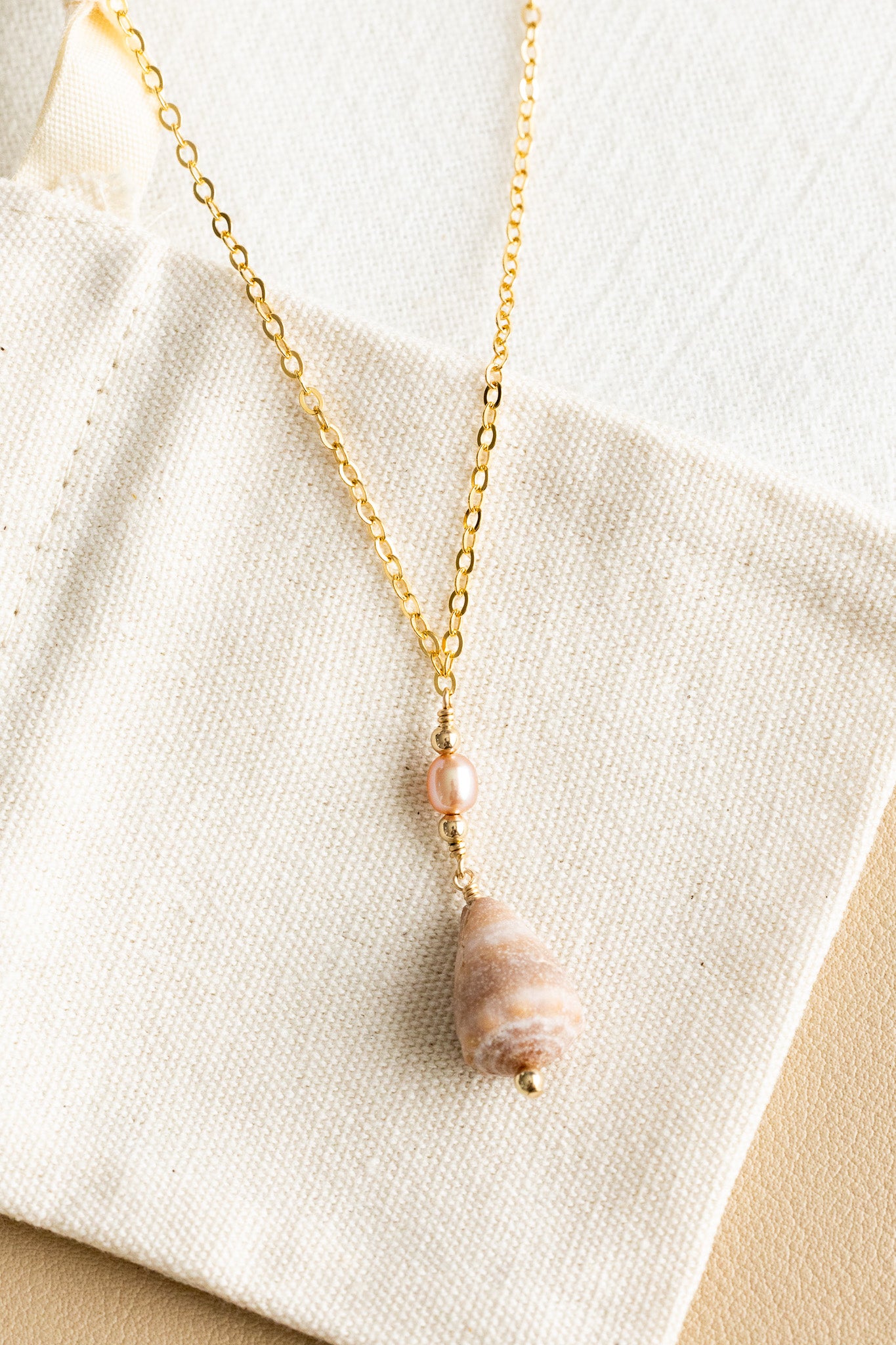- 14k gold filled dainty necklace with a medium-size brown & white cone shell, a 4mm pink freshwater pearl, and 2.5mm gold filled beads