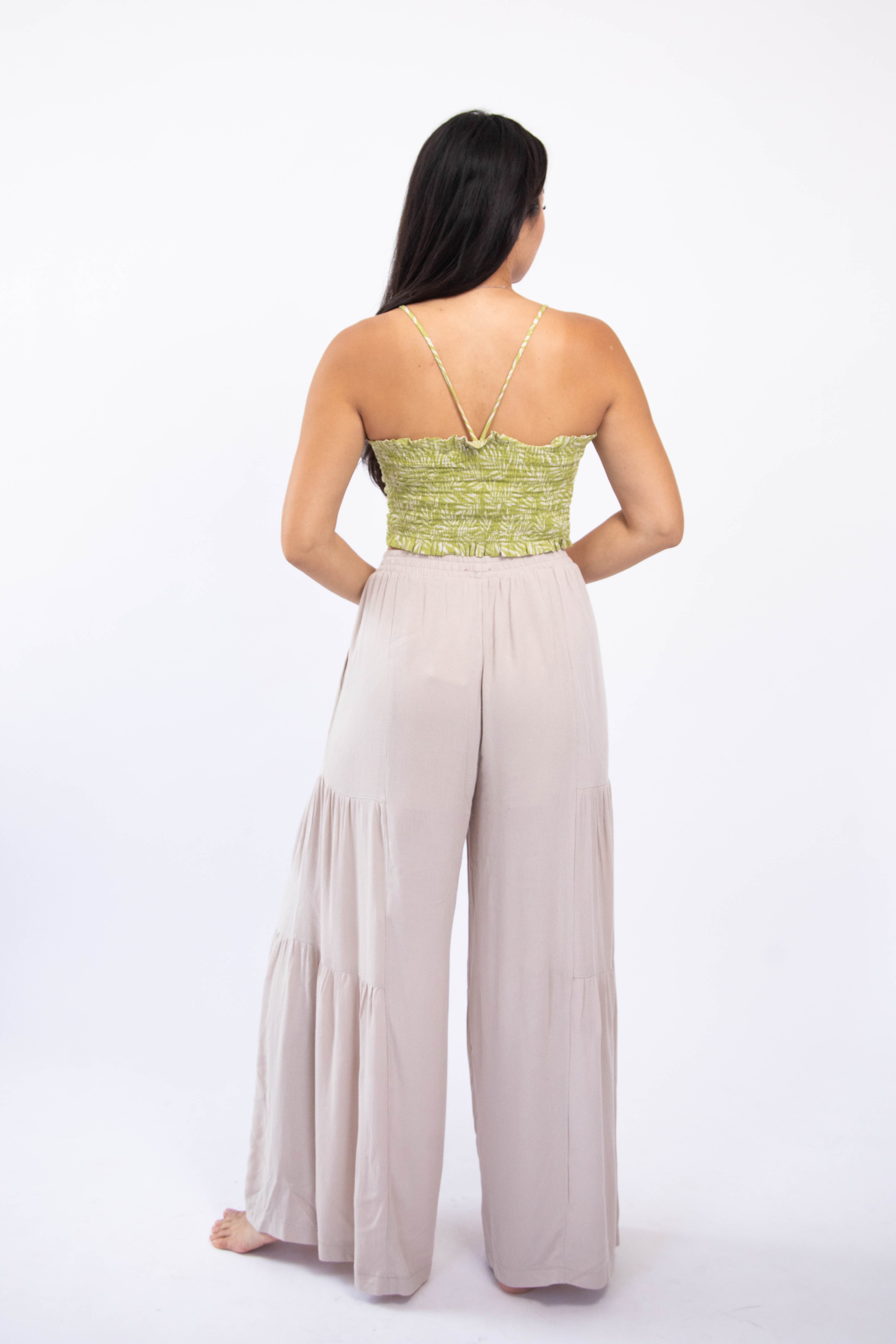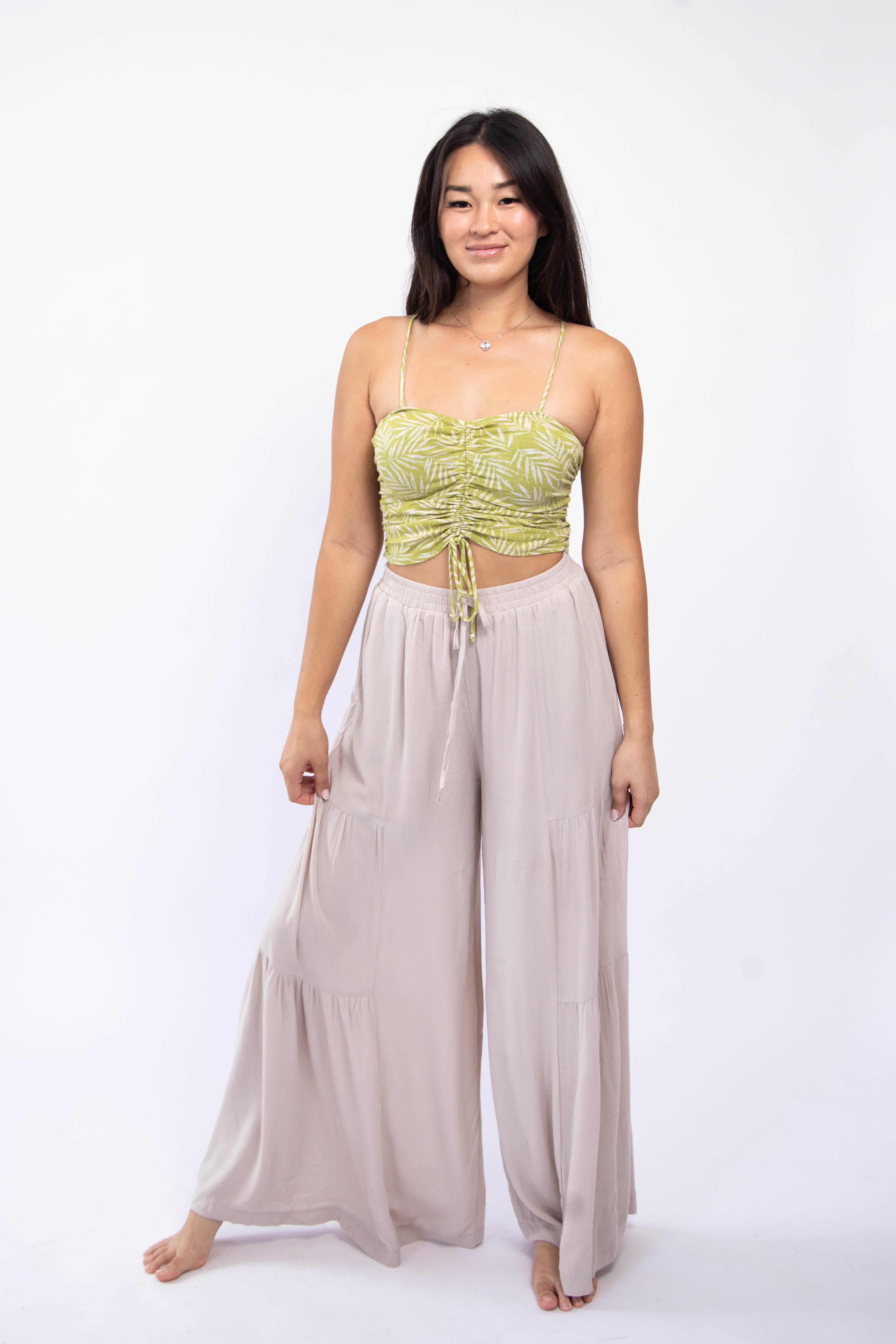 Lime green and cream colored palm leaf motif tank top with a ruched tie front, squared neckline, and smocked v-back.