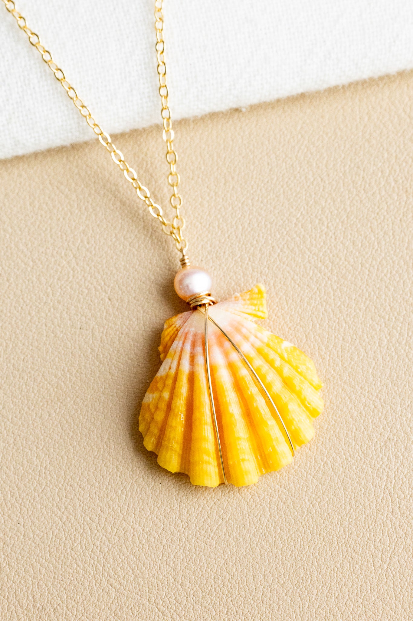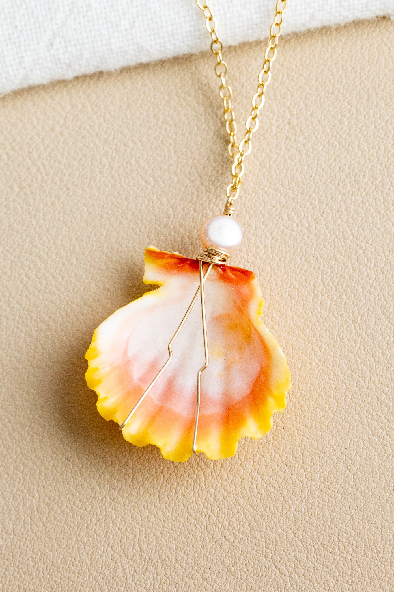 • 14k gold filled chain necklace with a 5mm x 6mm flat pink freshwater pearl above a 28mm large orange-pink-white Sunrise Shell