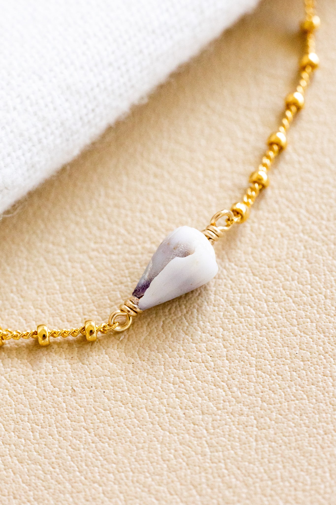 - 14k gold filled chain bracelet with a 8mm Dwarf Cone shell and 2.5mm x 3mm mini mauve pink freshwater pearls