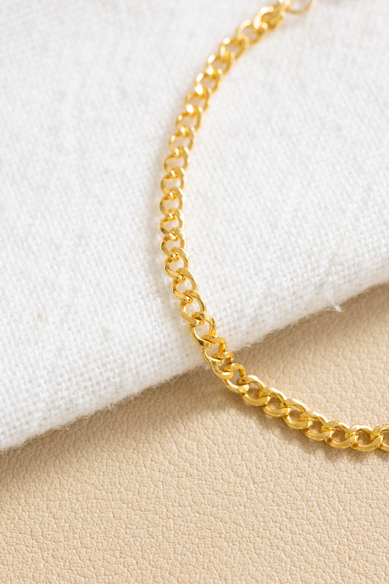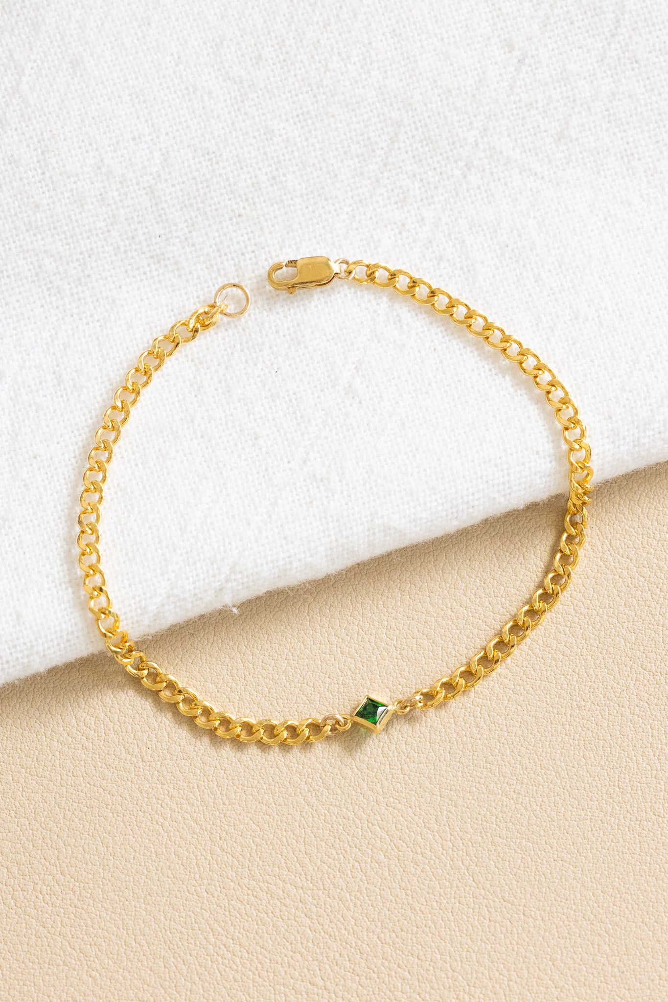 - 14k gold filled curb chain bracelet with a 3mm diamond-shaped green cubic zirconia charm
